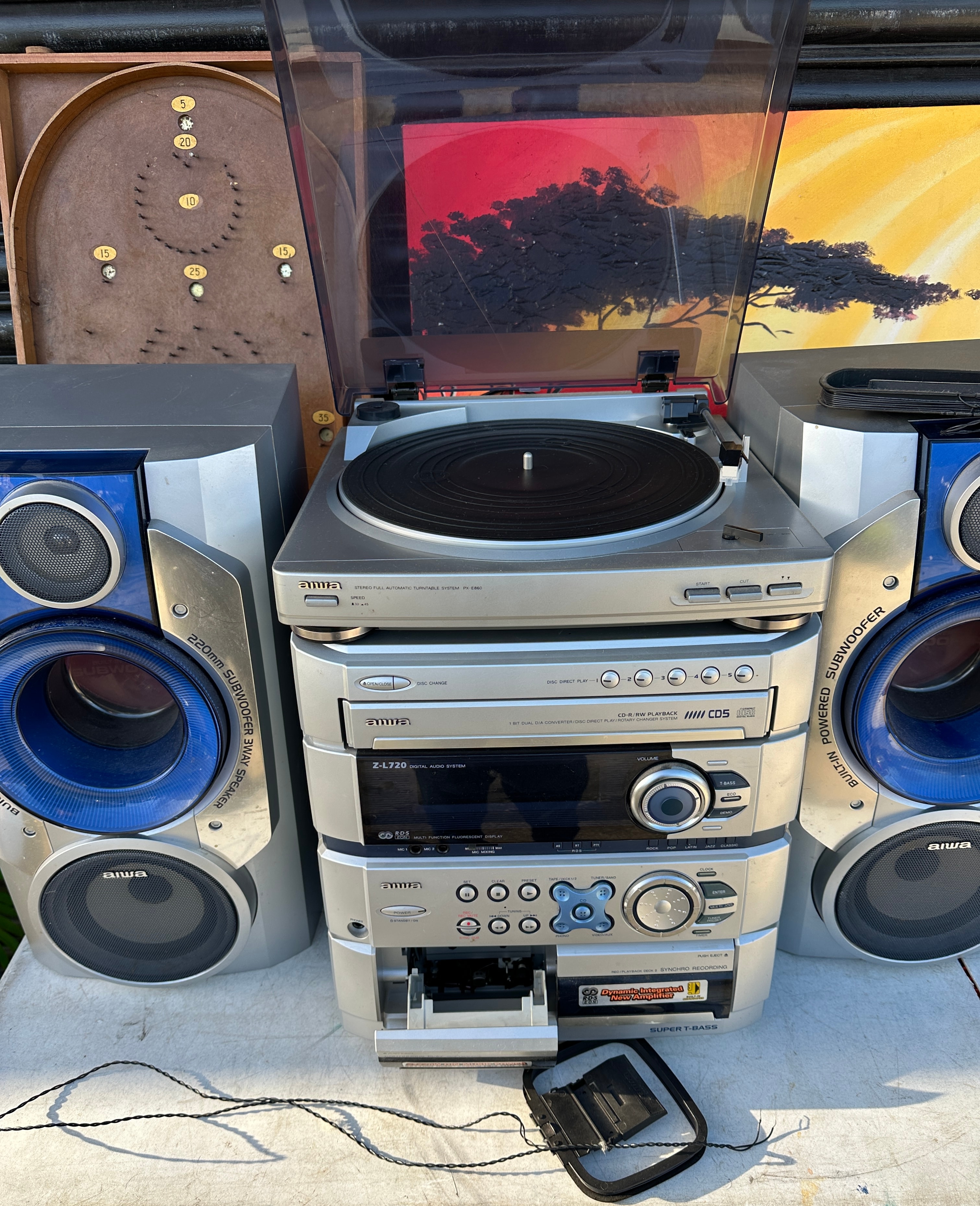An Aiwa Z-L720 Stereo System, dating from the late 1990s to early 2000s. This consumer-grade mini/midi hi-fi stereo system features a silver-toned plastic and metal construction with vibrant blue accents on the accompanying speakers. The central modular unit comprises an “ESPECIAL AUTOMATIC TURNTABLE SYSTEM” (model PX-E860), a digital audio receiver (model Z-L720) with “SUPER T-BASS” functionality, a multi-disc CD player with “CD-R/RW PLAYBACK” capabilities, and a dual cassette deck offering “SYNCHRO RECORDING” and “CONTINUOUS PLAY (MP3)”. The system is flanked by a pair of large, matching 3-way speakers. Each speaker is marked “BUILT-IN POWERED SUBWOOFER” with a “220MM SUBWOOFER” and rated for “2X 170W RMS” power.