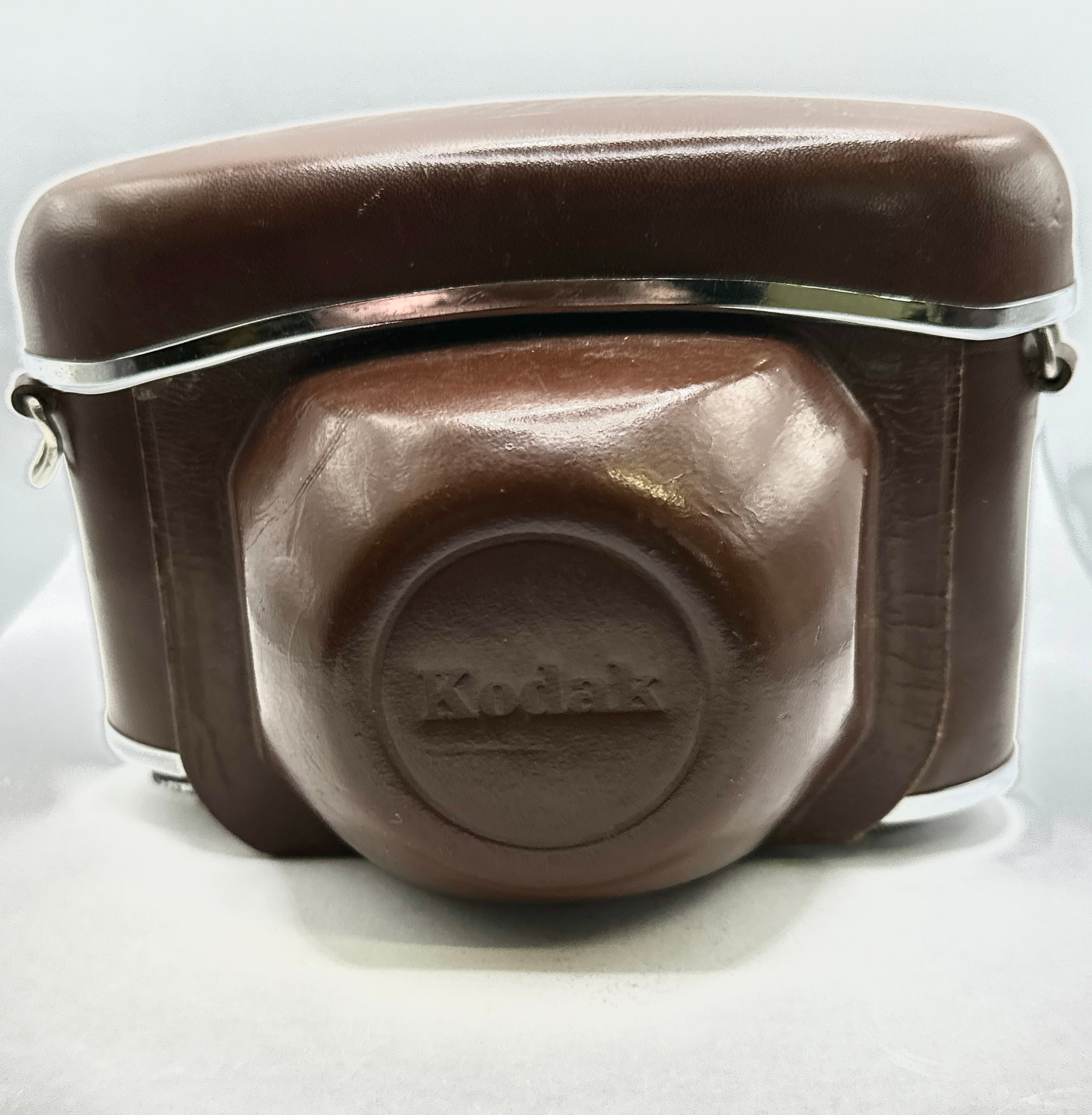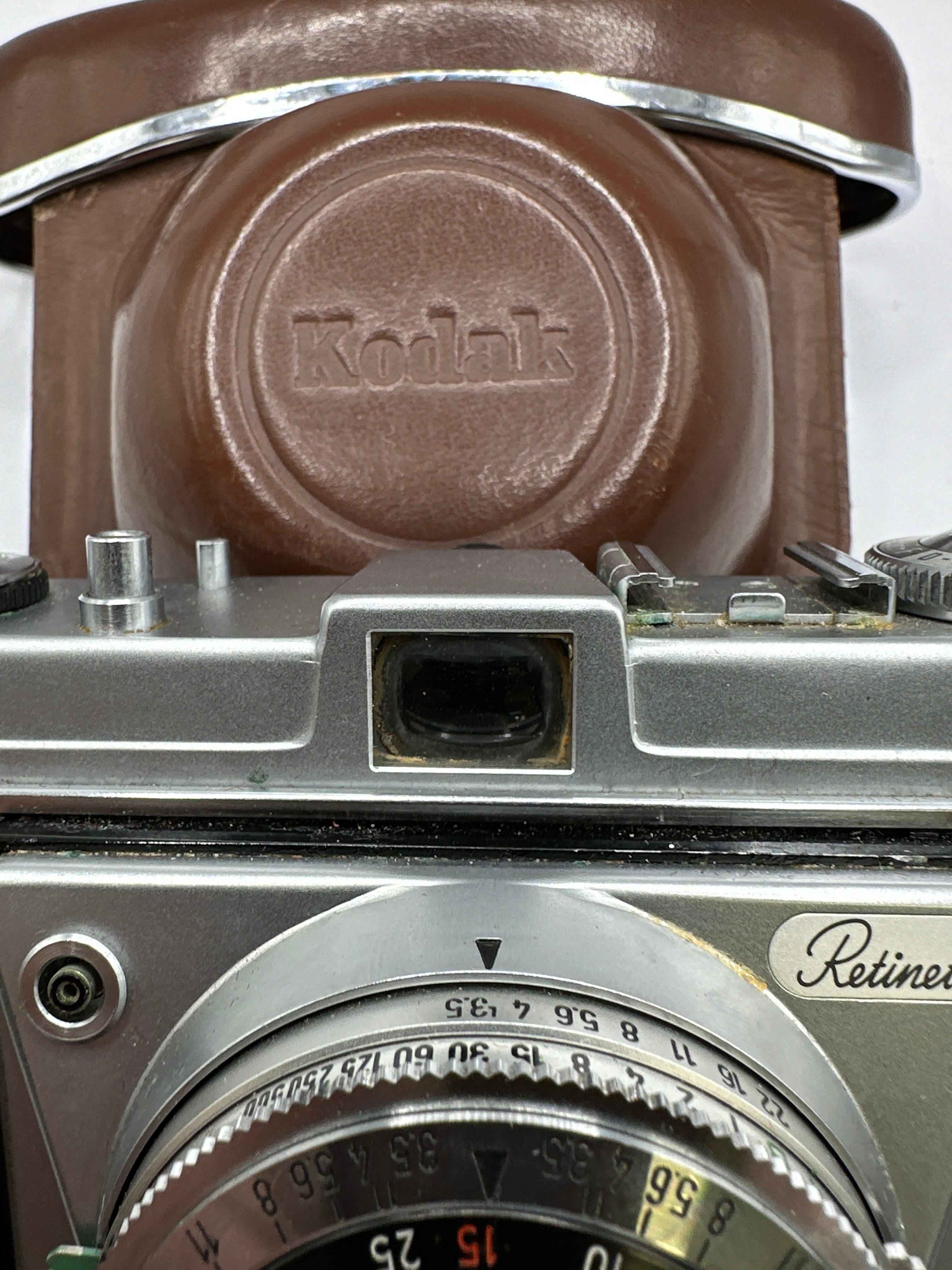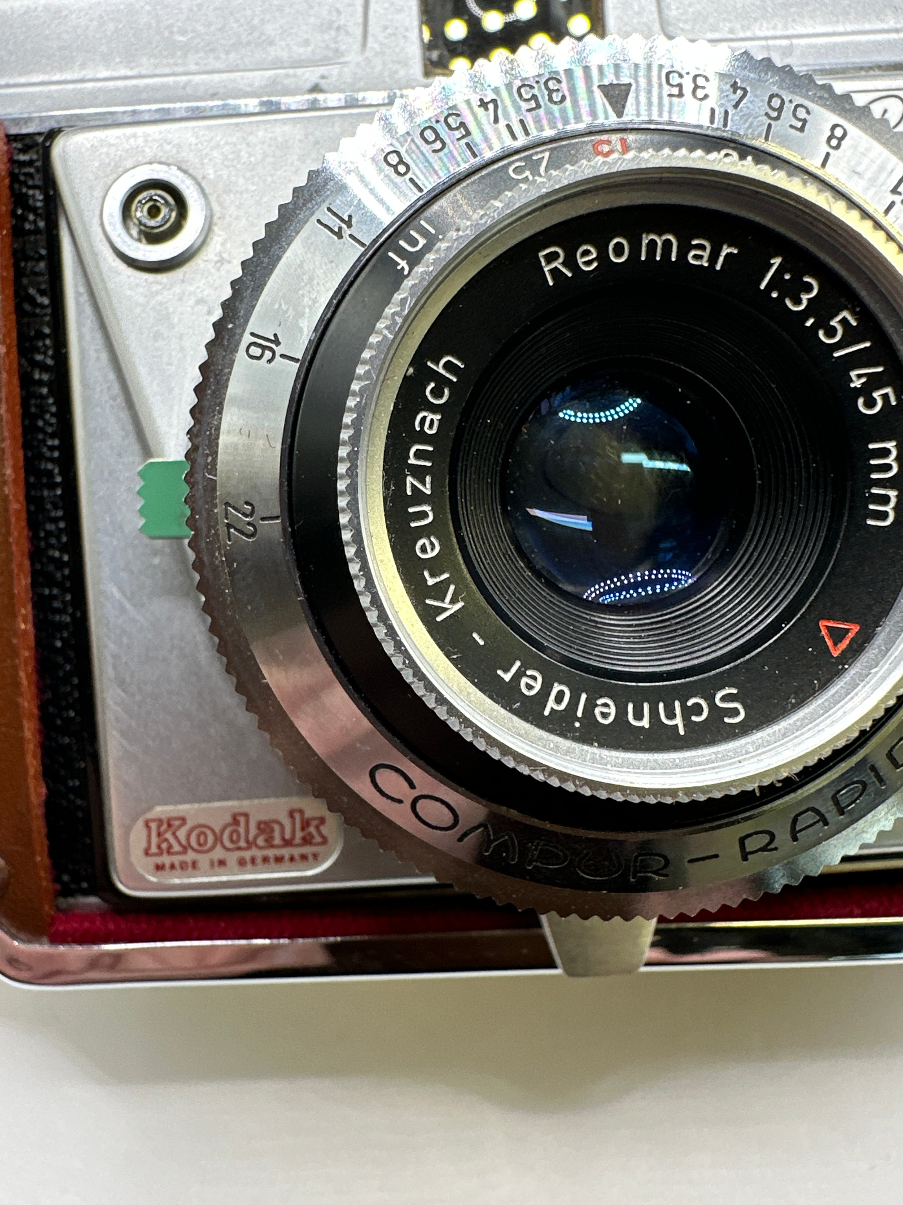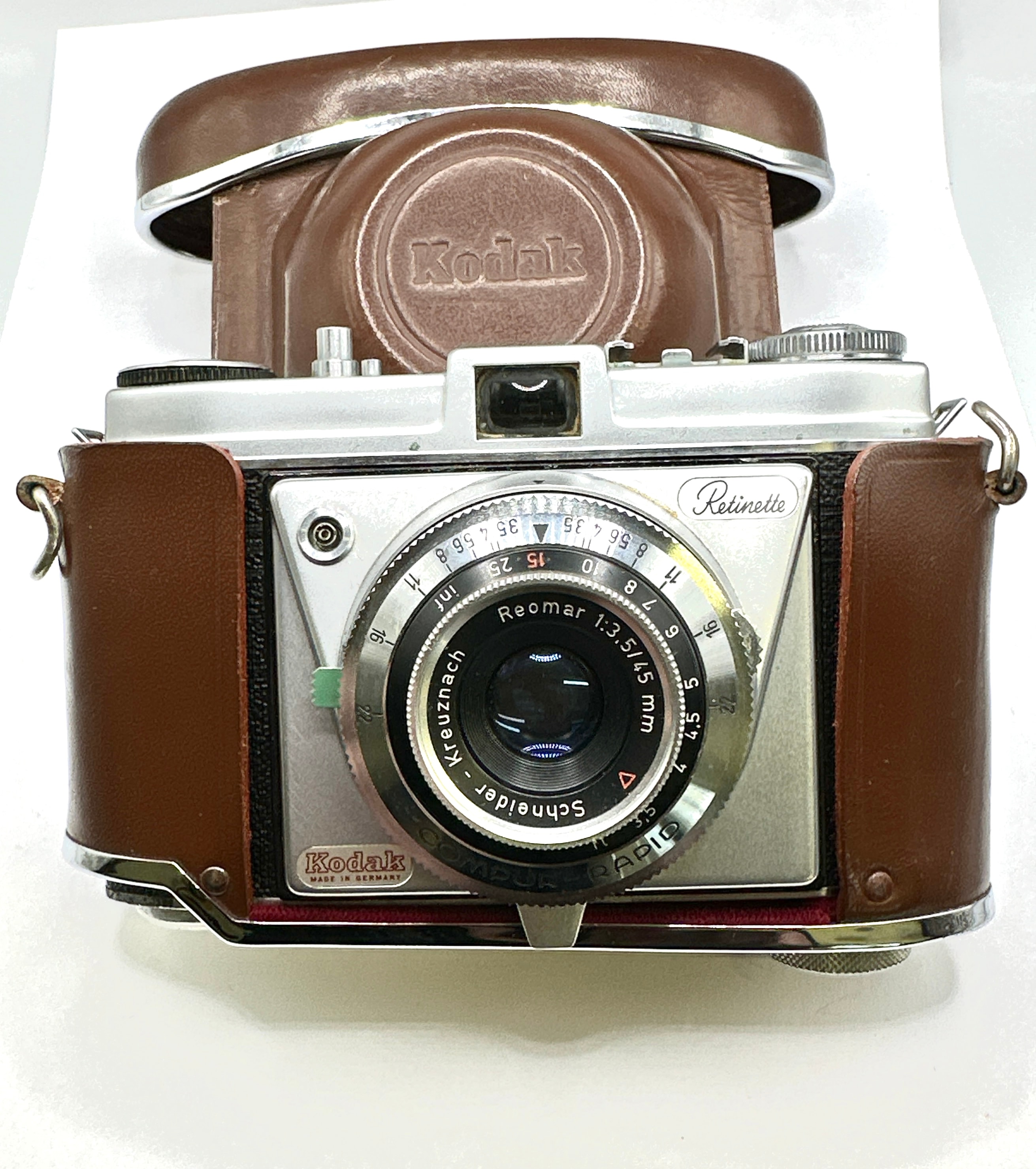 A vintage Kodak Retinette camera, featuring a silver-tone metal body with a brown leatherette covering. The camera is equipped with a Reomar 1:3,5/45 mm lens manufactured by Schneider Kreuznach and a COMPUR-RAPID shutter. “MADE IN GERMANY” is visible on the front. It is accompanied by its matching brown leather fitted case, both embossed with “Kodak.”