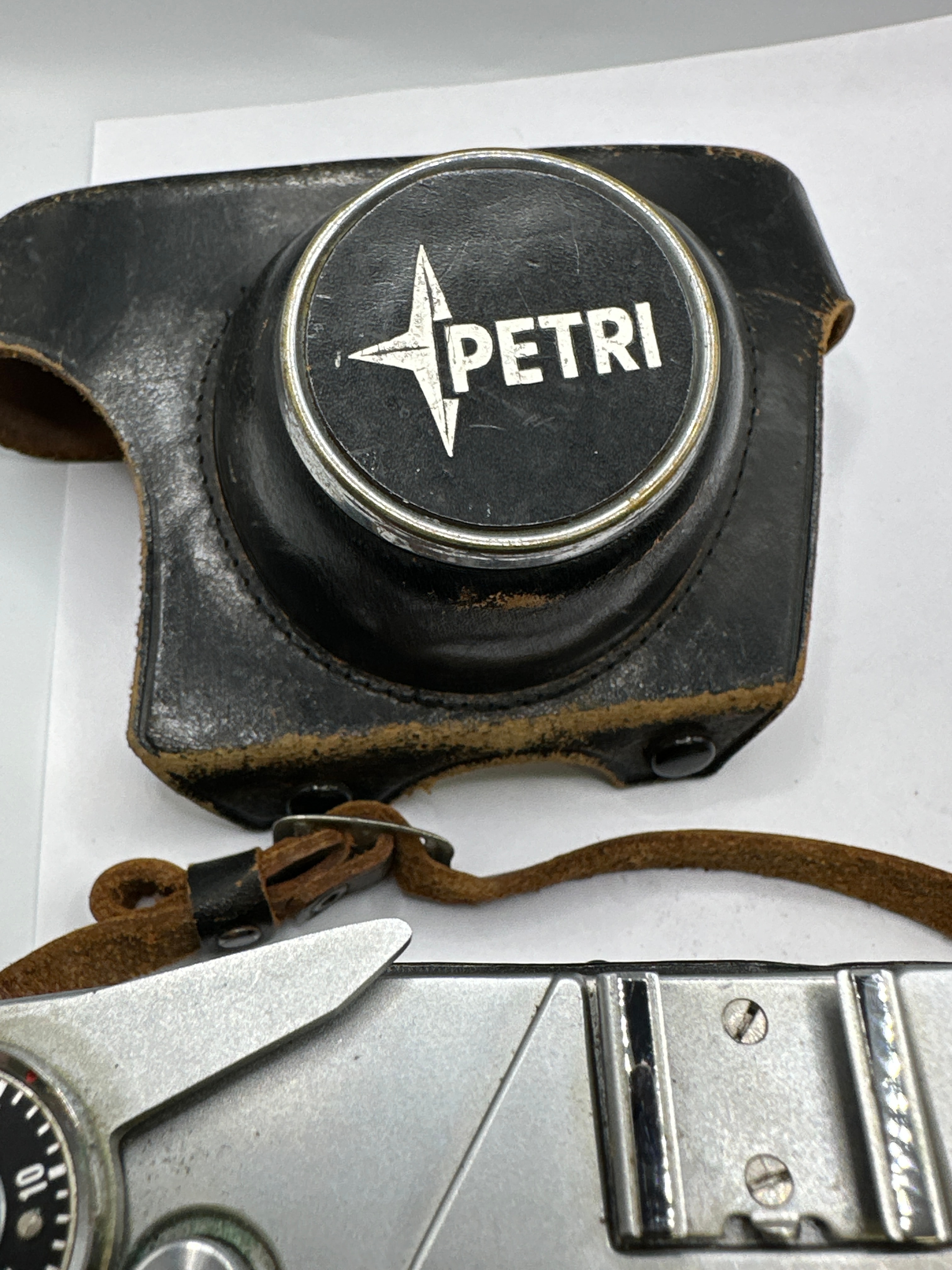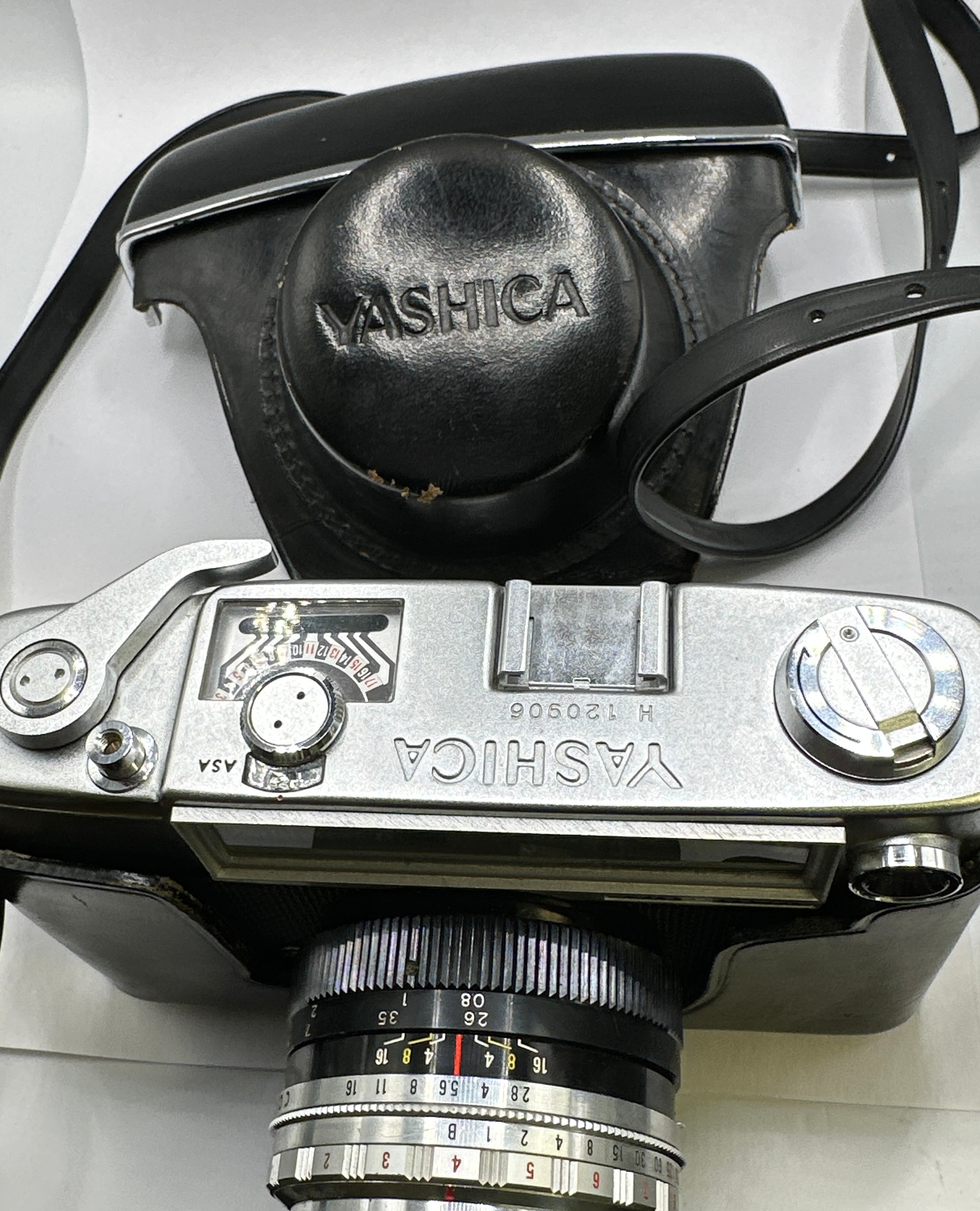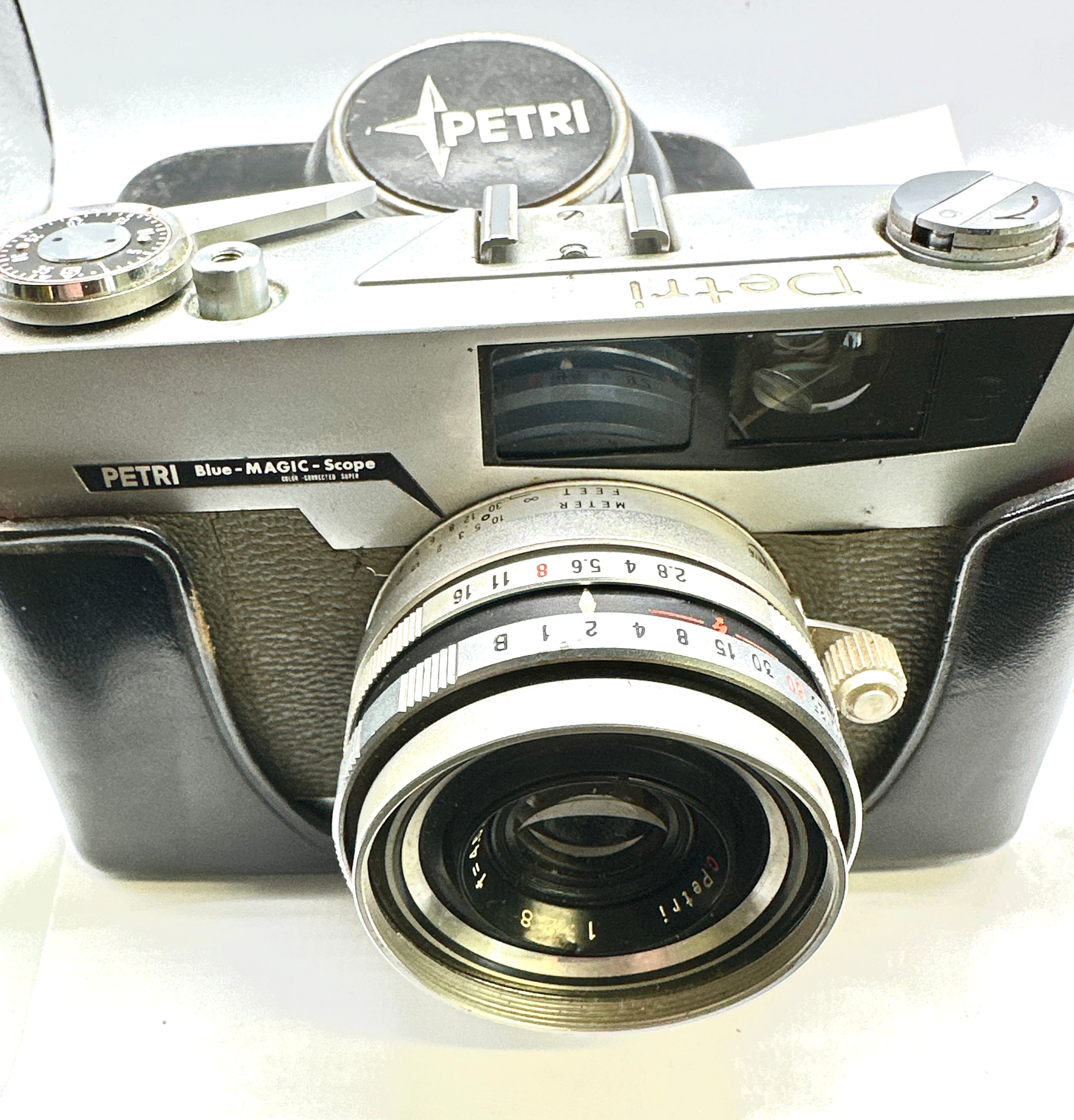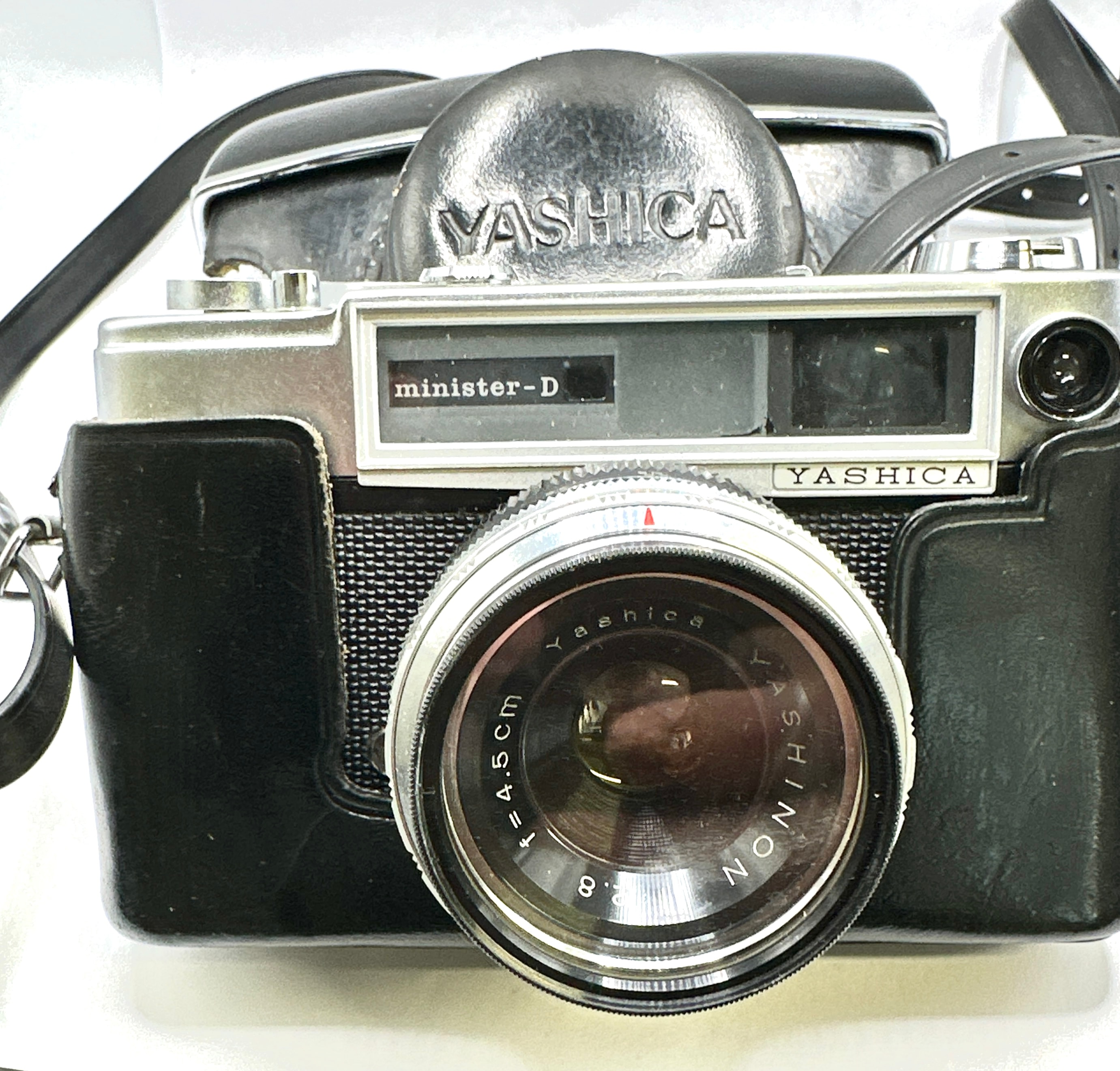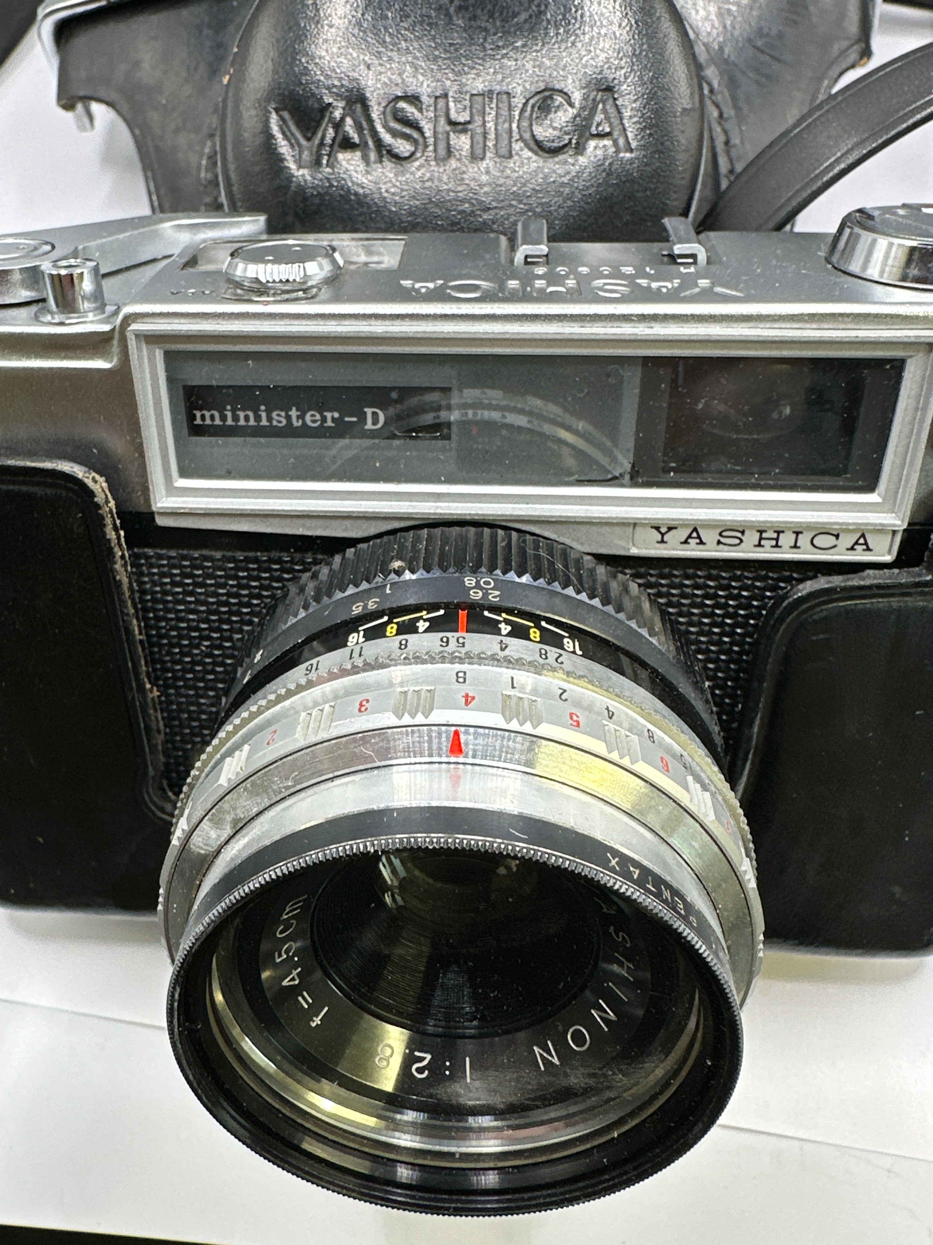 This lot comprises two vintage rangefinder-style cameras, each accompanied by a worn black leather half-case. The first camera is a silver-toned Petri 7 Blue Magic Scope 35mm camera, identified by “PETRI Blue-MAGIC-Scope” and “COLOR CORRECTED LENS,” fitted with a “Petri f=4.5cm 1:2.8” lens. Its black leather half-case features a “PETRI” logo on the removable lens cap. The second camera is a silver-toned Yashica Minister-D, equipped with a “YASHINON f=4.5cm 1:2.8” lens and “ASA” markings. The top plate of the Yashica bears the serial number “H 120906.” Its black leather case is embossed with “YASHICA.”