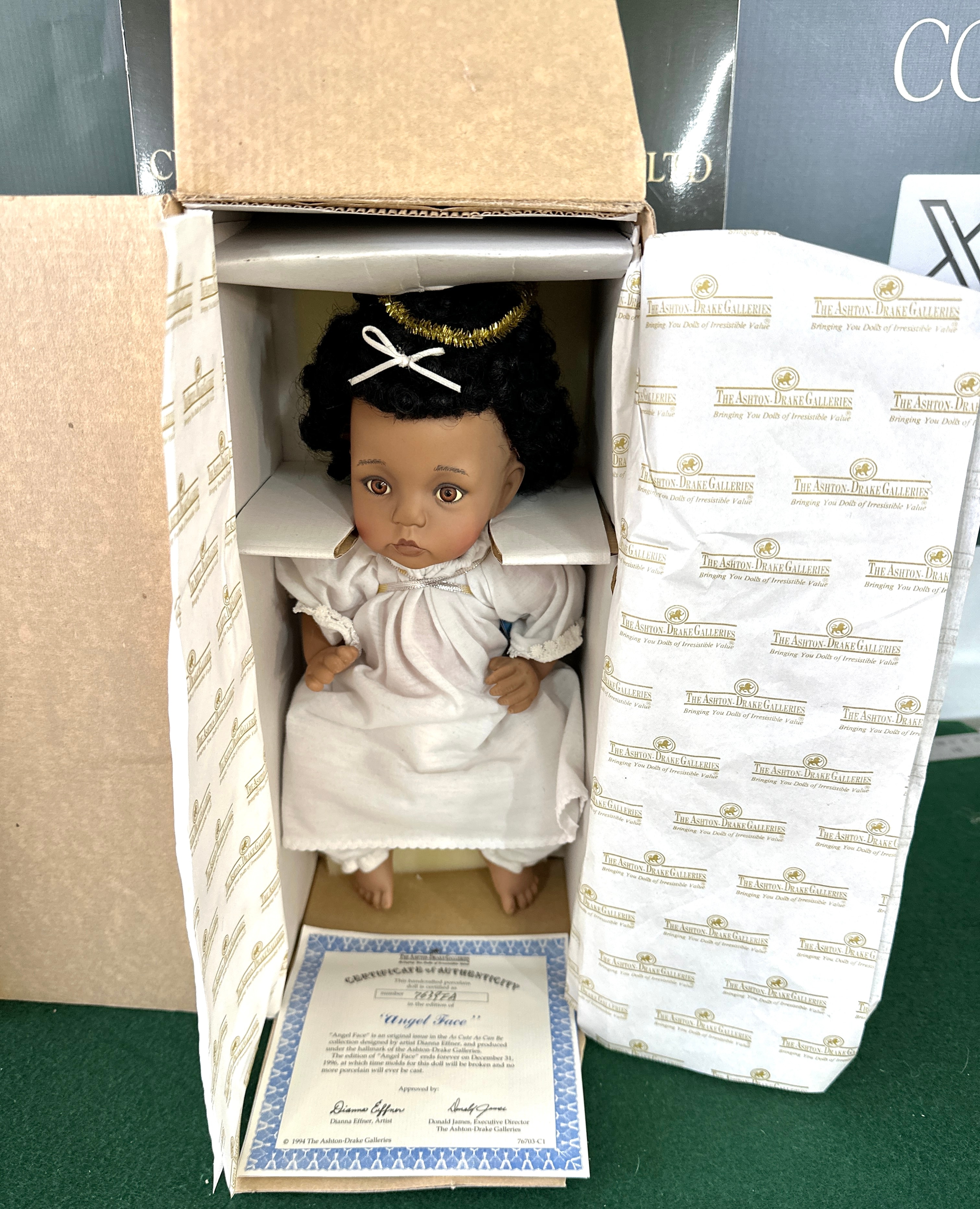 An Ashton-Drake Galleries ‘Angel Face’ porcelain collector doll, designed by artist Dianna Effner. This handcrafted porcelain doll is identified by its Certificate of Authenticity, dated © 1994, as edition number 7635FA. The certificate, signed by Dianna Effner and Executive Director Donald James, notes that the production mold for this doll was to be broken on December 31, 1996, indicating a limited edition. The doll depicts a young child with dark curly hair and is dressed in a white, smocked garment with ruffled cuffs, adorned with a simple golden halo and a white bow. It is presented in its original corrugated cardboard box with branded tissue paper.