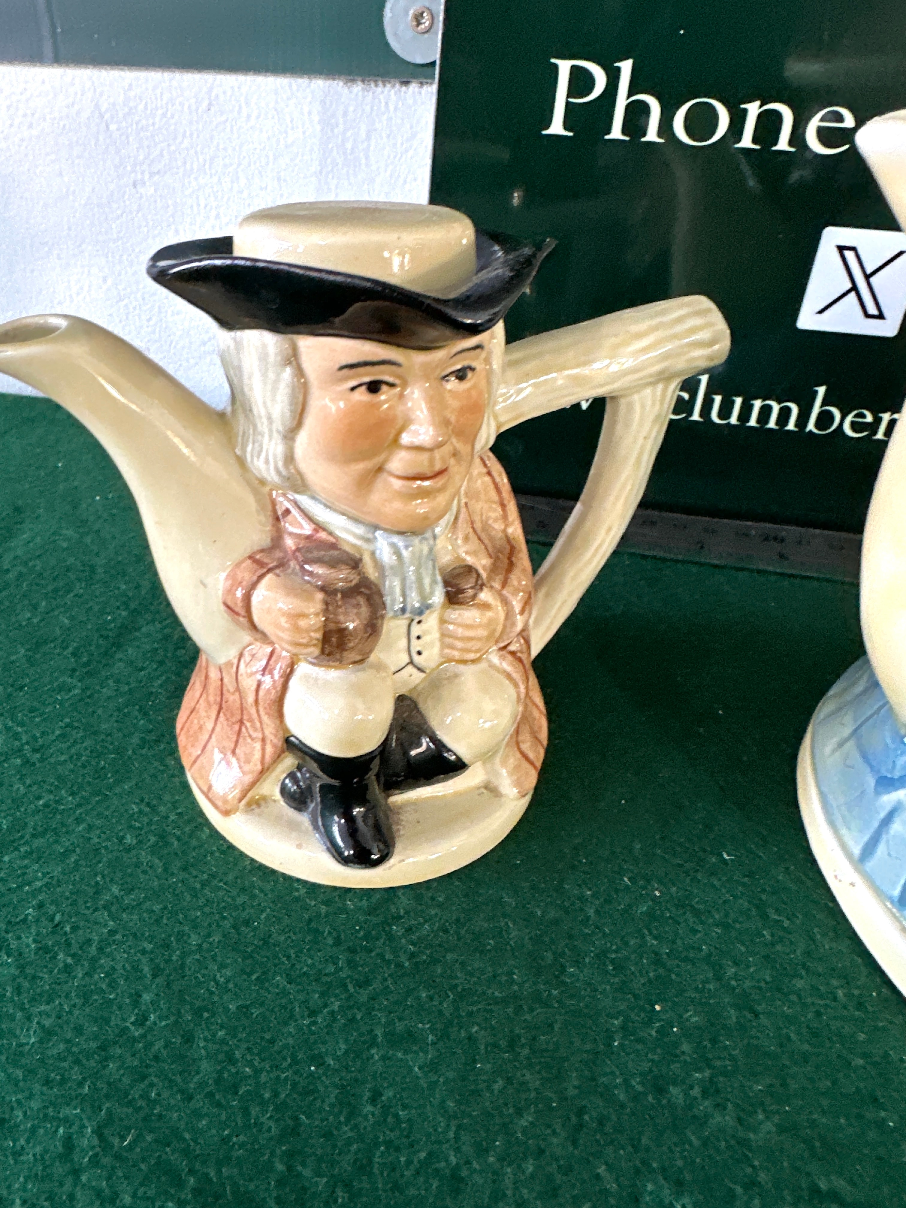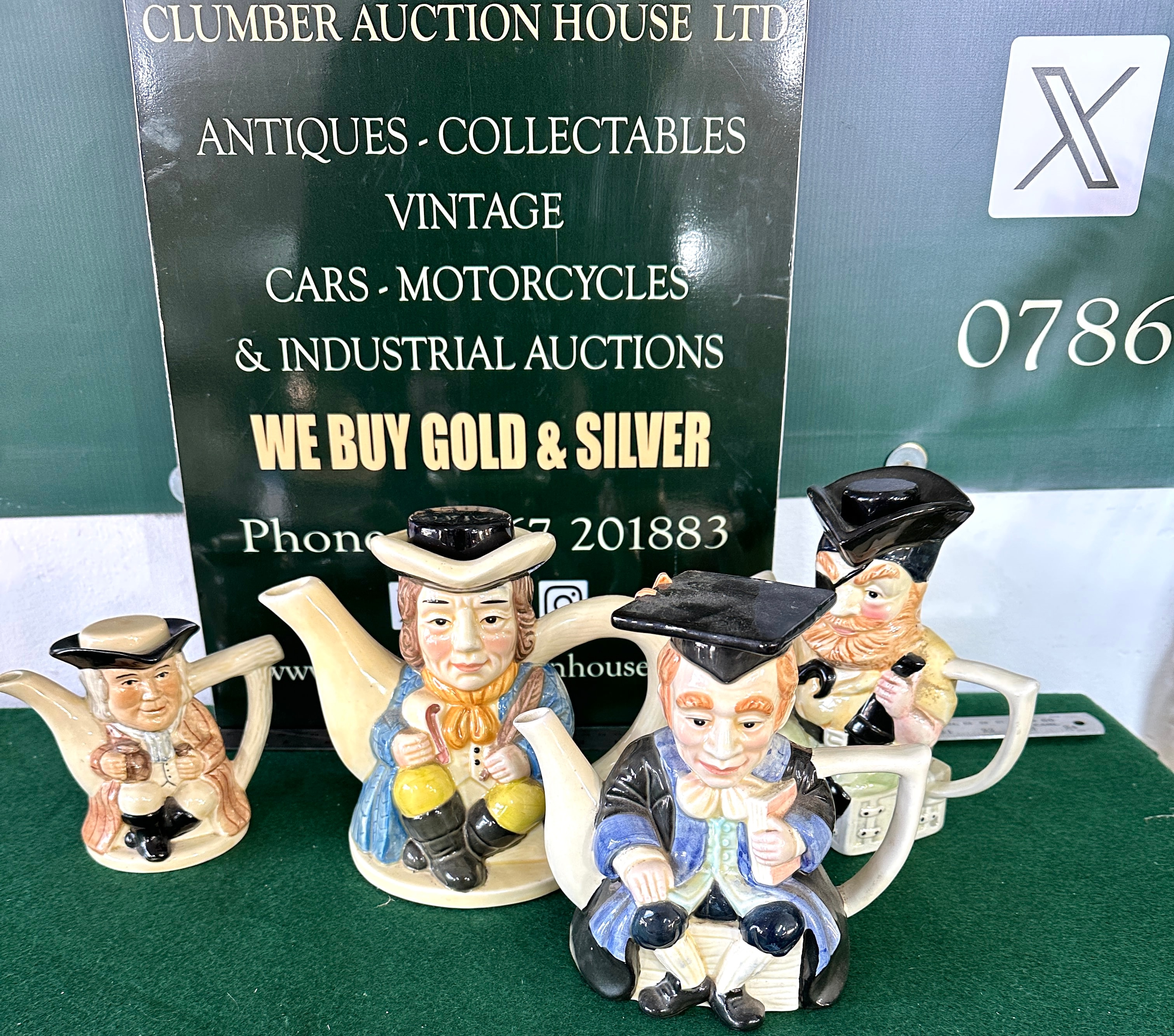 A group of four polychrome-decorated glazed ceramic novelty teapots by Tony Wood Studio Staffordshire. Each teapot is molded as a seated male character in period-style dress. The figures include a scholar in a cap and gown holding a book, a gentleman in a tricorn hat with a quill, and two other gentlemen in similar hats holding various objects such as a flask or a stick. The teapots feature a cream-colored body with hand-painted details in shades of blue, brown, yellow, and black. No visible maker’s marks or text are discernible on the items.