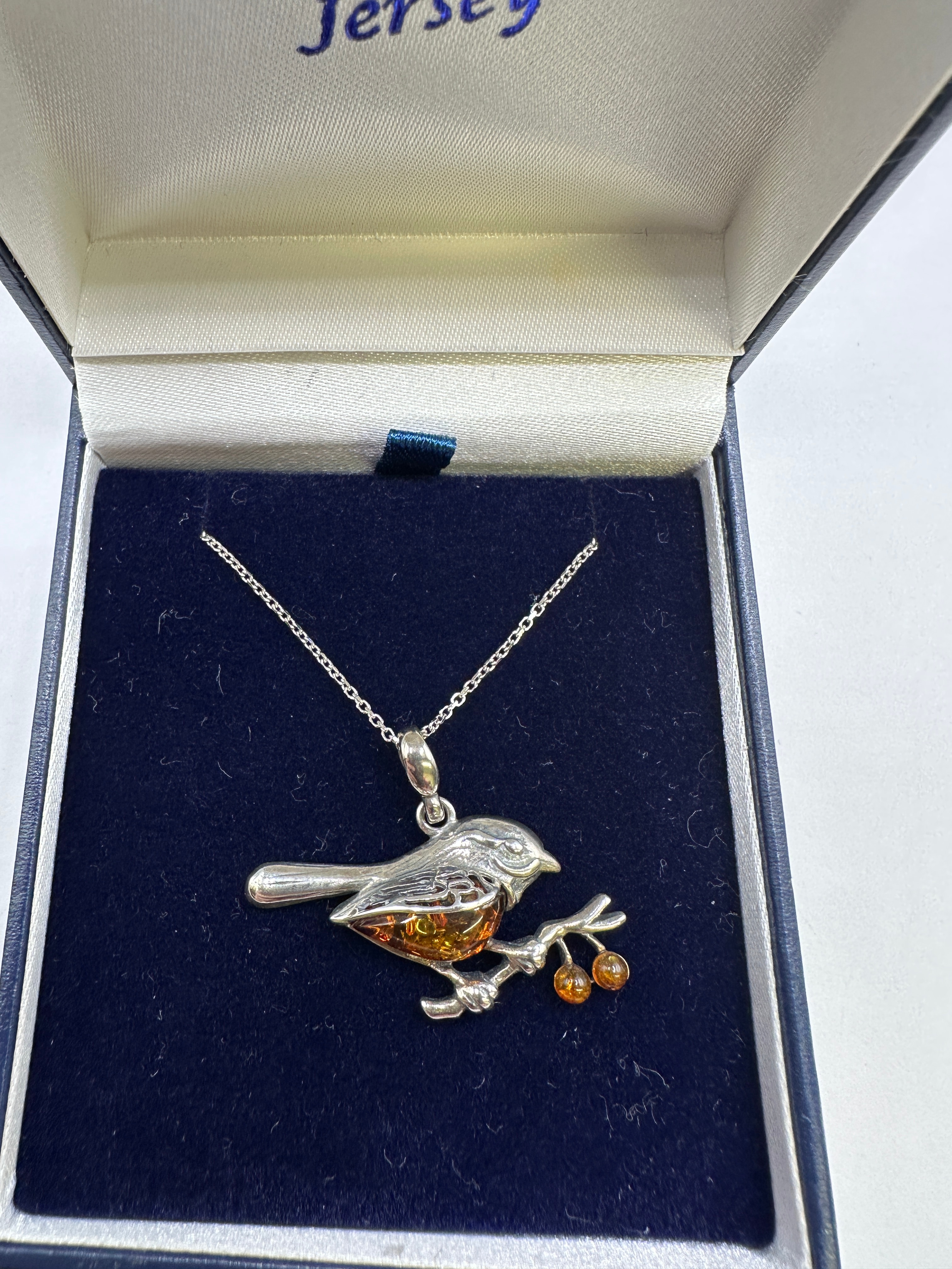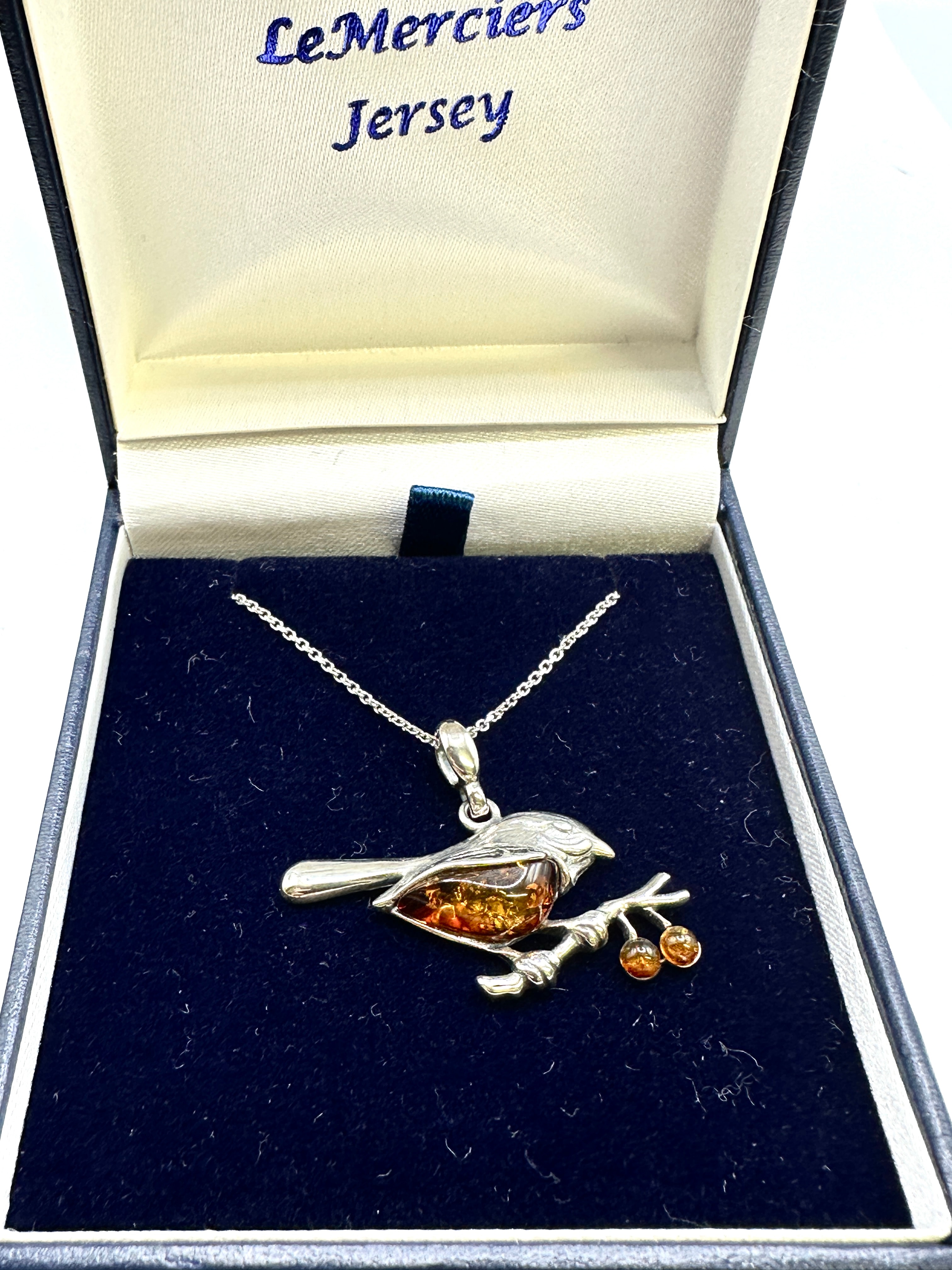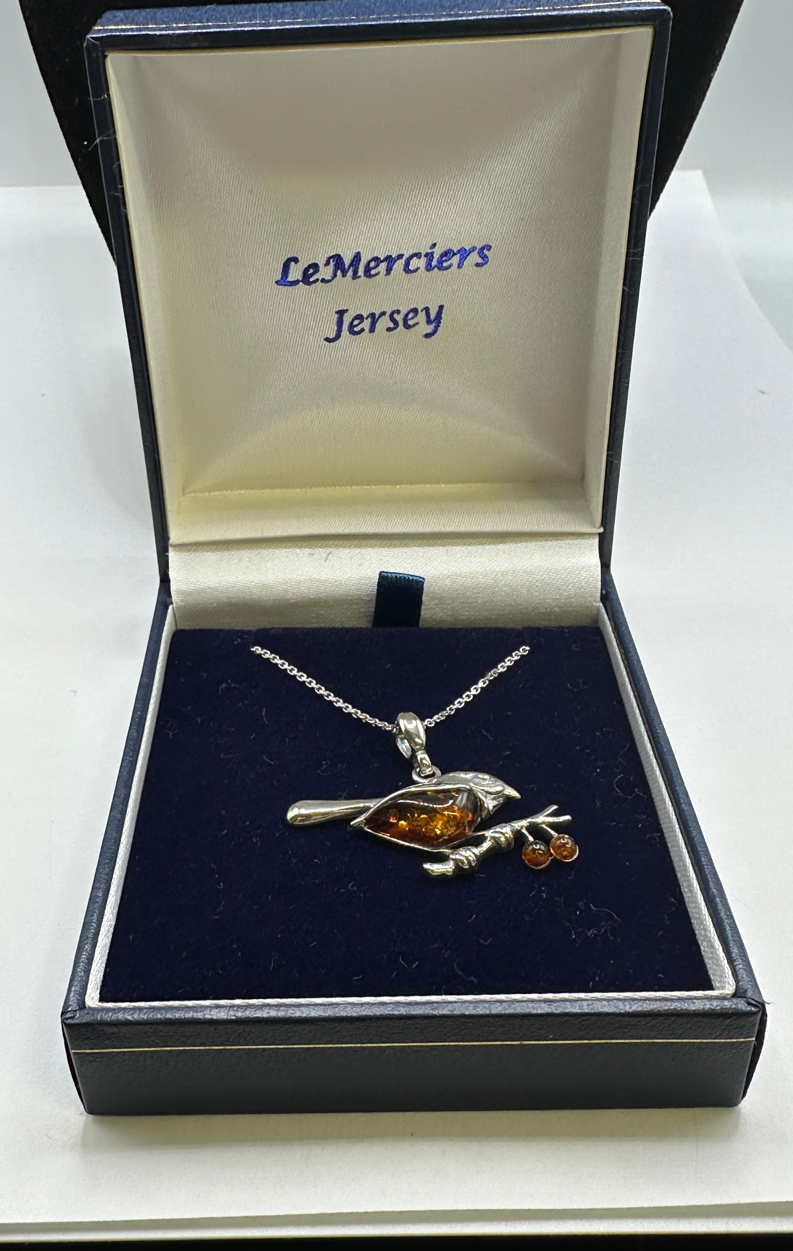 A modern sterling silver and Baltic amber pendant necklace. The pendant is designed as a stylized robin bird perched on a branch. The bird’s body and two berries on the branch are inlaid with translucent, textured Baltic amber. It is suspended from a delicate sterling silver chain. The necklace is presented in its original dark blue, velvet-lined hinged jewelry box, the interior lid of which is cream-colored satin, prominently displaying the blue script text “LeMerciers Jersey”.