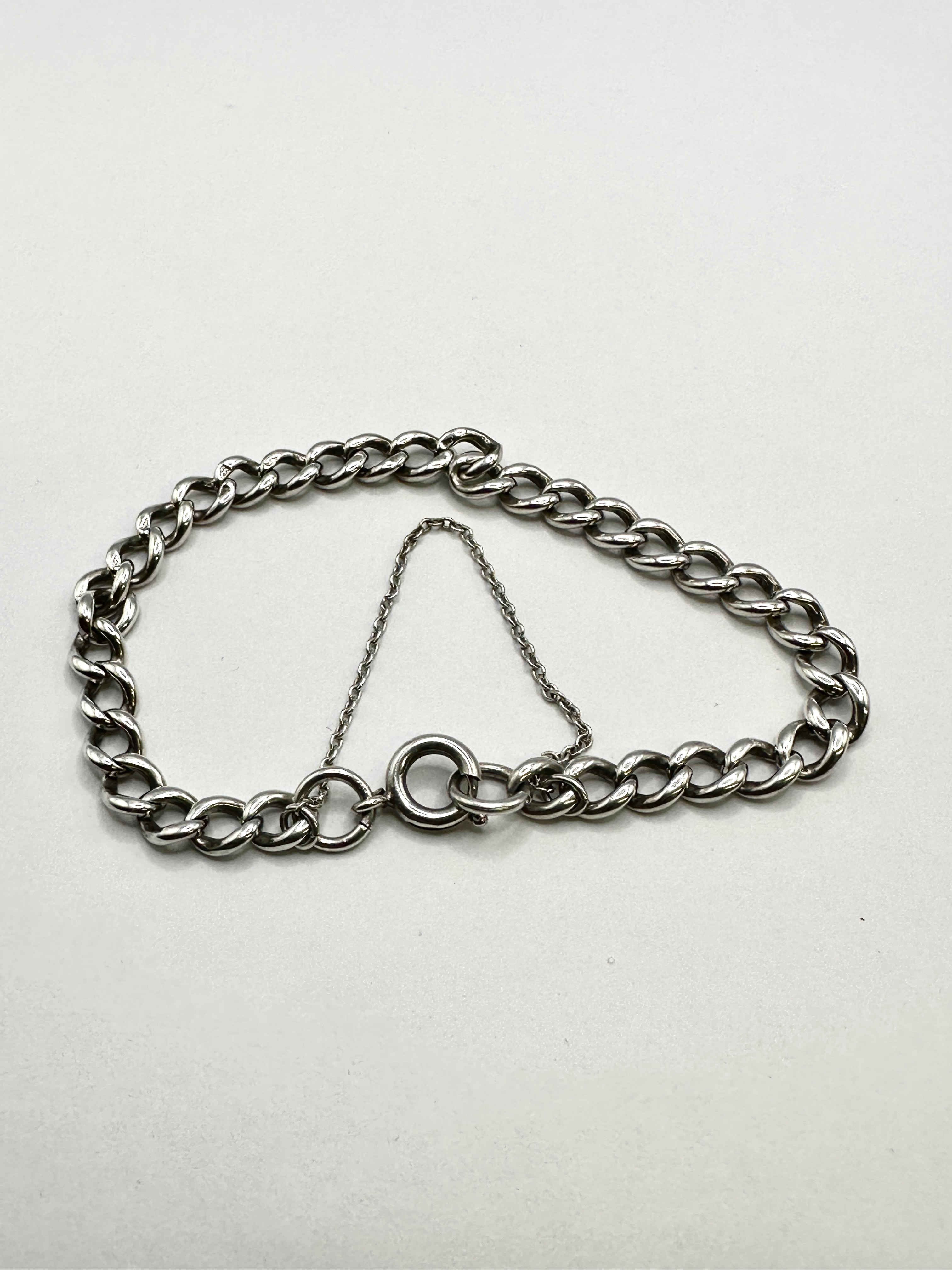 A sterling silver chain bracelet by James Avery, featuring a classic double curb link design. The bracelet is secured by a spring ring clasp, which is clearly marked “STERLING,” and includes an attached safety chain.