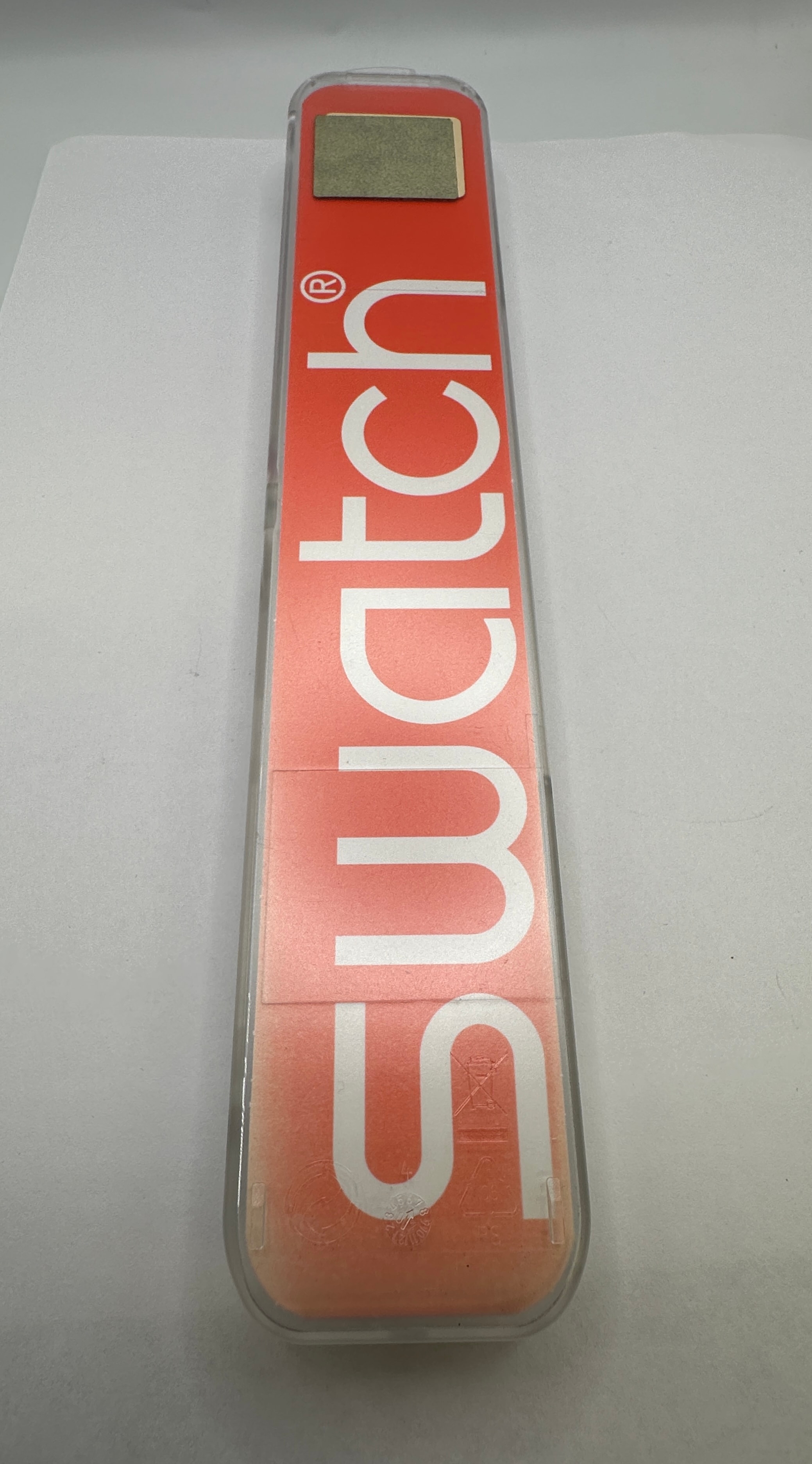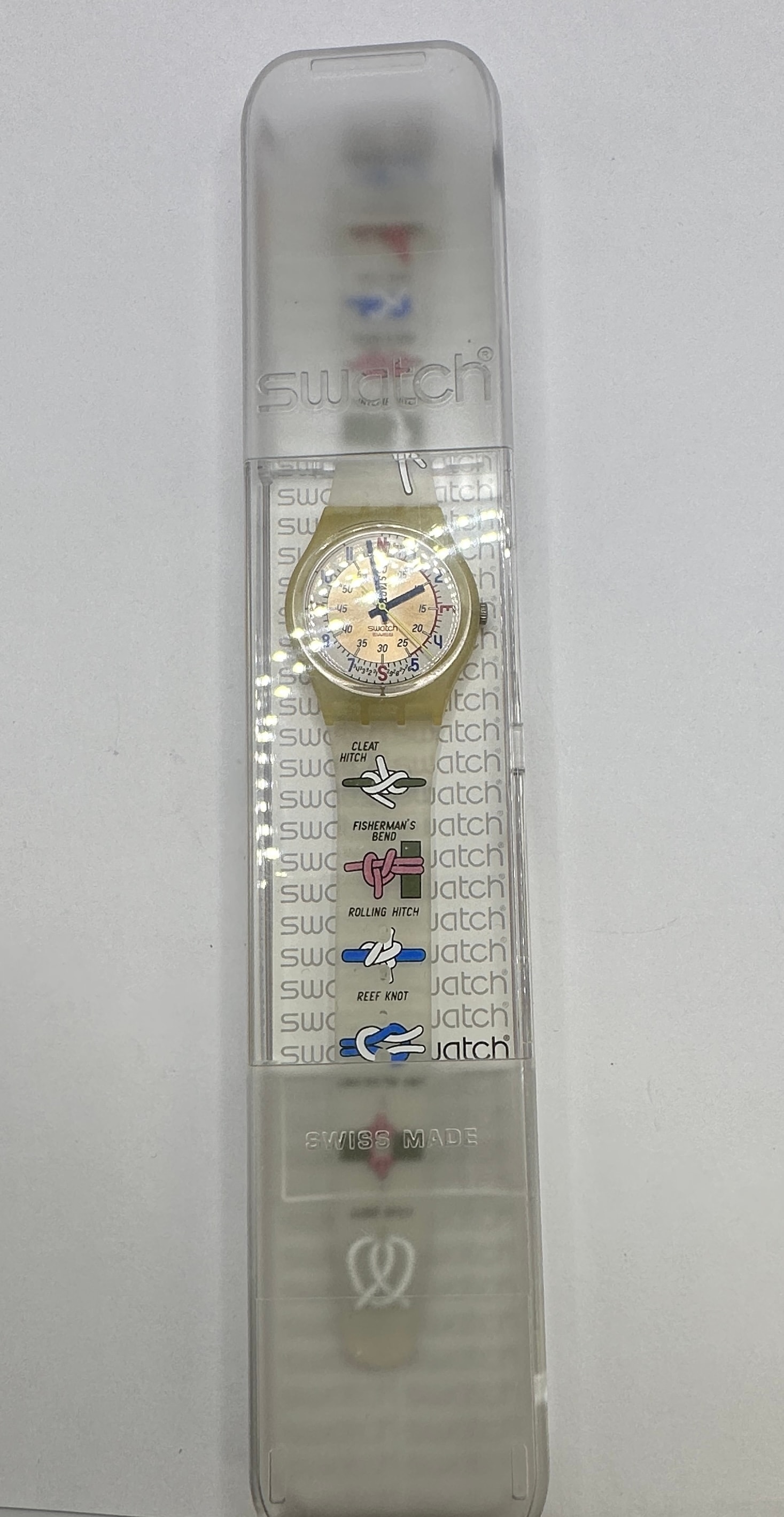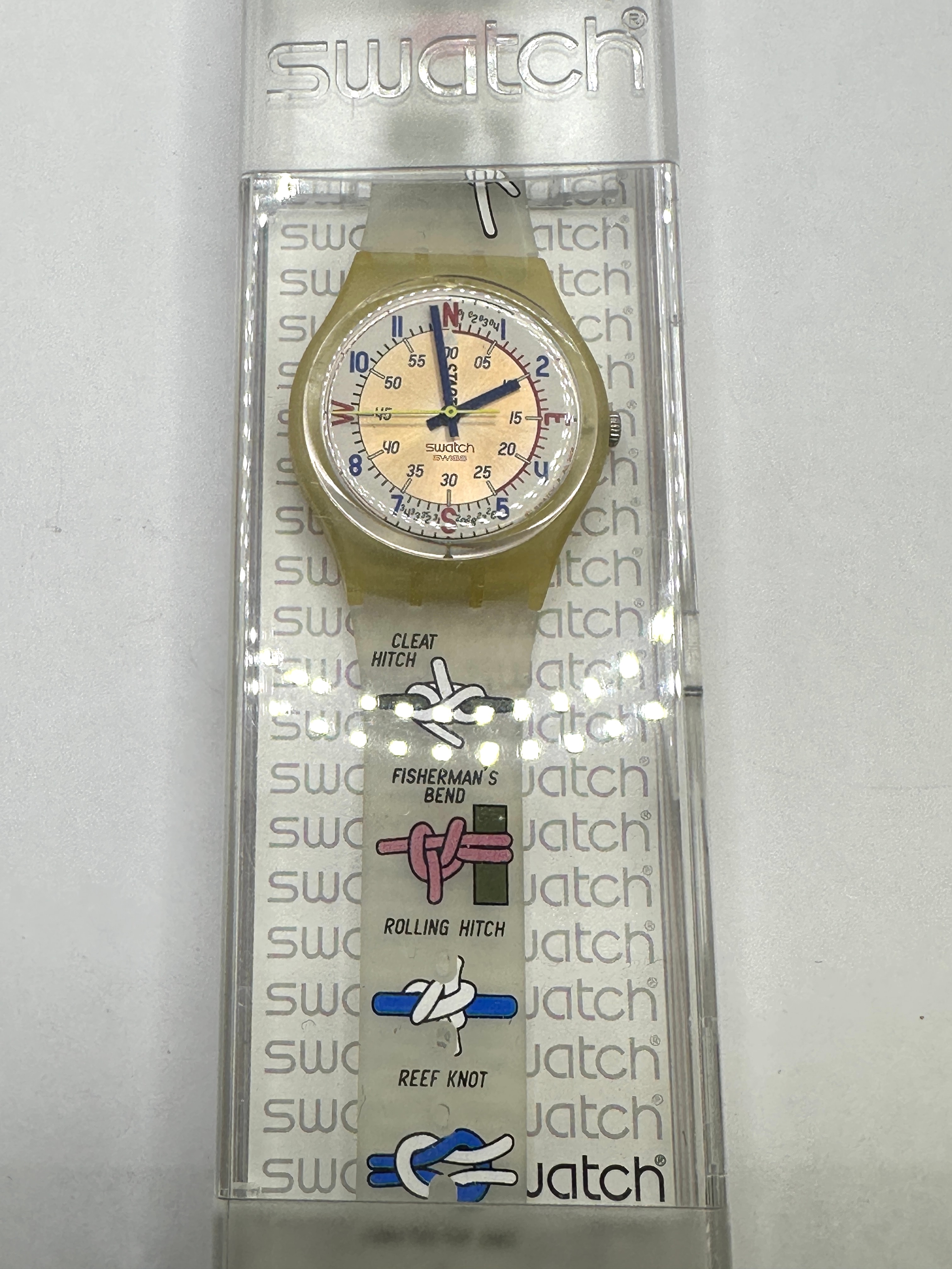 A Swatch GZ150 Atlanta 1996 Olympic Team Watch. This new and unworn wristwatch is presented within its original clear plastic display case. The watch features a translucent light yellow-gold plastic case and strap. The light-colored dial displays multiple numerical scales (e.g., 0-60, 0-55) and a central design resembling a compass rose, bearing ‘SWATCH SWISS’ text. The accompanying packaging prominently displays the ‘SWATCH®’ logo, ‘SWISS MADE,’ and illustrates nautical knots, including ‘CLEAT HITCH,’ ‘FISHERMAN’S BEND,’ ‘ROLLING HITCH,’ and ‘REEF KNOT,’ each labeled in English.