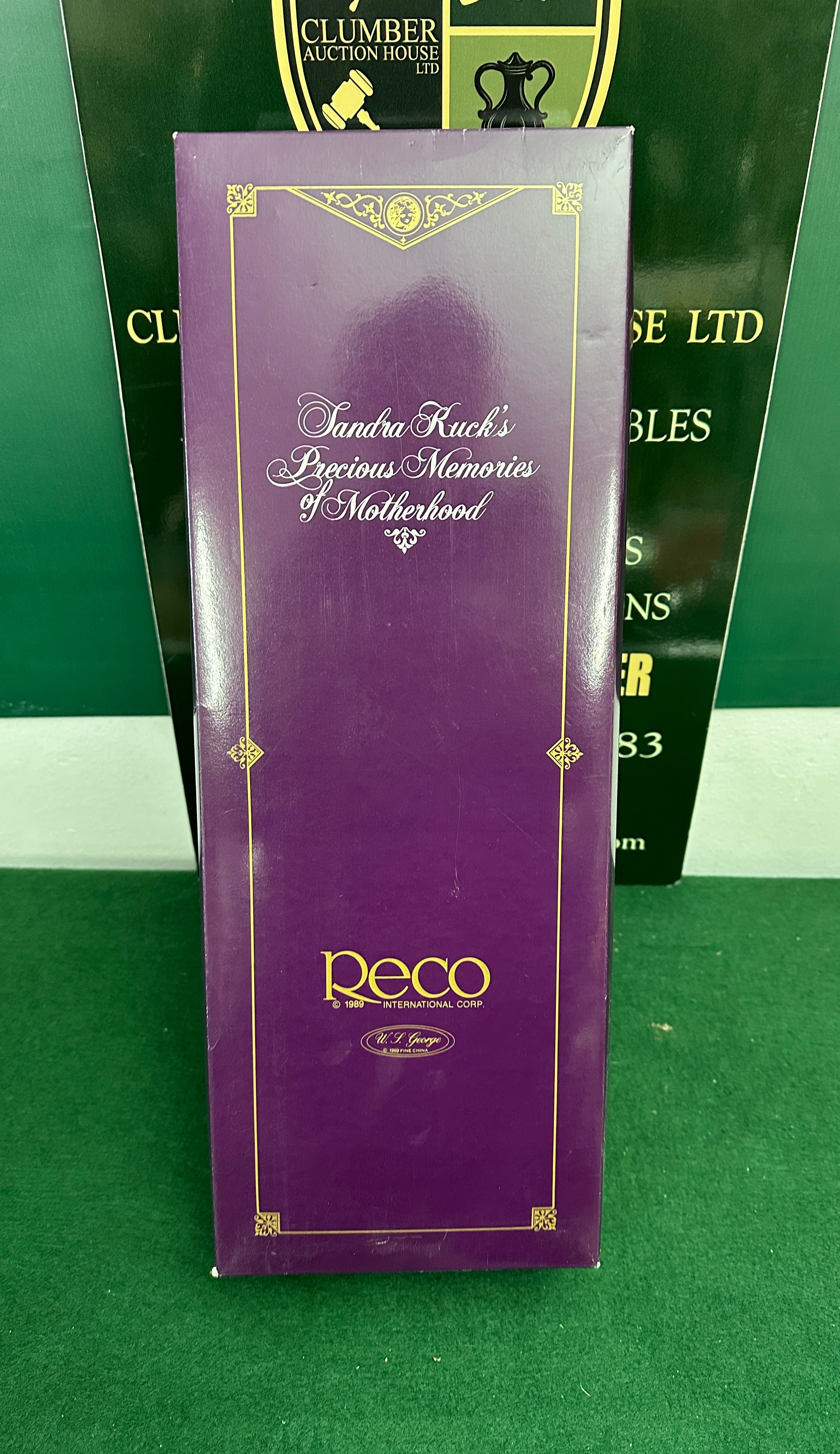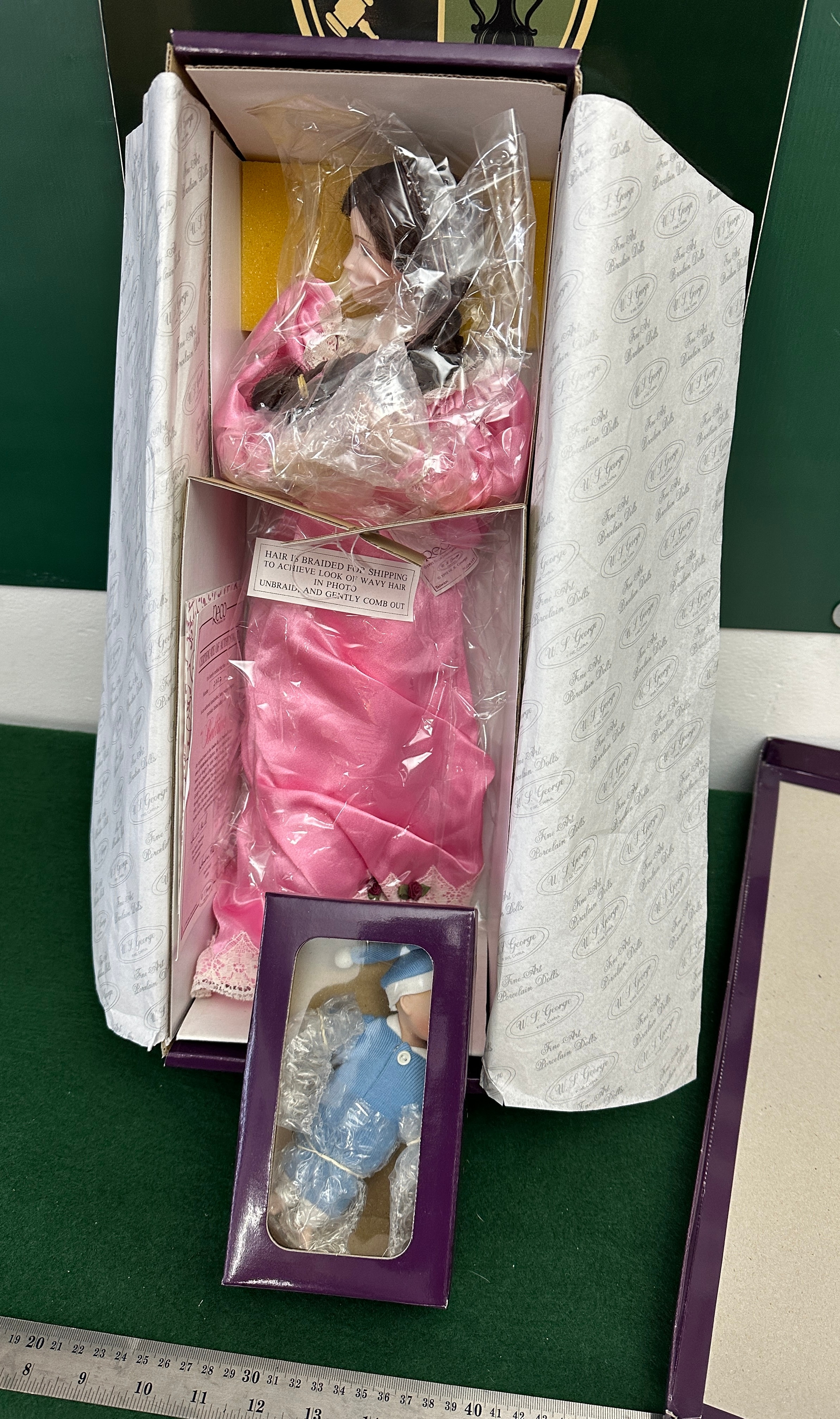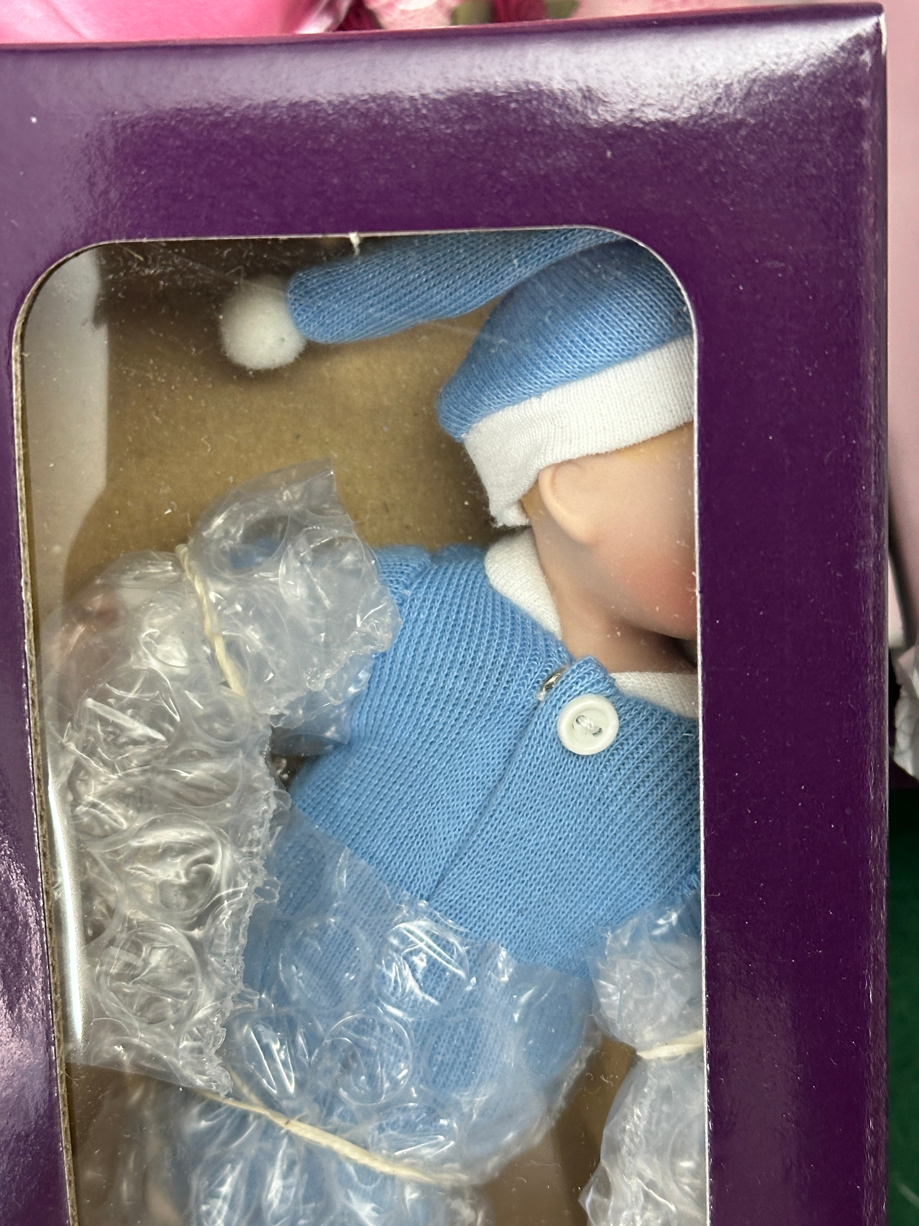 A pair of contemporary collector’s dolls from the “Sandra Kuck’s Precious Memories of Motherhood” collection, manufactured by Peco International Corp in 1989. The primary doll, depicting a mother figure, features a porcelain or bisque head with painted facial details and dark braided hair, dressed in a pink satin-like gown with white lace trim. It is securely housed within its original white and purple cardboard box, protected by plastic wrapping, with an internal care instruction noting, “HAIR IS BRAIDED FOR SHIPPING TO ACHIEVE LOOK AS SHOWN UNBRAID… AND GENTLY COMB OUT.” A smaller accompanying baby doll, also with an apparent porcelain or bisque head, is separately packaged in its original smaller purple window box, dressed in a blue knitted outfit with a matching hat, and is similarly protected by plastic wrapping. The main box is marked “W.F. George Collector’s Choice.”