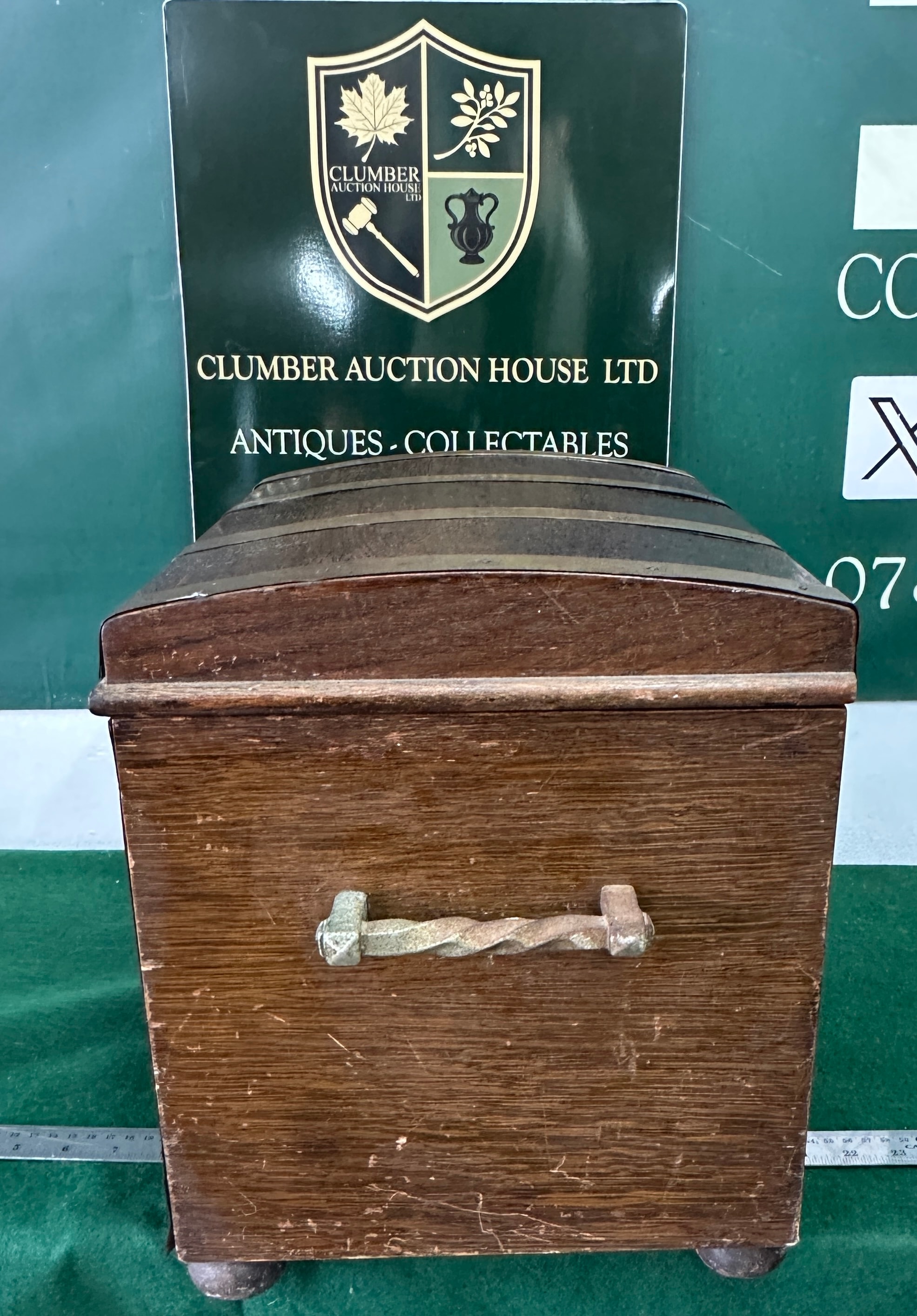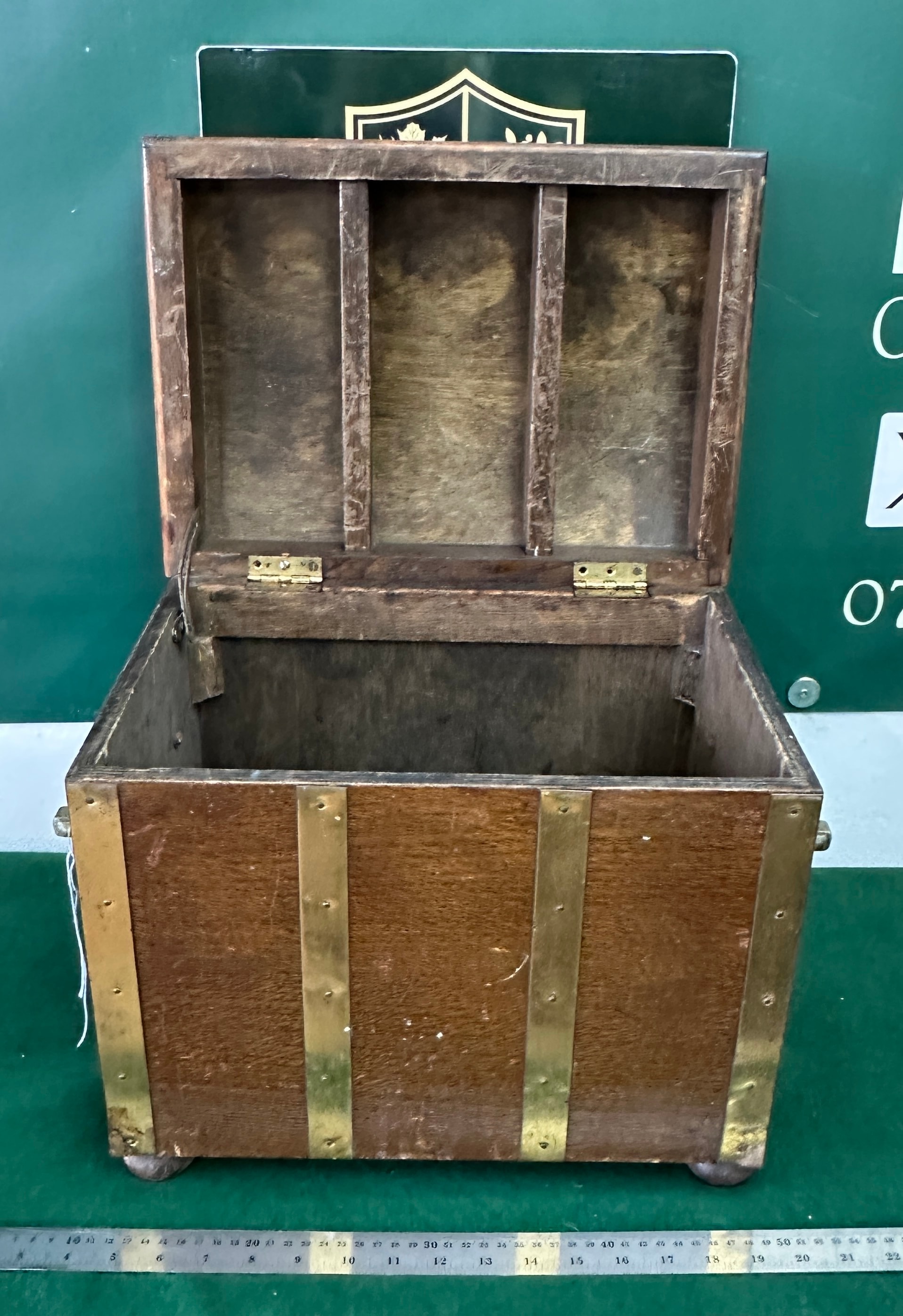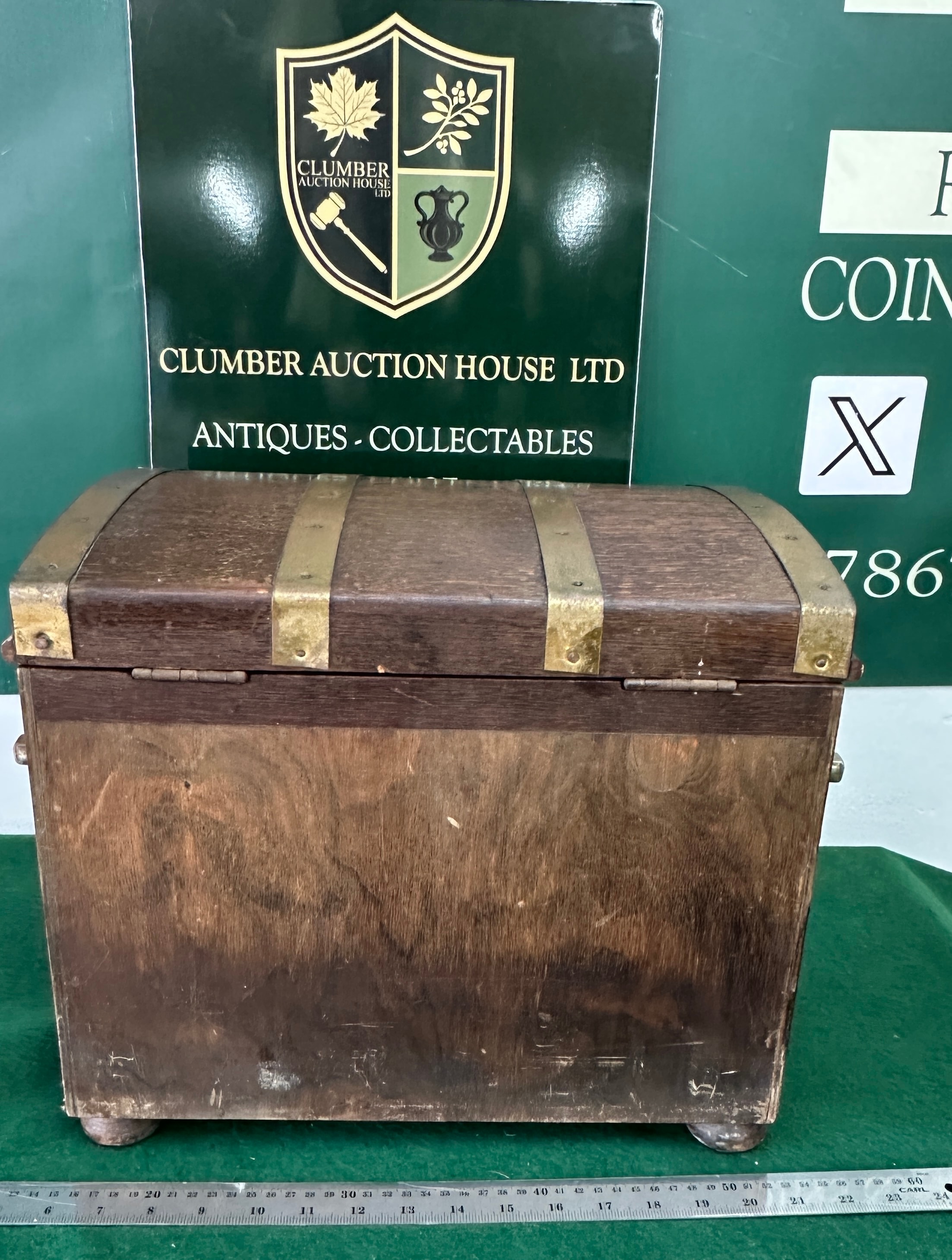 An antique 18th Century Baroque oak brass dome top hope chest. This dark-stained hardwood trunk features a distinctive domed lid, reinforced by horizontal brass or bronze strapping which continues down the sides. The rectangular body is also accented with vertical metal straps, and the piece stands on four bun feet. It is fitted with twisted metal drop handles on the sides, likely patinated brass or iron. The interior is unlined, constructed of plain wood, and secured by brass hinges.