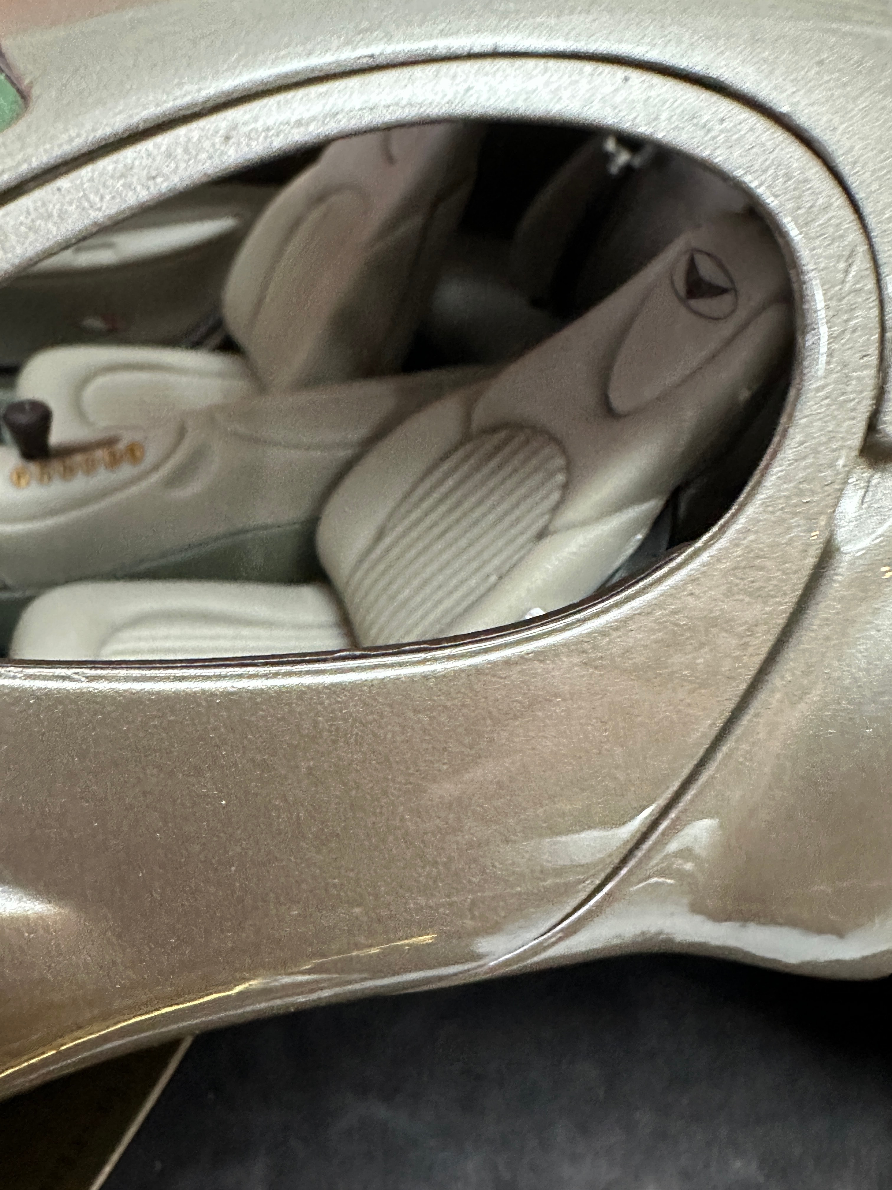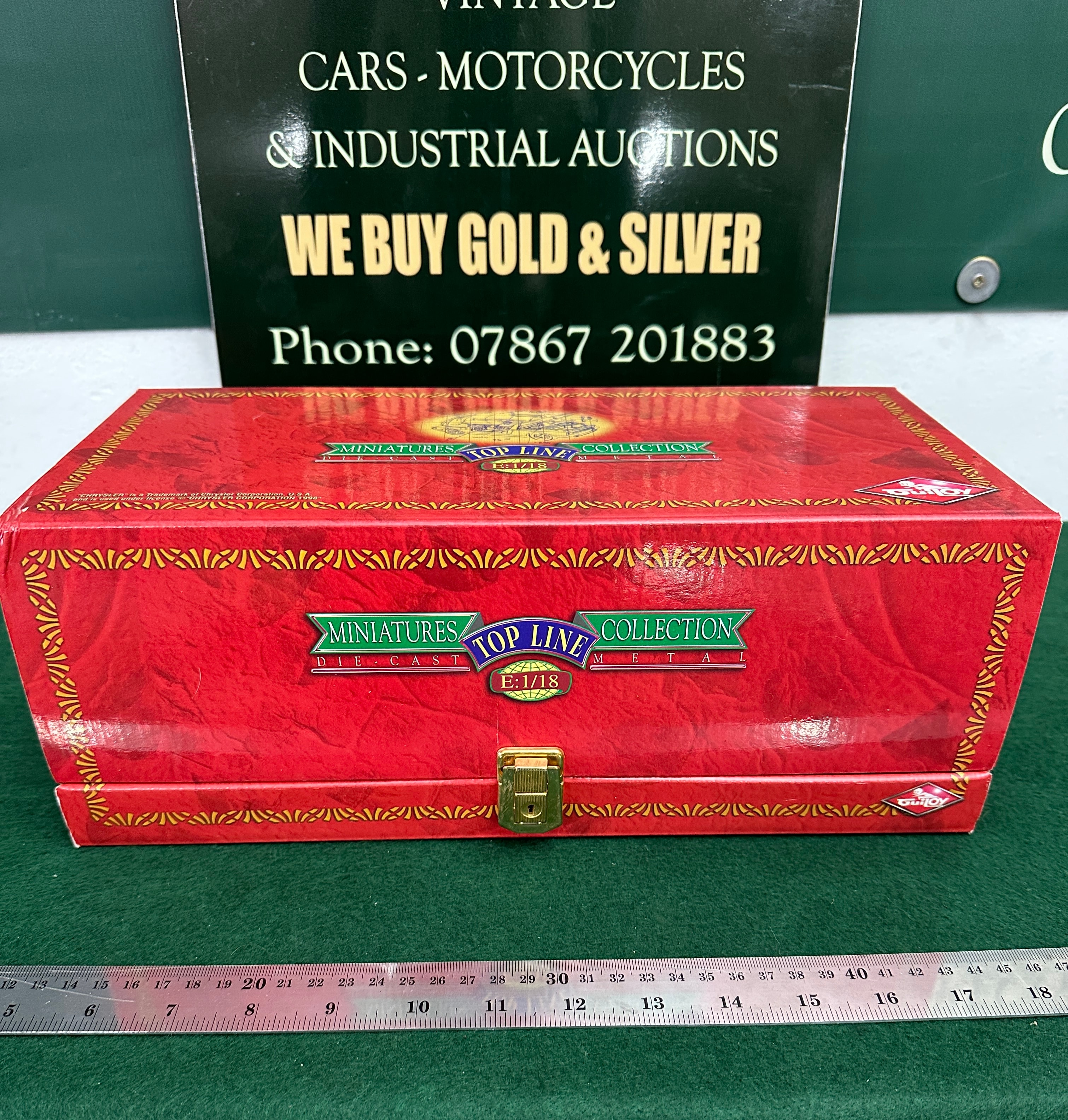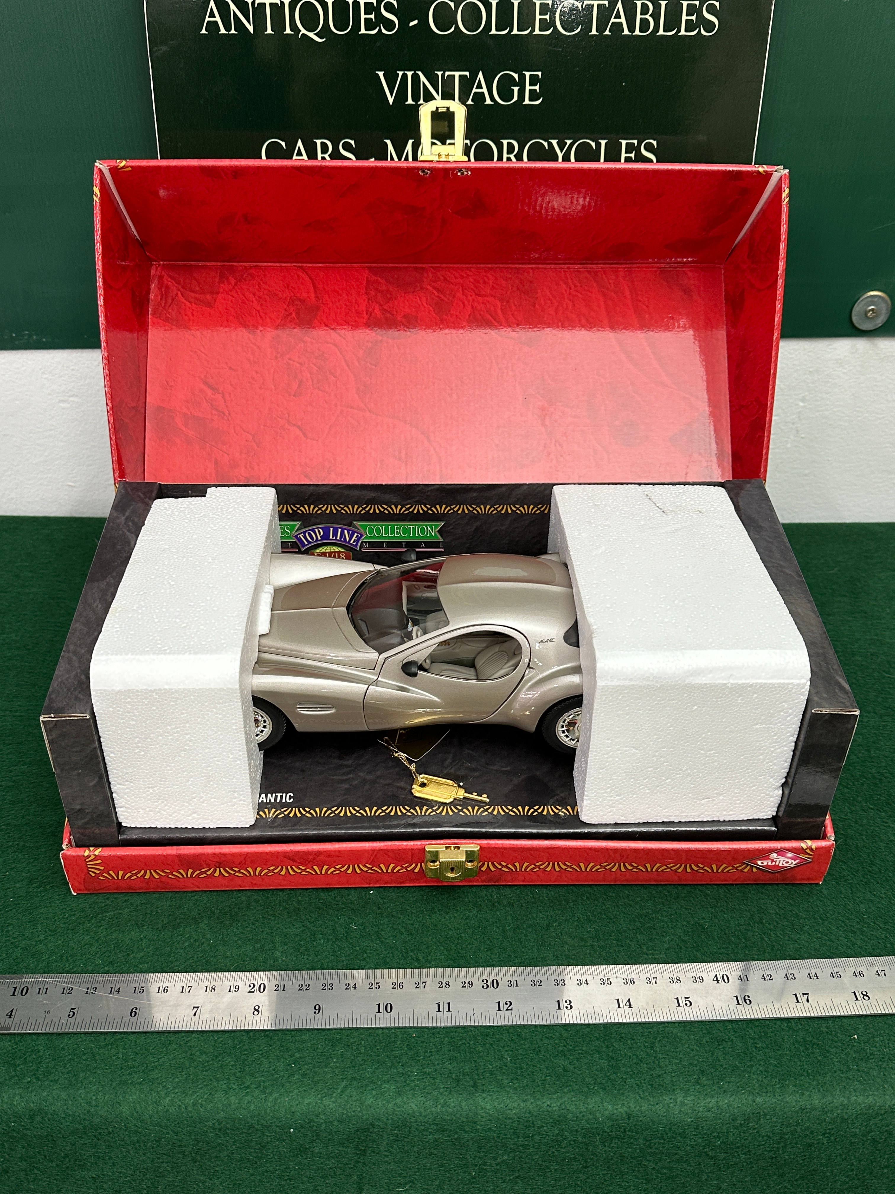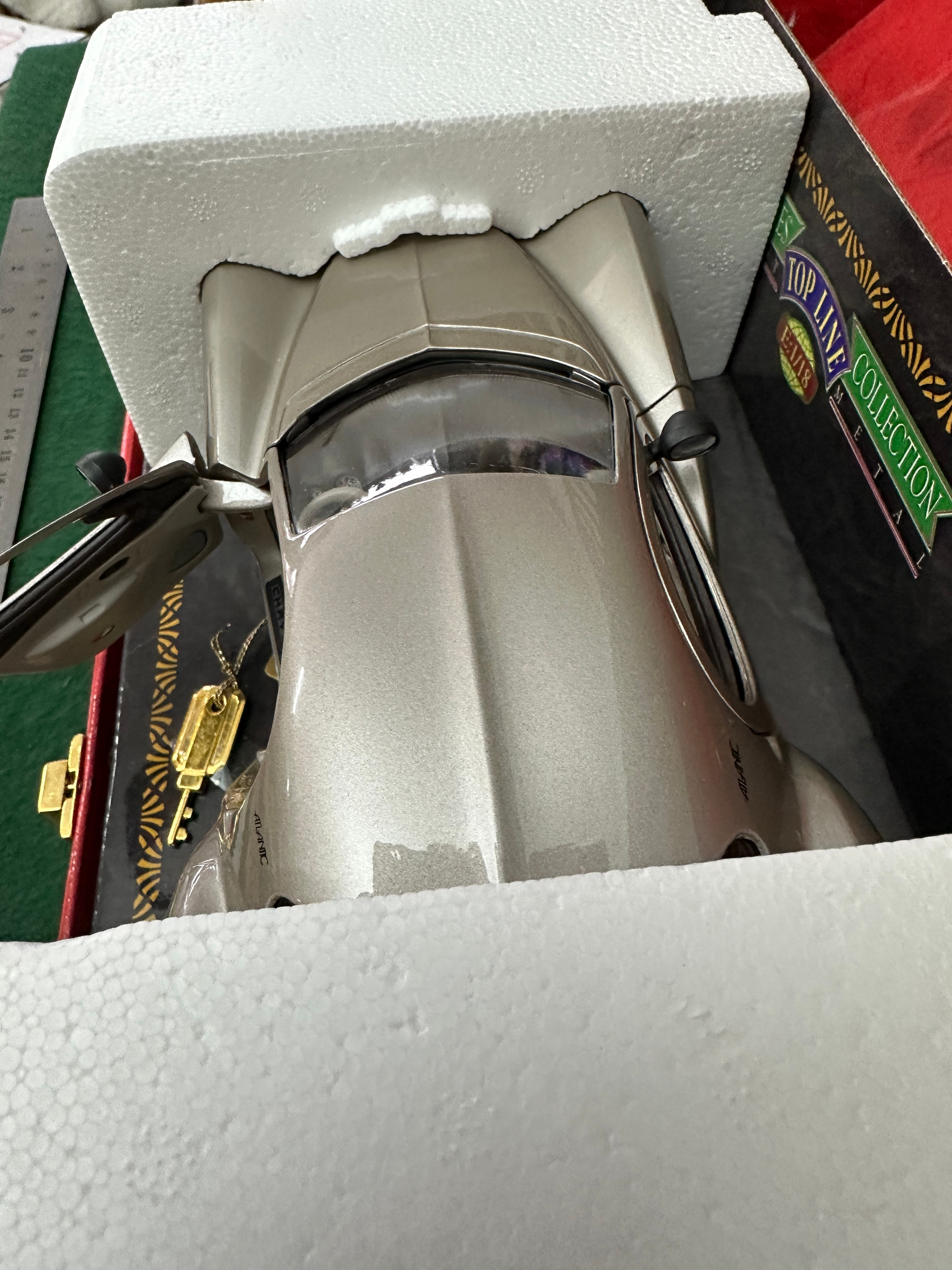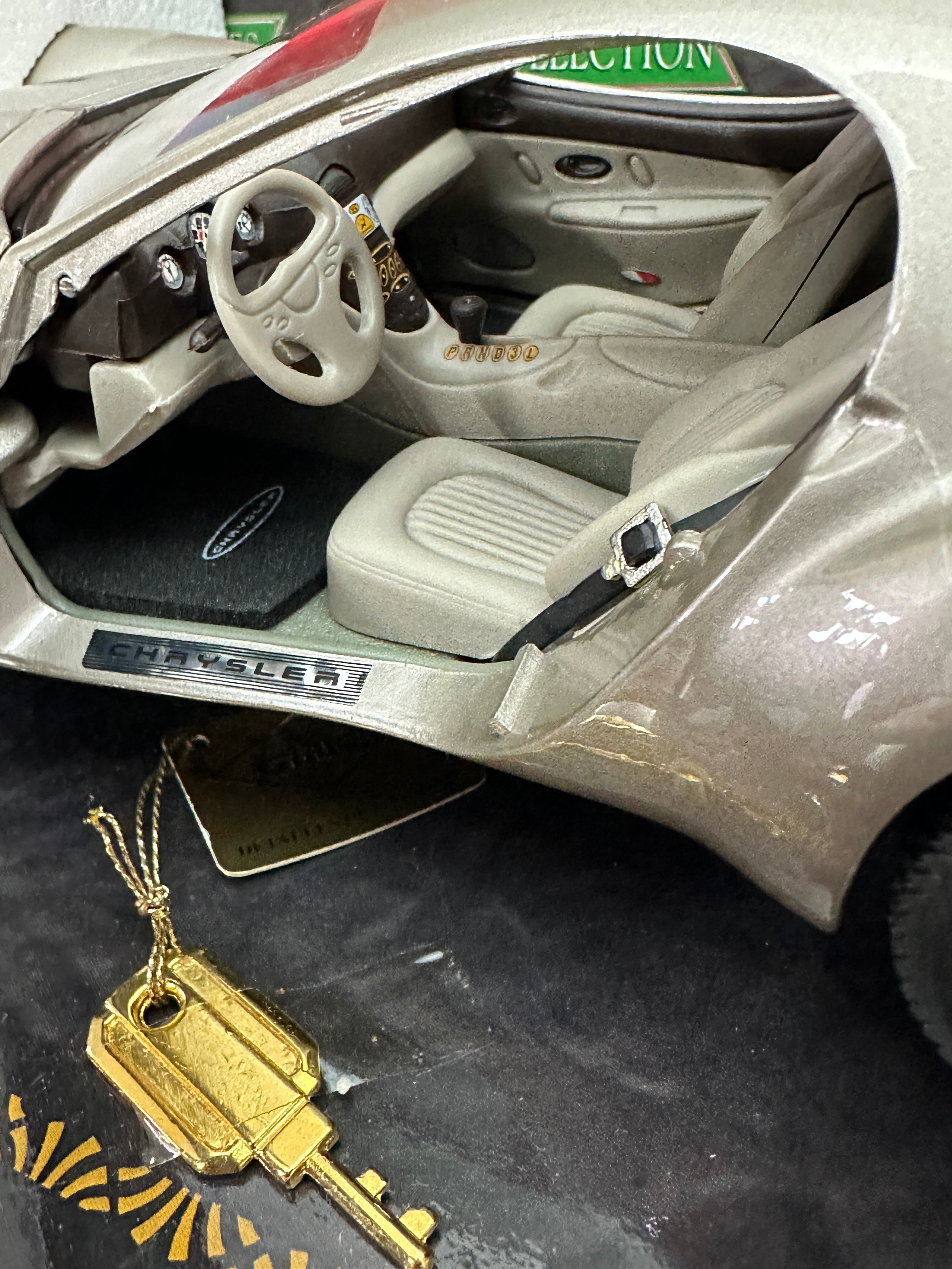 A Guiloy 1:18 scale die-cast model car, replicating the Chrysler Atlantic Concept vehicle, from the Top Line Miniatures collection. This die-cast metal model is finished in a metallic champagne color, featuring a detailed interior with branded ‘CHRYSLER’ door sills and floor mats. The dashboard is marked ‘CHRYSLER CHRONOS’. The model represents a sleek late 20th/early 21st-century two-seater design. It is presented in its original, vibrant red ‘MINIATURES TOP LINE COLLECTION ELITE’ box, explicitly stating ‘DIE CAST METAL,’ with decorative gold trim and a clasp closure. The model is securely nested within fitted polystyrene packaging. An accompanying golden key tag is included.