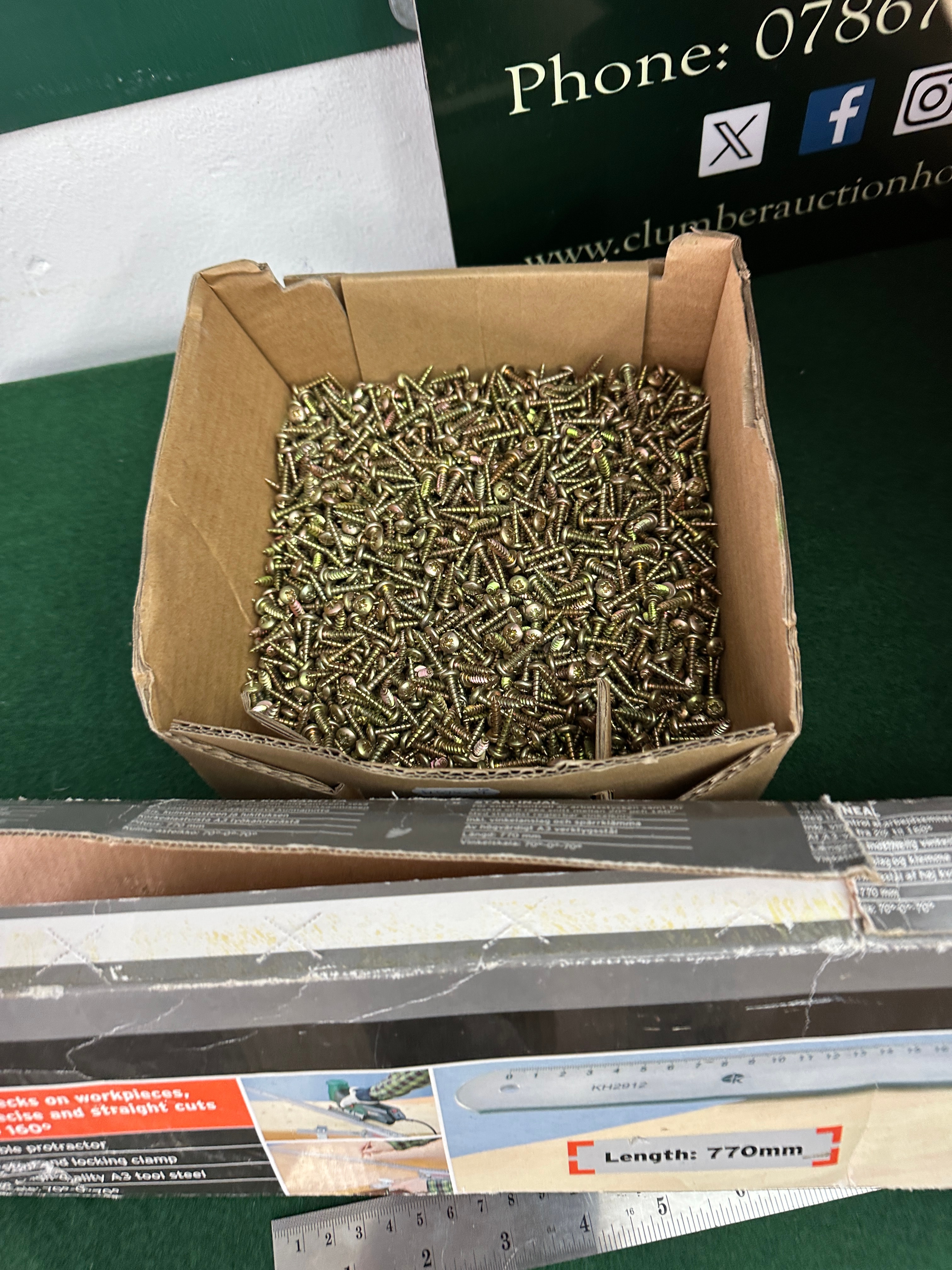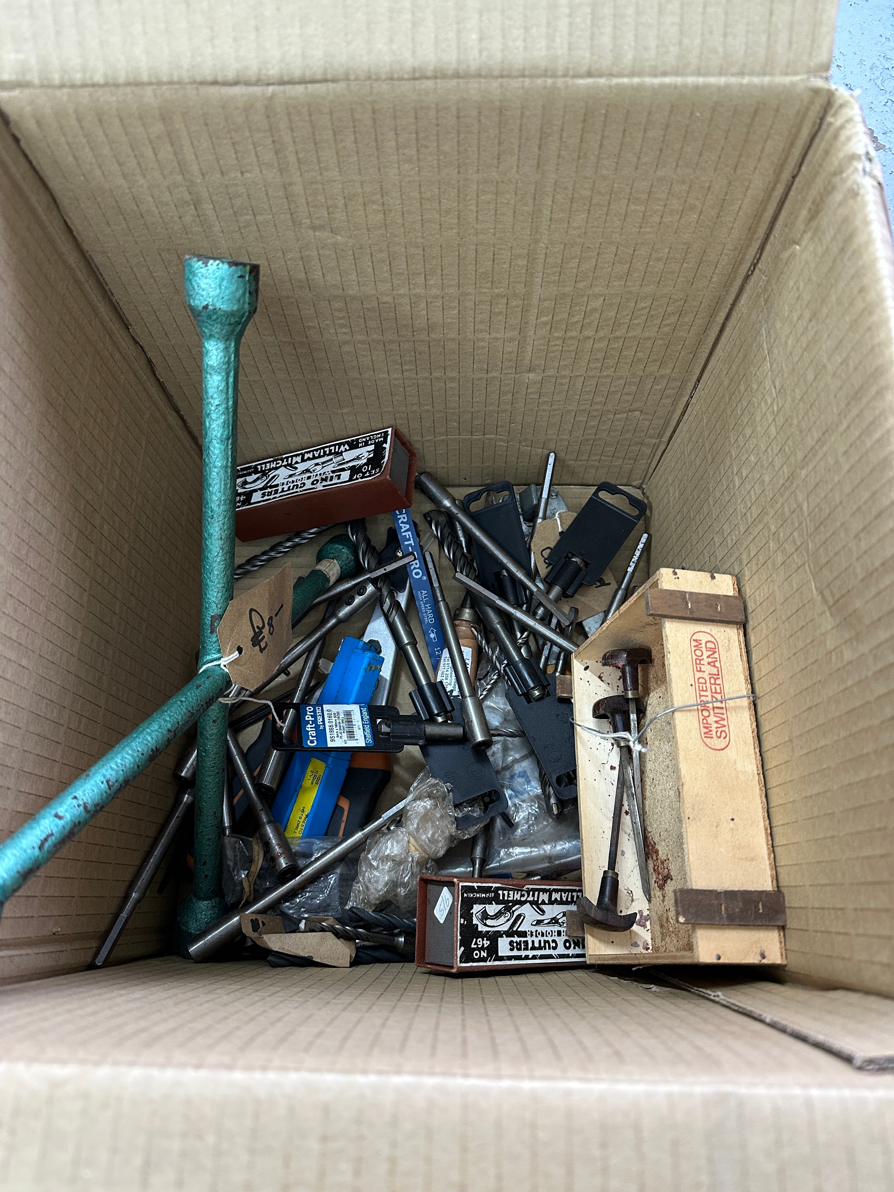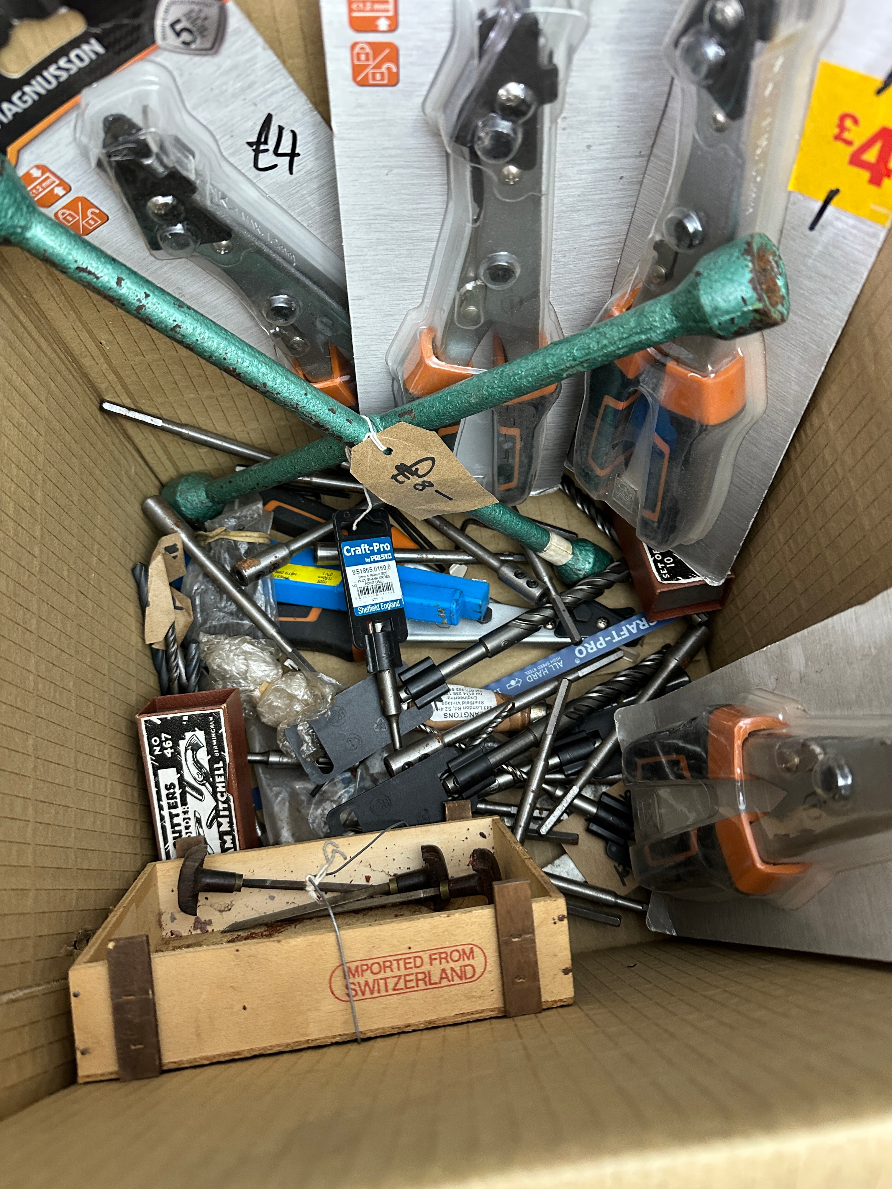 A collection of assorted hand tools and hardware. The lot includes a green-painted cross wrench or lug wrench, numerous drill bits with some in packaging marked “KING ORION,” “CRAFT-PRO,” and “RAFI-PRO.” Also present are several “MAGNUSSON” branded pliers or cutters still sealed in retail packaging, a small vintage box labeled “WILLIAM MITCHELL’S NO. 407 STEEL PEN CUTTERS,” and a small wooden box stamped “IMPORTED FROM SWITZERLAND.” A smaller cardboard box contains a bulk quantity of brass-colored screws. Completing the lot is a “POWERFIX” branded steel ruler in its original packaging.