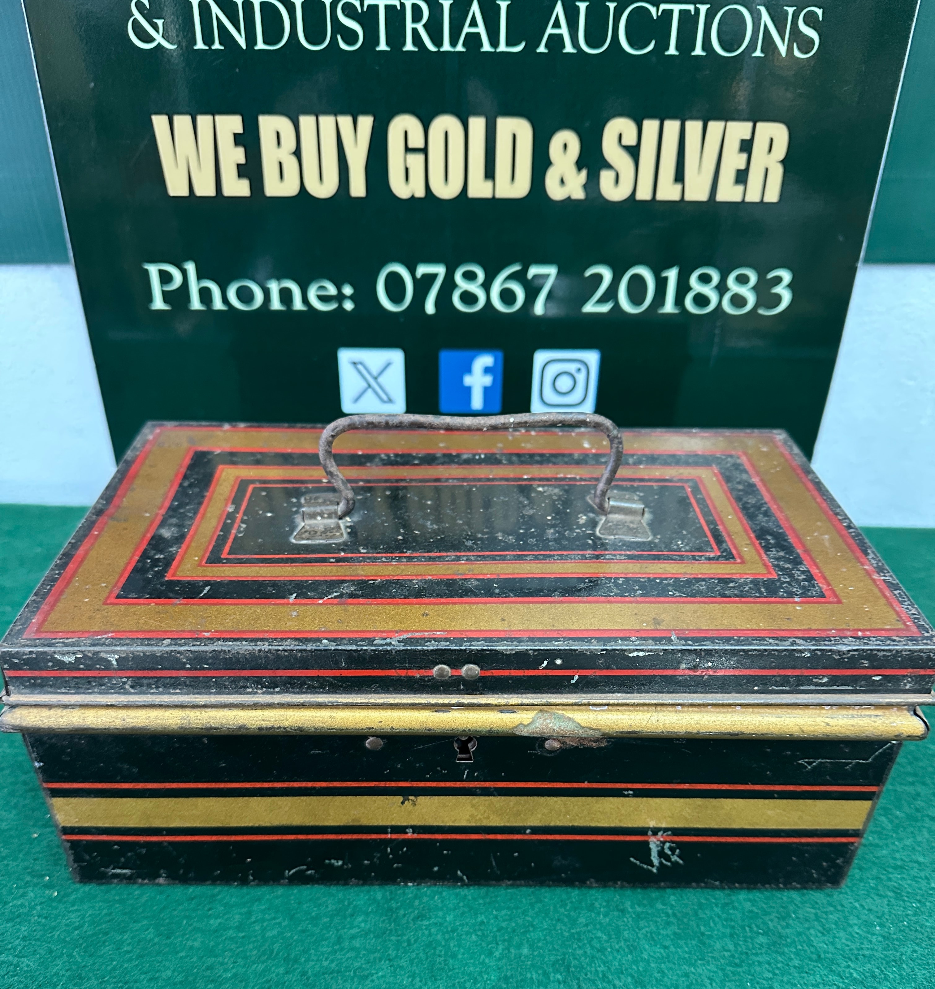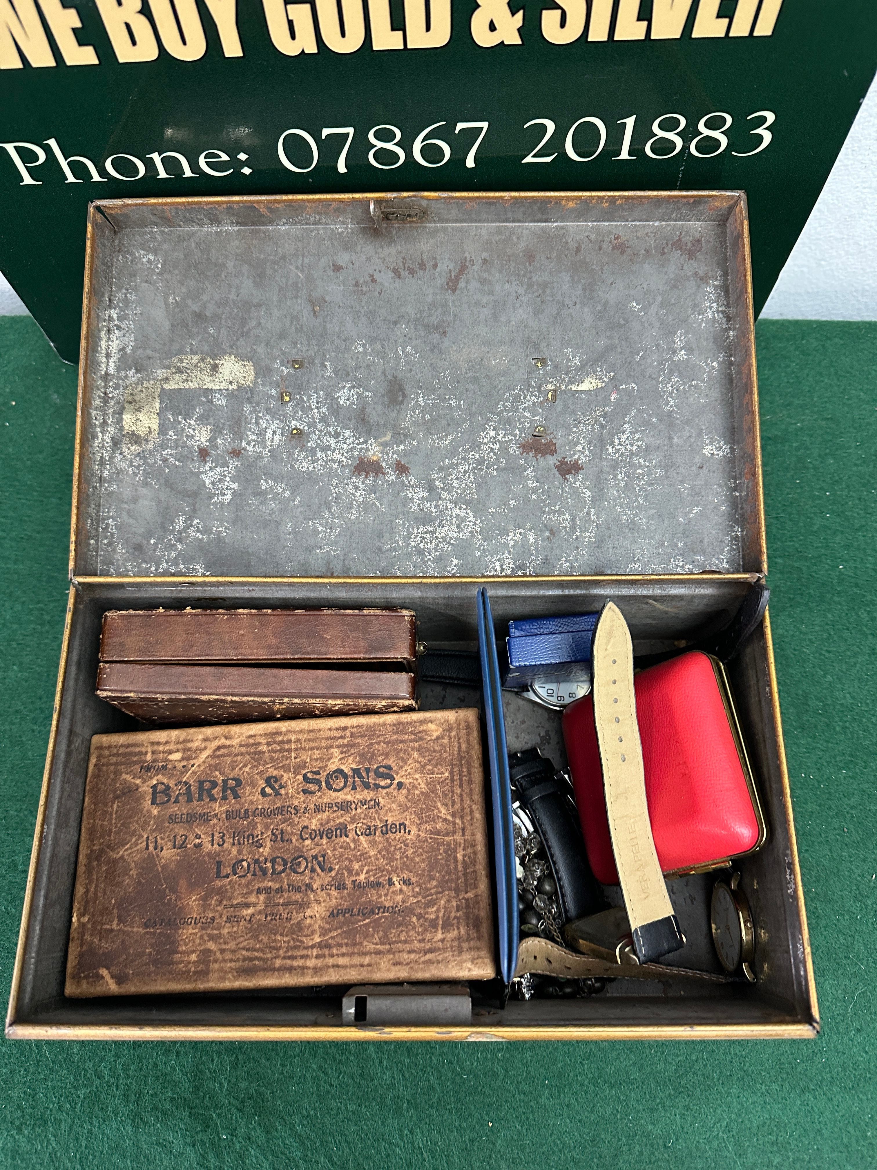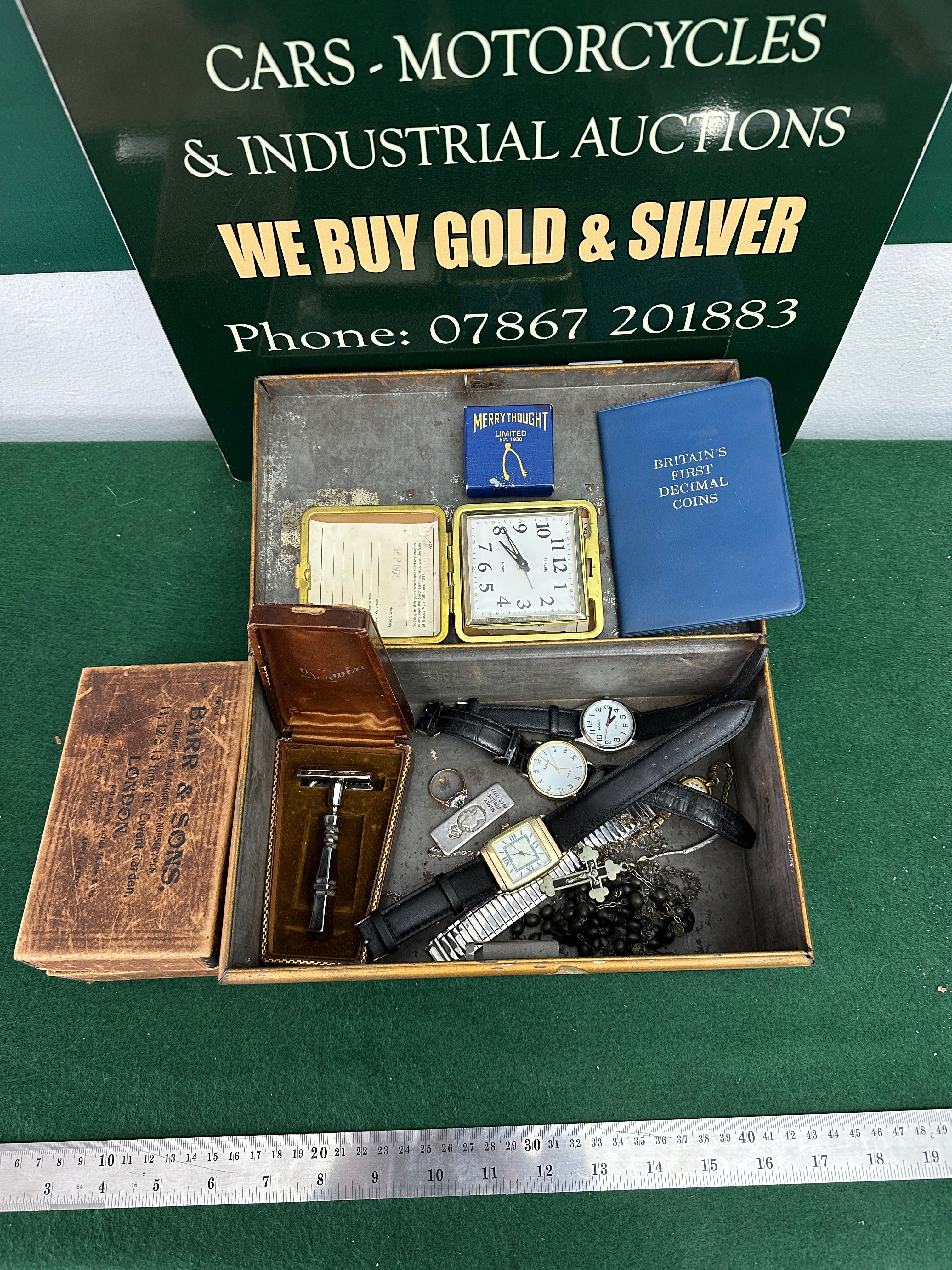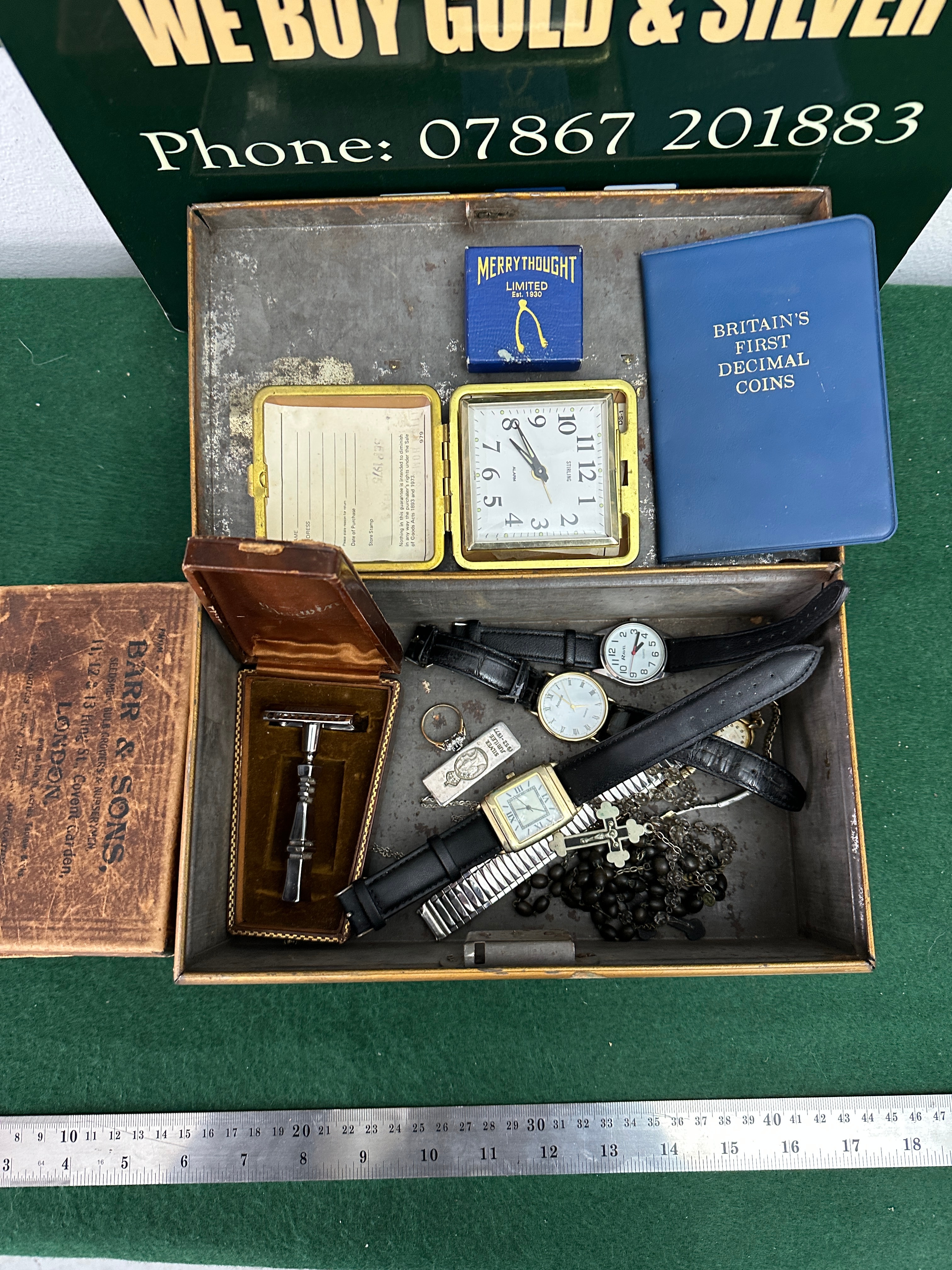A distressed, dark-colored metal cash box, decorated with faded red and gold stripes, containing a varied collection of personal items. Contents include an open, gilded metal compact with a blank paper insert, and a small blue box bearing the text “MERRYTHOUGHT LIMITED EST. 1930 MADE IN ENGLAND” alongside a wishbone motif. Also present is a blue softcover book titled “BRITAIN’S FIRST DECIMAL COINS.” A wooden case within the box is stamped “BARR & SONS. GOLDSMITHS, SILVERSMITHS & JEWELLERS. 11, 12, & 13 King St, Covent Garden, LONDON. ESTABLISHED 1836. APPOINTED TO THE LATE QUEEN VICTORIA,” and houses a chrome-plated safety razor in a velvet-lined interior. The remaining items comprise a gold-toned square travel alarm clock marked “JAPAN,” a collection of wristwatches with both metal link and leather straps, a black beaded rosary with a crucifix, a silver-toned fob marked “STERLING,” and another fob depicting an eagle and “ONE DOLLAR.” A small red rectangular case is also included.
