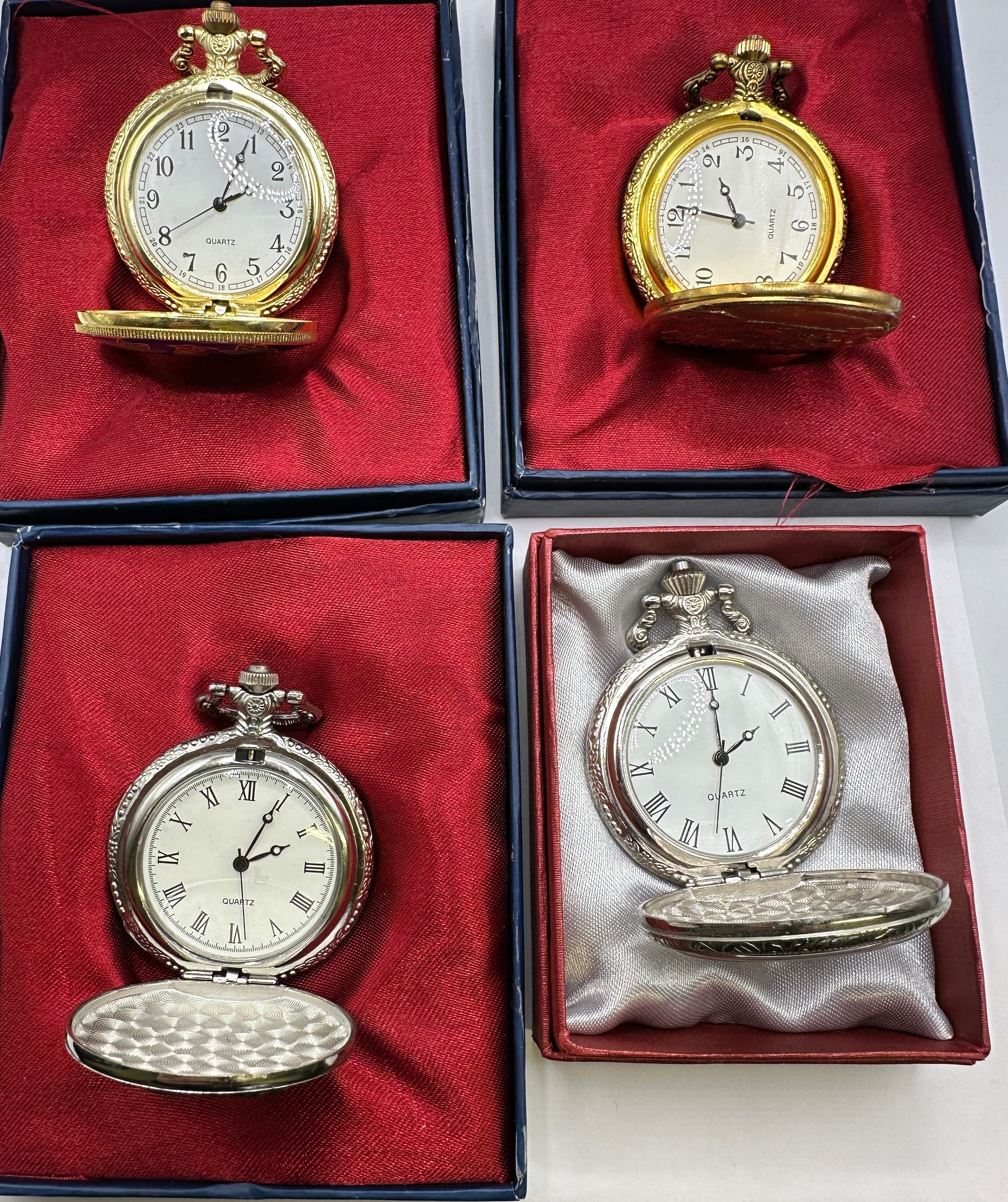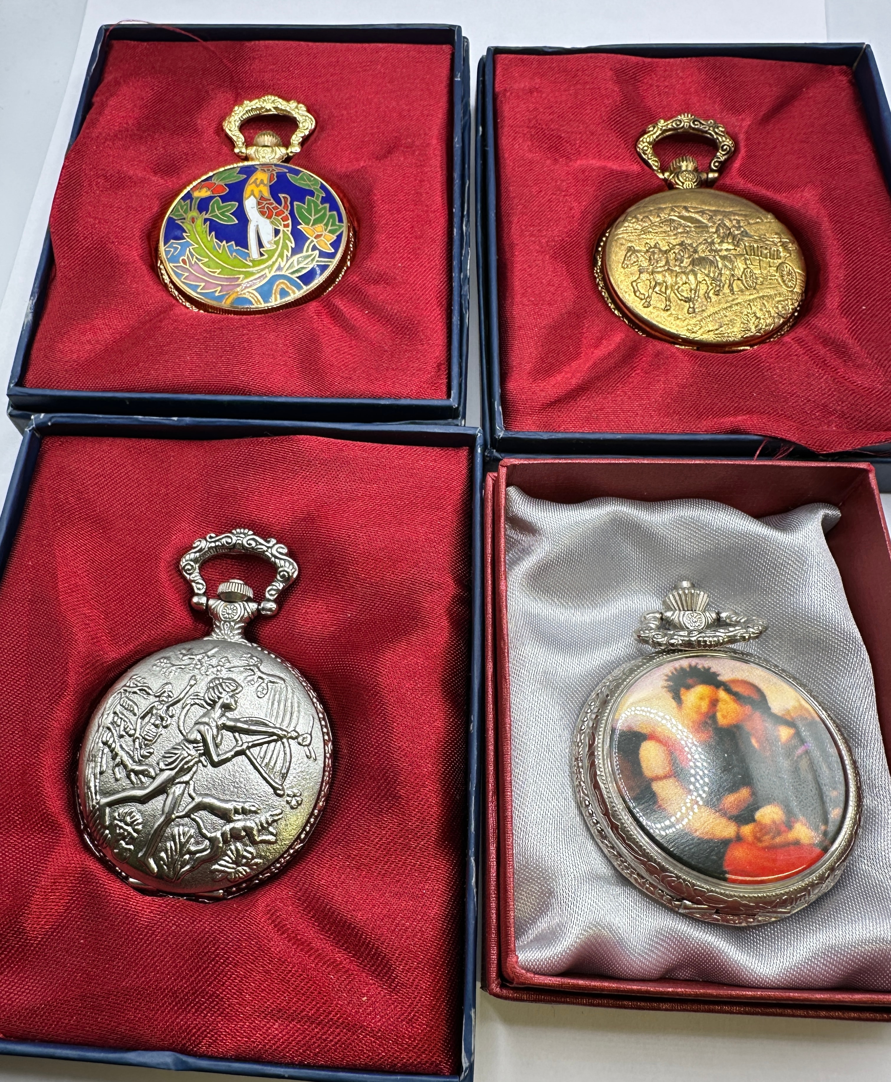 A group of four modern quartz pocket watches, two presented in gold-tone metal and two in silver-tone metal, each housed in its original-style, satin-lined presentation box. The watches feature varied decorative covers: one gold-tone watch displays a colorful enameled design depicting a figure amidst flora; another gold-tone watch is adorned with a relief scene of figures on horseback; one silver-tone watch features a detailed relief of an archer; and the remaining silver-tone watch showcases a color photographic image of a couple under a clear covering. When opened, all watches reveal white dials with black hour markers, utilizing either Arabic or Roman numerals, and are uniformly marked “QUARTZ”.