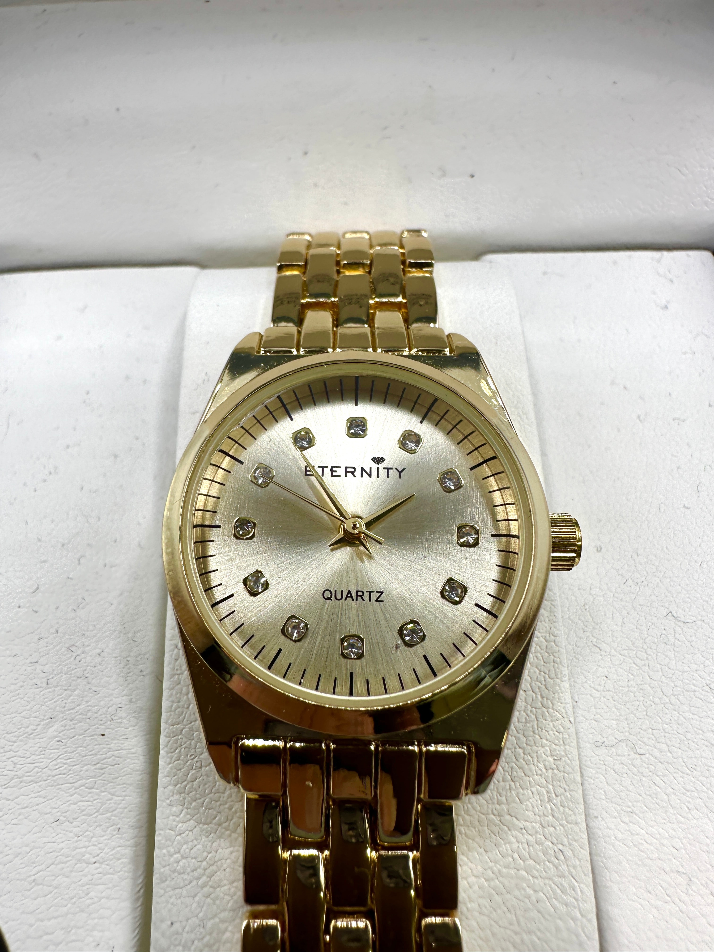 A gold-tone Eternity brand ladies’ quartz wristwatch, presented new in its original light blue retail box. The watch features a round case, a brushed gold-tone dial marked “ETERNITY” and “QUARTZ,” and a matching gold-tone multi-link bracelet. The dial is adorned with twelve clear, round stone hour markers. The box interior and a circular sticker on the packaging both confirm the use of “Genuine Cubic Zirconia Crystals.”