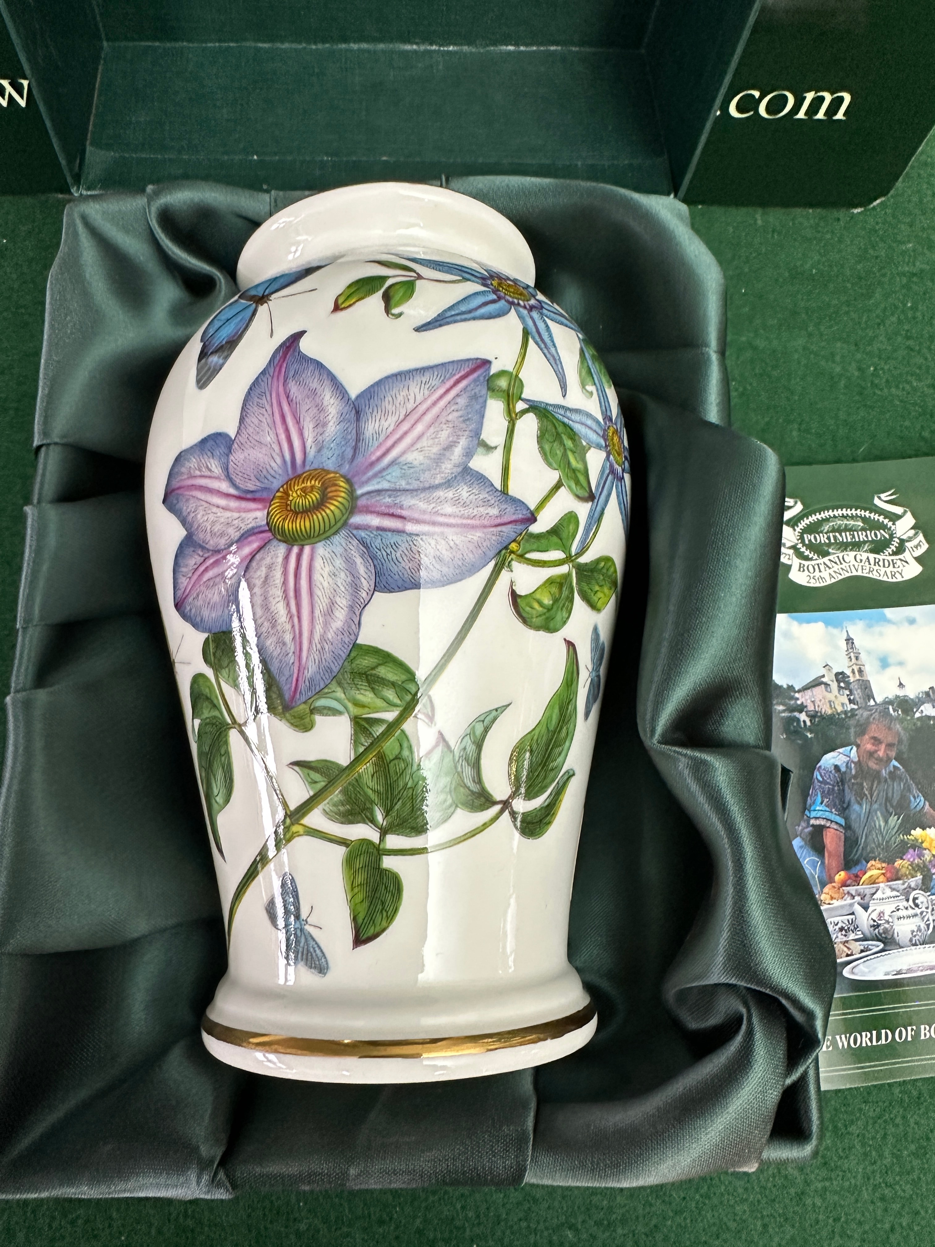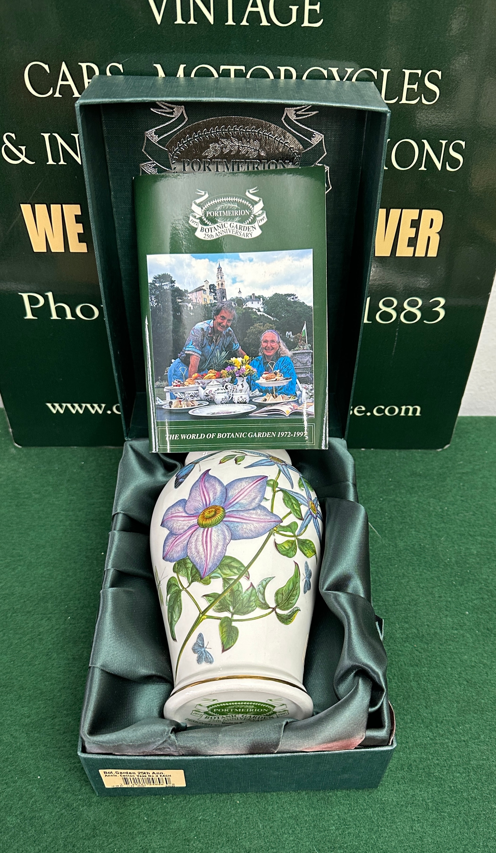A Portmeirion Botanic Garden 25th Anniversary commemorative ceramic vase, dating to 1997. The vase is adorned with a naturalistic polychrome botanical decoration featuring large purple and blue clematis-like flowers, smaller blue blossoms, green foliage, and several blue butterflies, finished with a thin gold band at its base. It is housed within its original dark green presentation box, lined with matching satin fabric, and accompanied by a small informational booklet titled “THE WORLD OF BOTANIC GARDEN 1972-1997.” Both the box and the booklet clearly bear the inscription “PORTMEIRION BOTANIC GARDEN 25th ANNIVERSARY 1972-1997.”