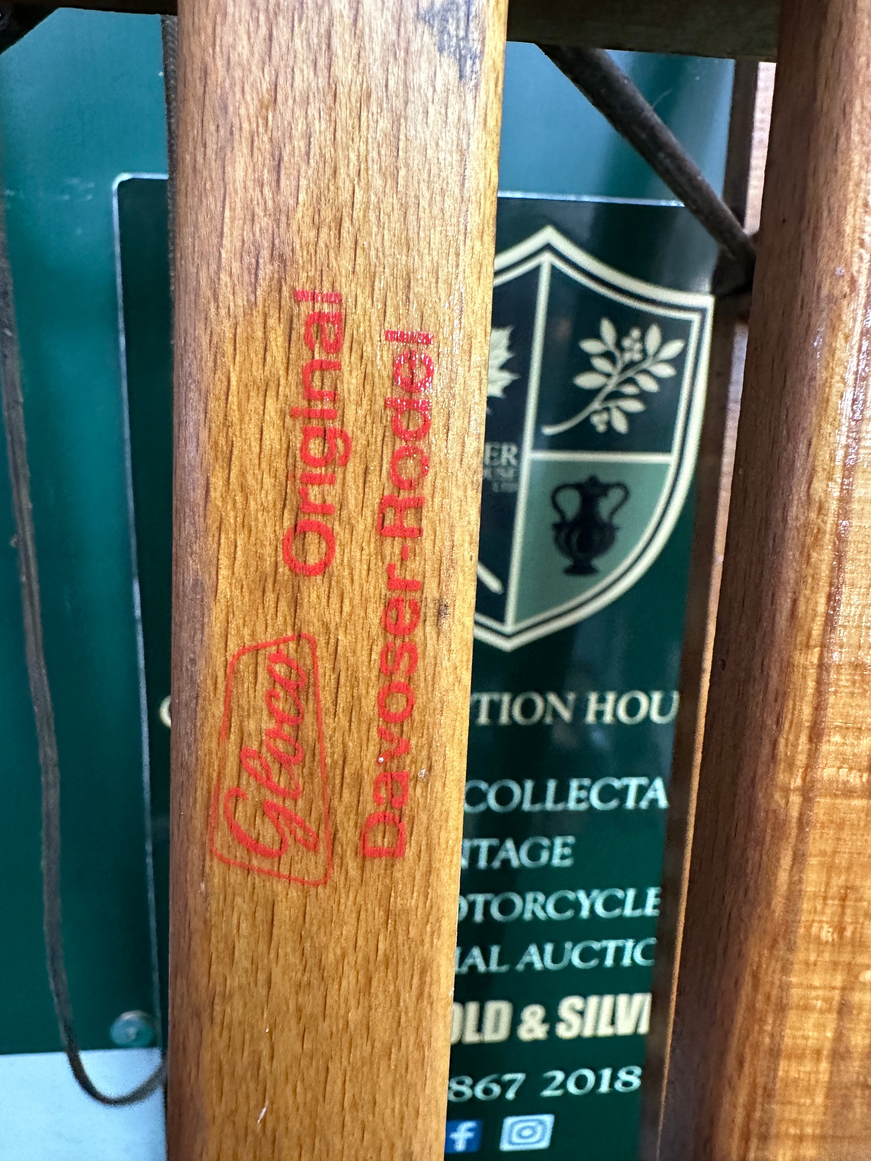 A vintage Globi Original Davos Rodel sled, constructed primarily from light-toned wood with a natural finish. The design features two curved runners, multiple cross-slats forming the seat, and supporting struts. It incorporates metal hardware, including screws and runner bindings, and has a braided rope attached to the front steering bar for steering. The red text “Globi Original Davos Rodel” is printed on one of the top slats.