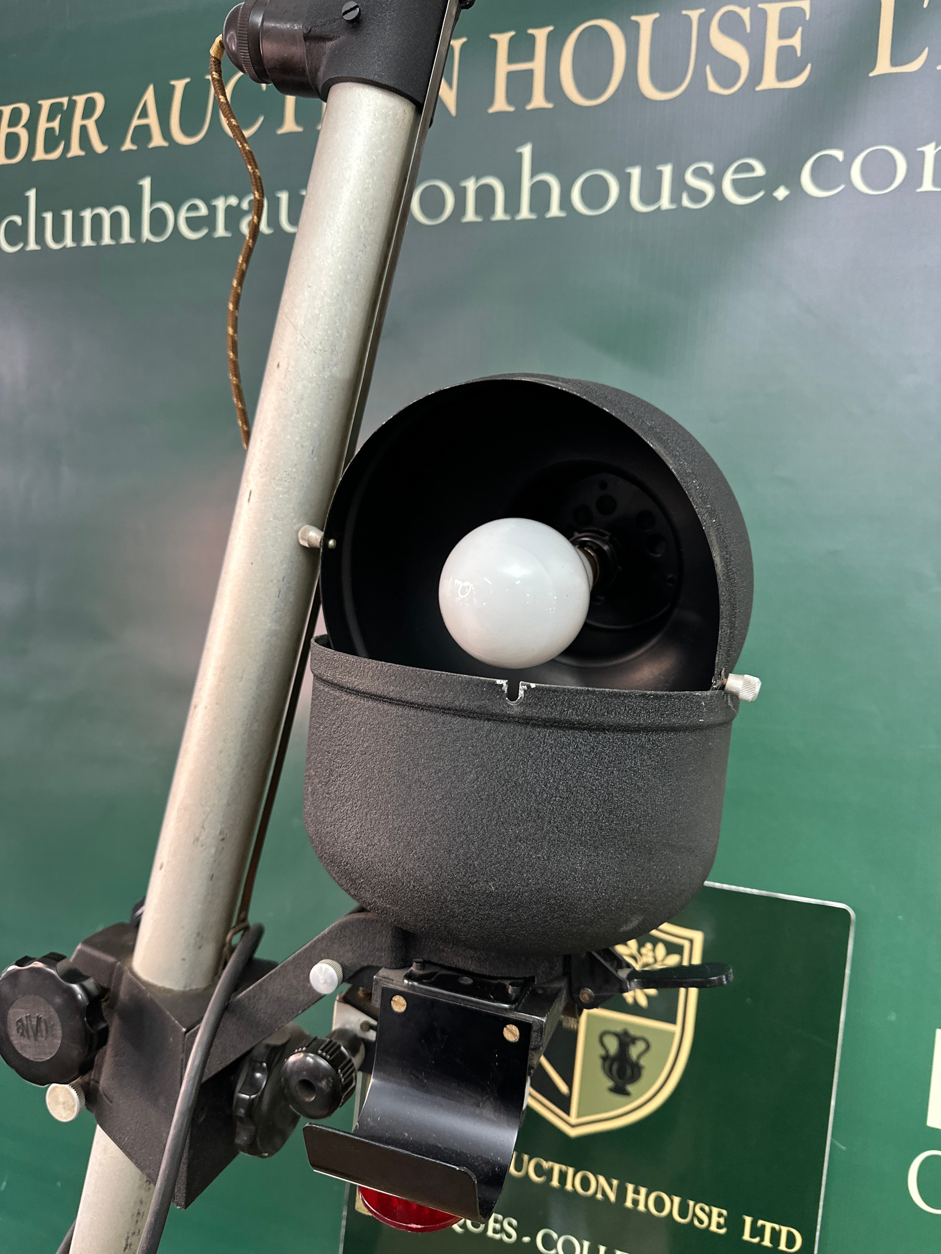 A vintage photographic enlarger or darkroom stand by Envoy, featuring an industrial design consistent with the mid-20th century. The item comprises a vertically adjustable silver-toned metal column supporting a black, textured lamp head, which currently houses an illuminated bulb. The upper assembly is fitted with an oval metal plaque embossed with ‘ENVOY’. The stand is mounted on a rectangular dark brown wooden base, which bears a small metal plaque on its front displaying the numbers ‘9480’.