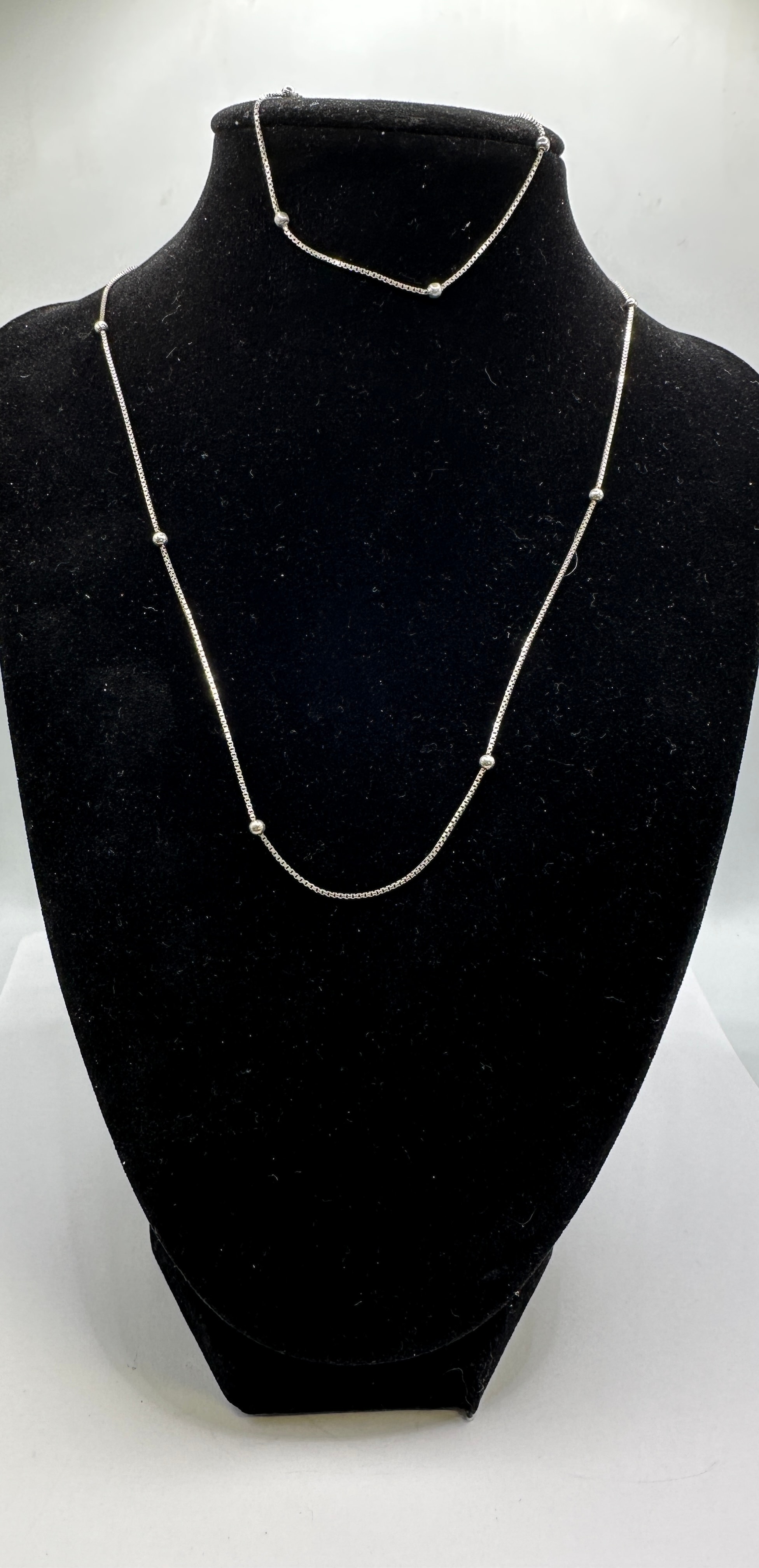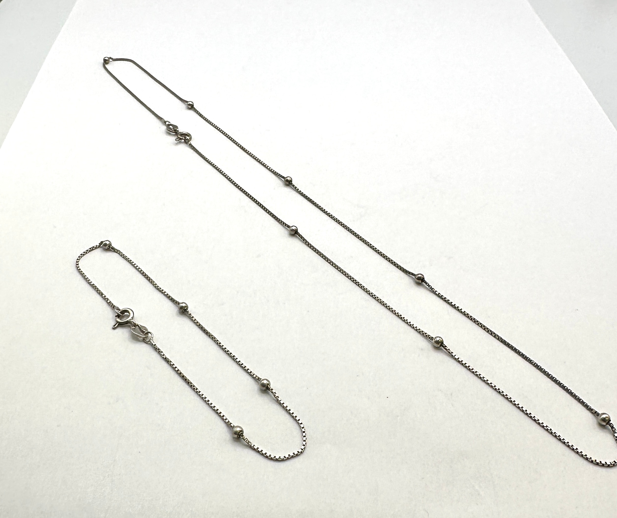 A matching necklace and bracelet set, each featuring a fine box chain adorned with evenly spaced small, round beads, presented in a contemporary, minimalist design. Both pieces are crafted from sterling silver, indicated by a clear ‘925’ hallmark visible on a small tag adjacent to the lobster clasp of the bracelet.