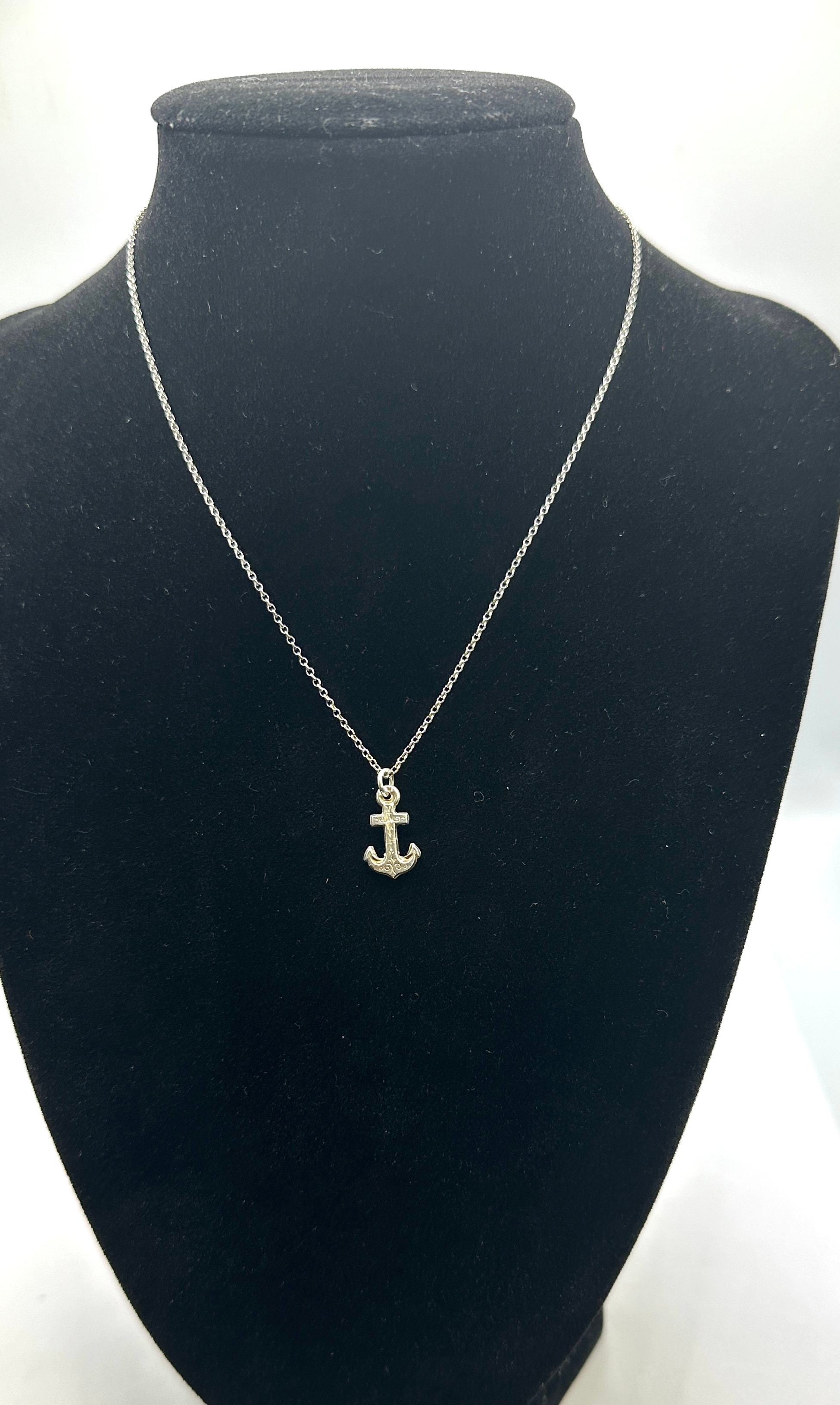 An Italian sterling silver necklace featuring a small, textured anchor-shaped pendant. The pendant is suspended from a delicate cable chain, secured by a spring ring clasp. The clasp bears clear stamped markings “925” for sterling silver composition and “ITALY” signifying its country of manufacture. The necklace presents in a contemporary, nautical style.