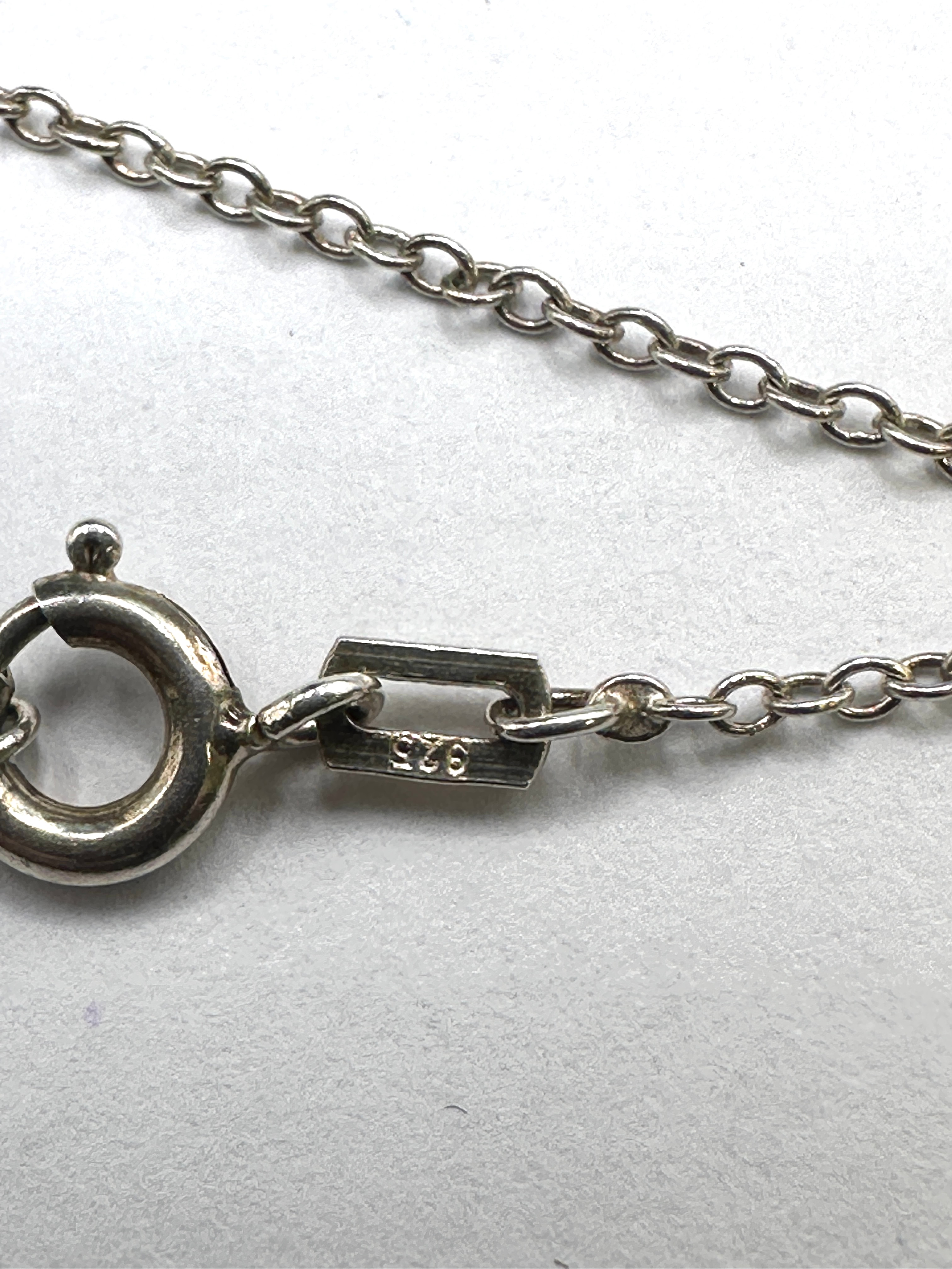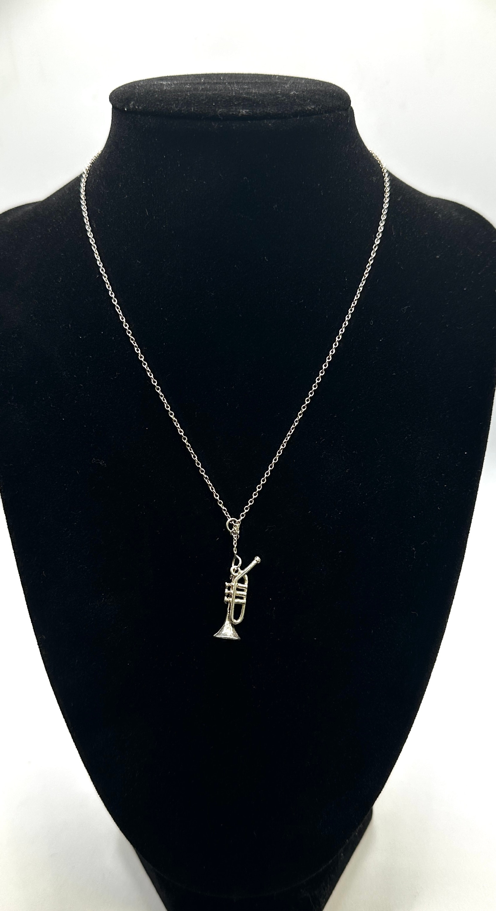 A sterling silver necklace featuring a miniature trumpet-shaped charm. The necklace comprises a fine cable link chain, secured by a spring ring clasp. A small rectangular tag adjacent to the clasp is clearly marked with ‘925’, confirming its composition as 925 silver. The item’s materials are confirmed to be 925 silver.