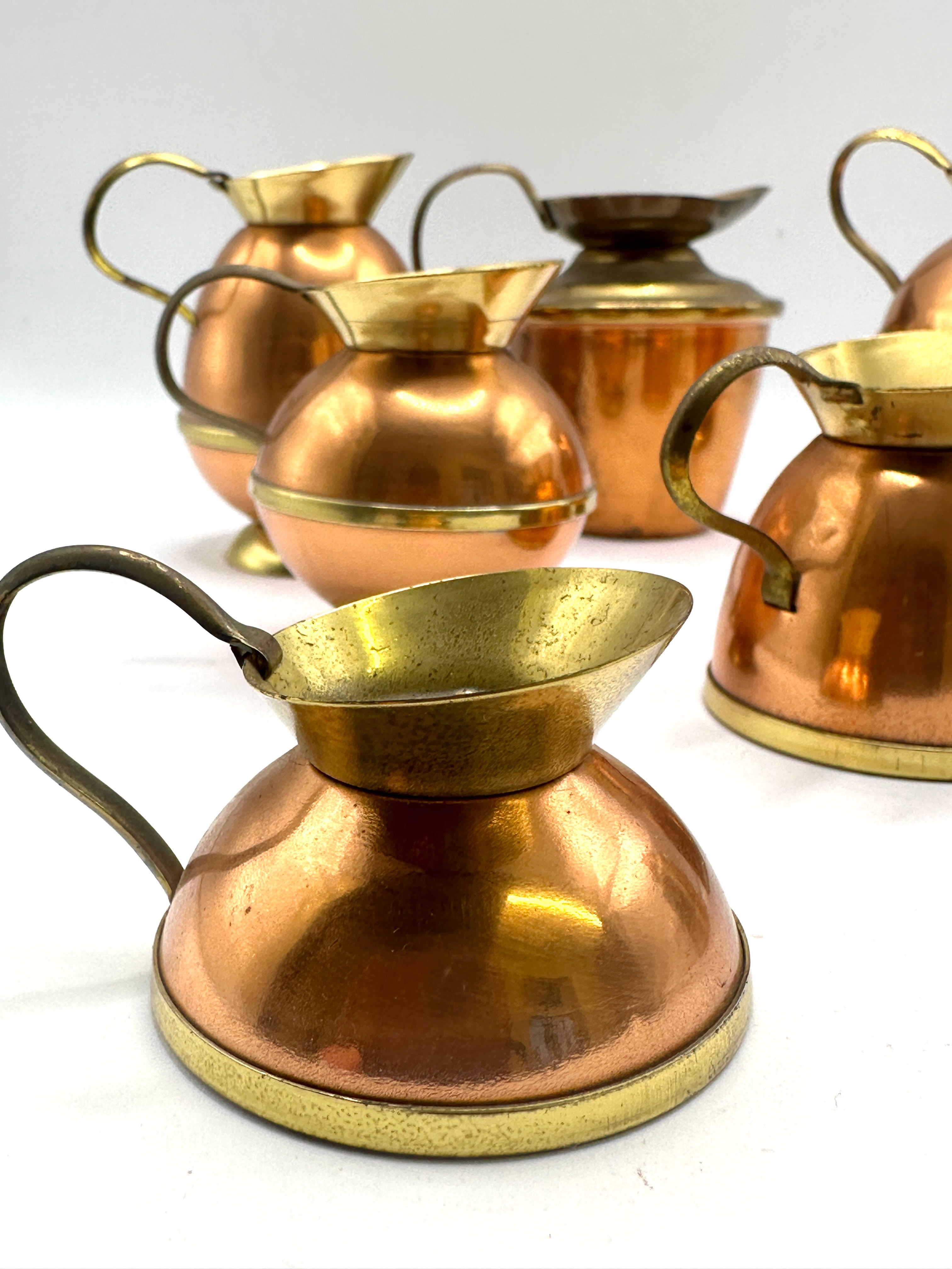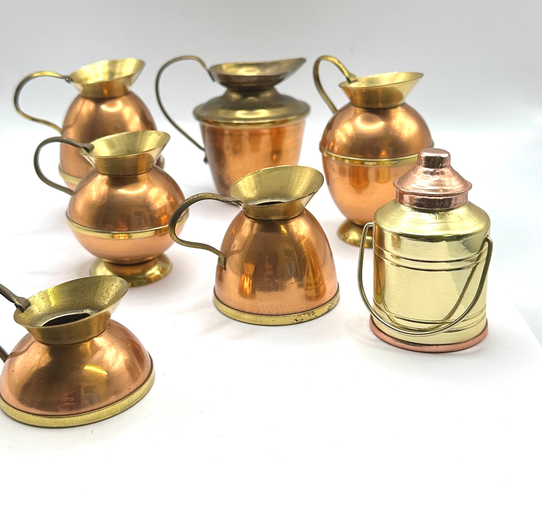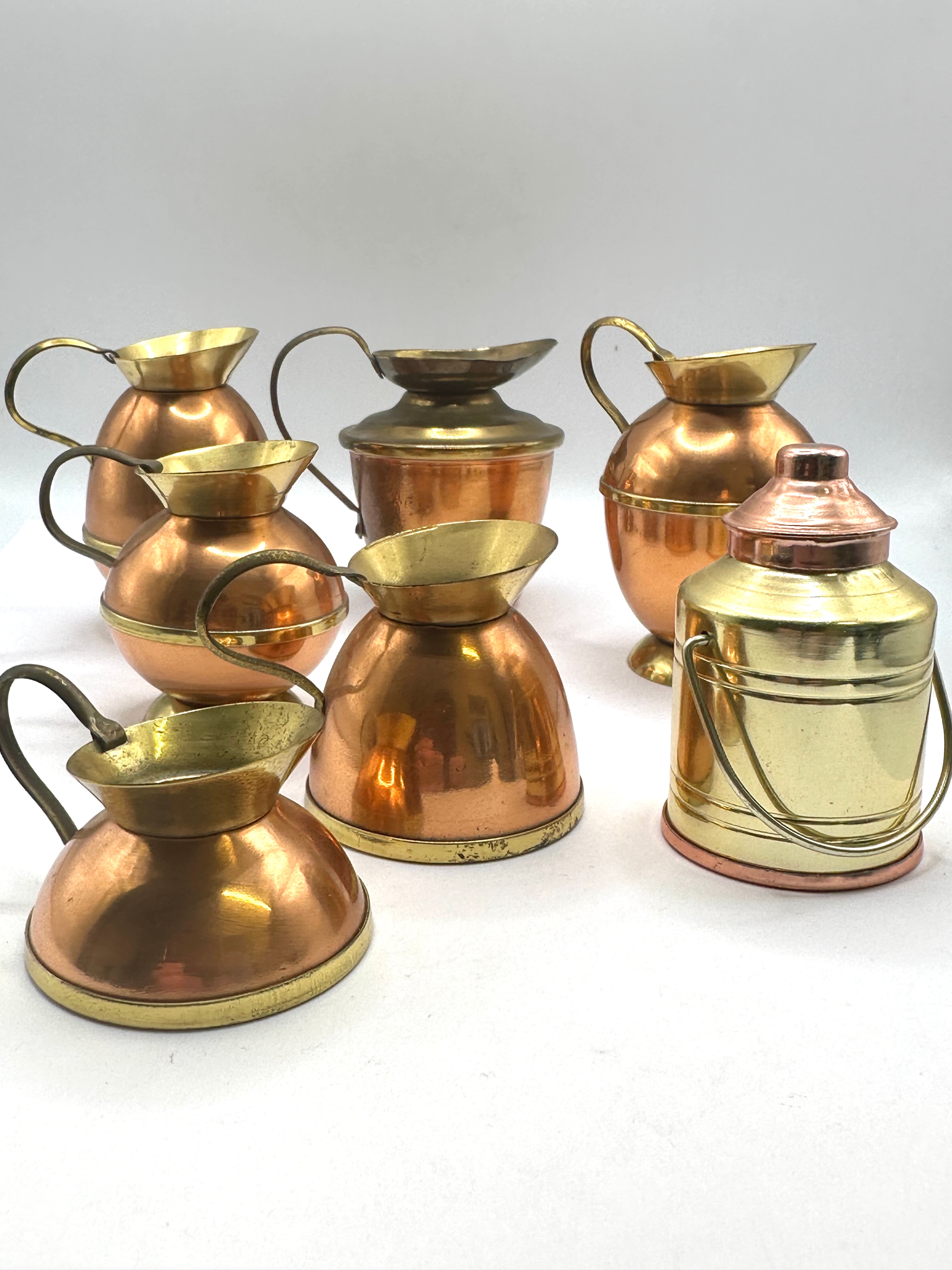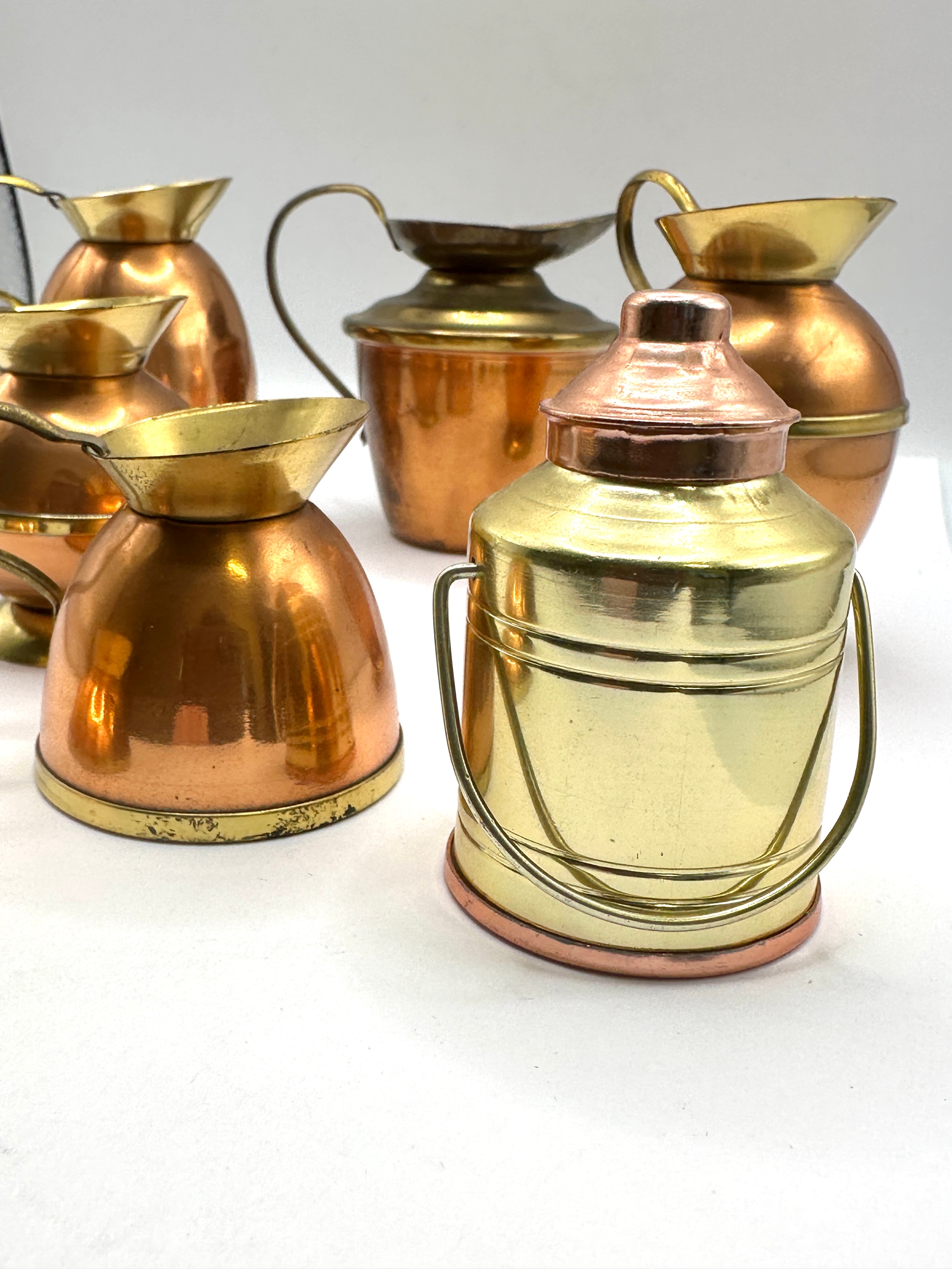 A set of seven miniature decorative vessels, comprising six small pitchers or jugs, each with a handle and spout, and one lidded container styled as a milk can with a bail handle. All items are constructed from a combination of metals, primarily copper for the bodies of the pitchers and brass for their handles, spouts, rims, and bases. The lidded can is brass with a copper lid and base trim. There are no discernible text or manufacturer markings visible on any of the pieces. The period of production is undetermined, though they appear to be modern decorative items.