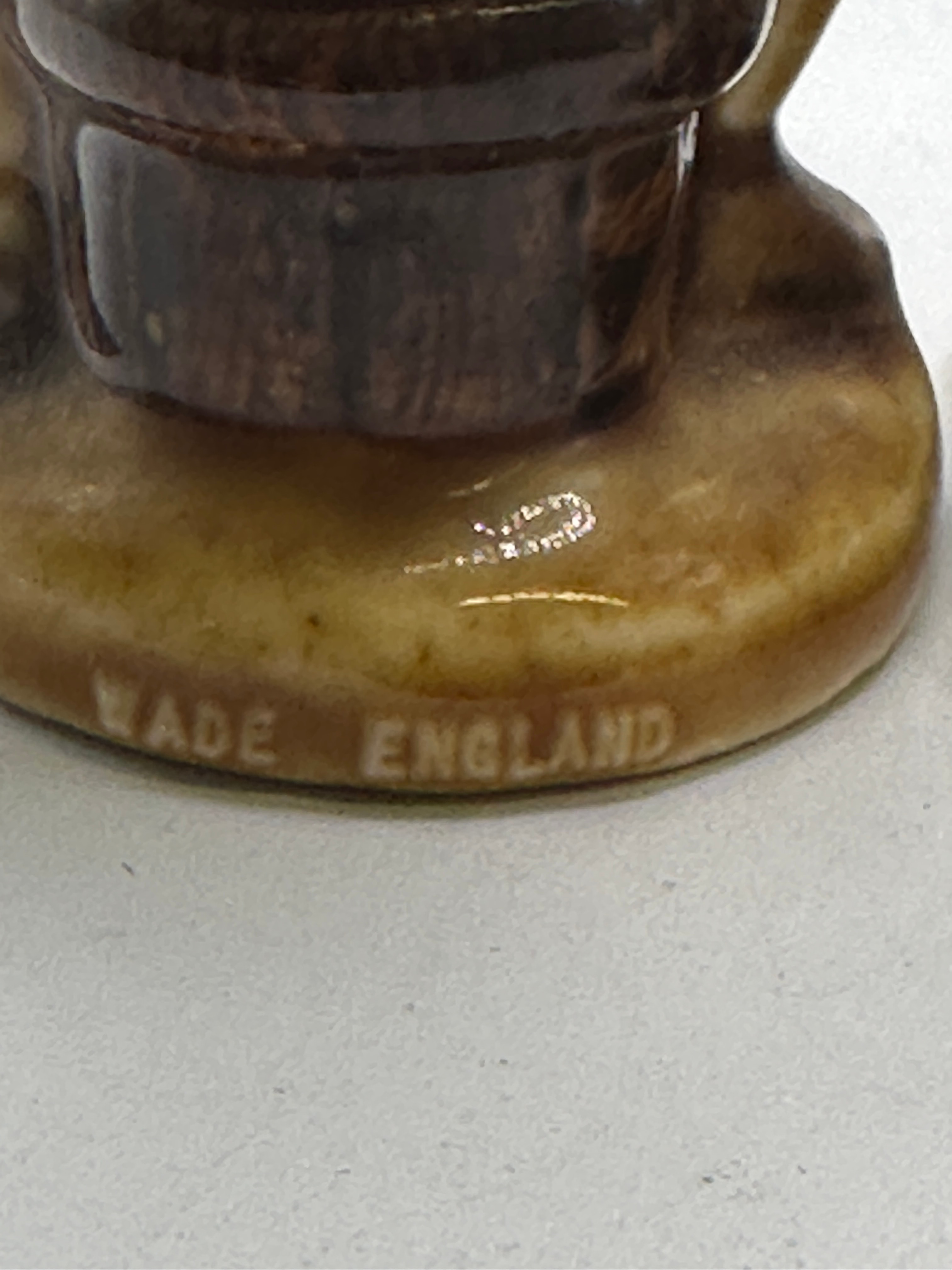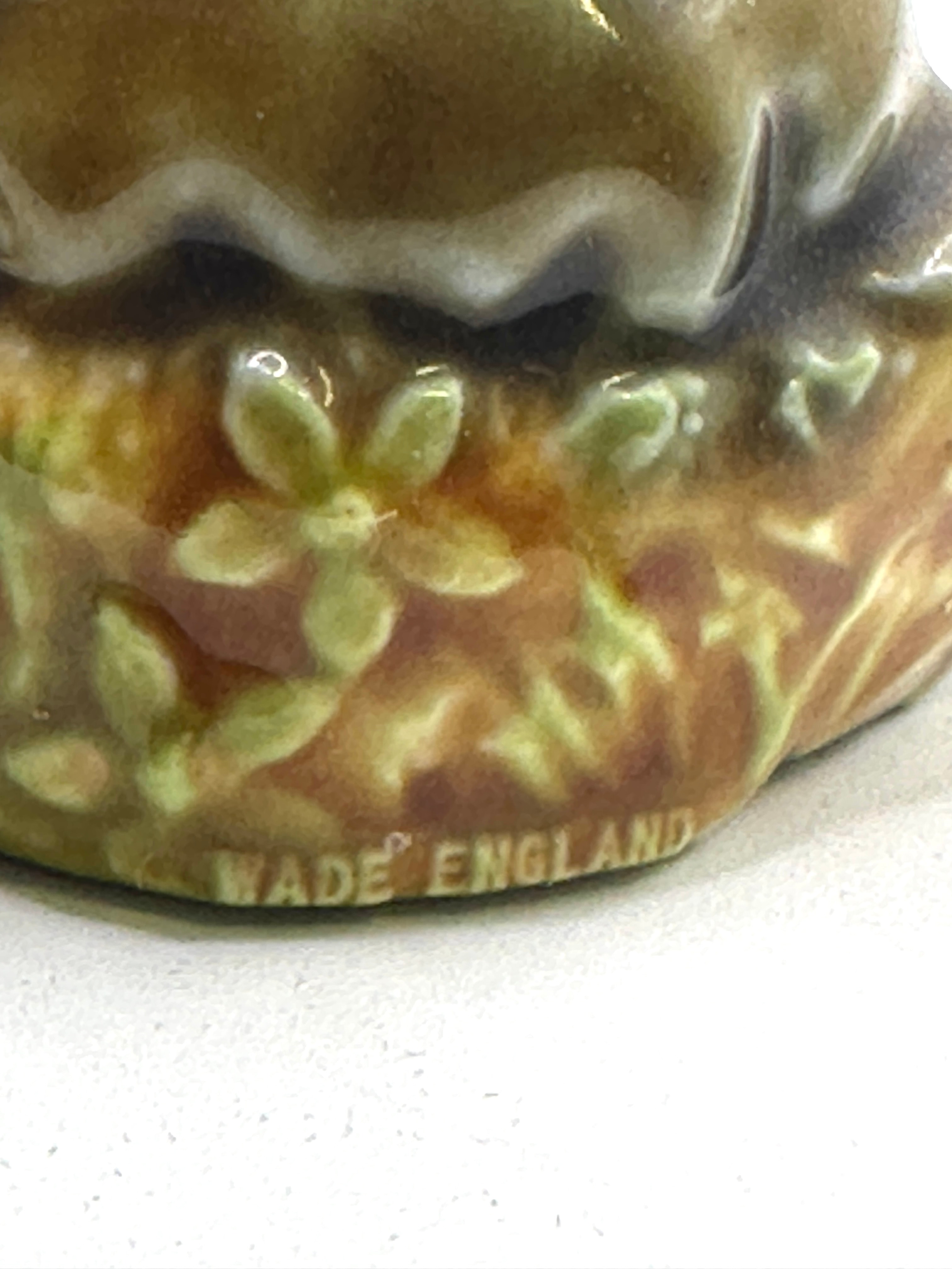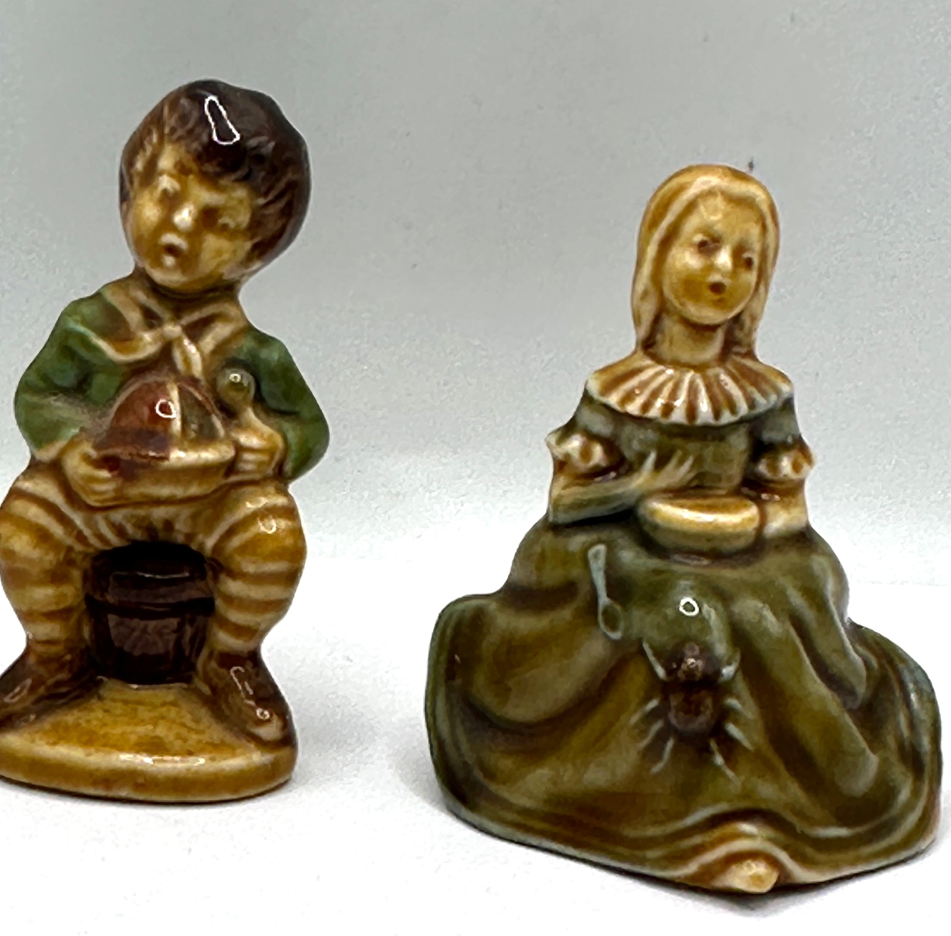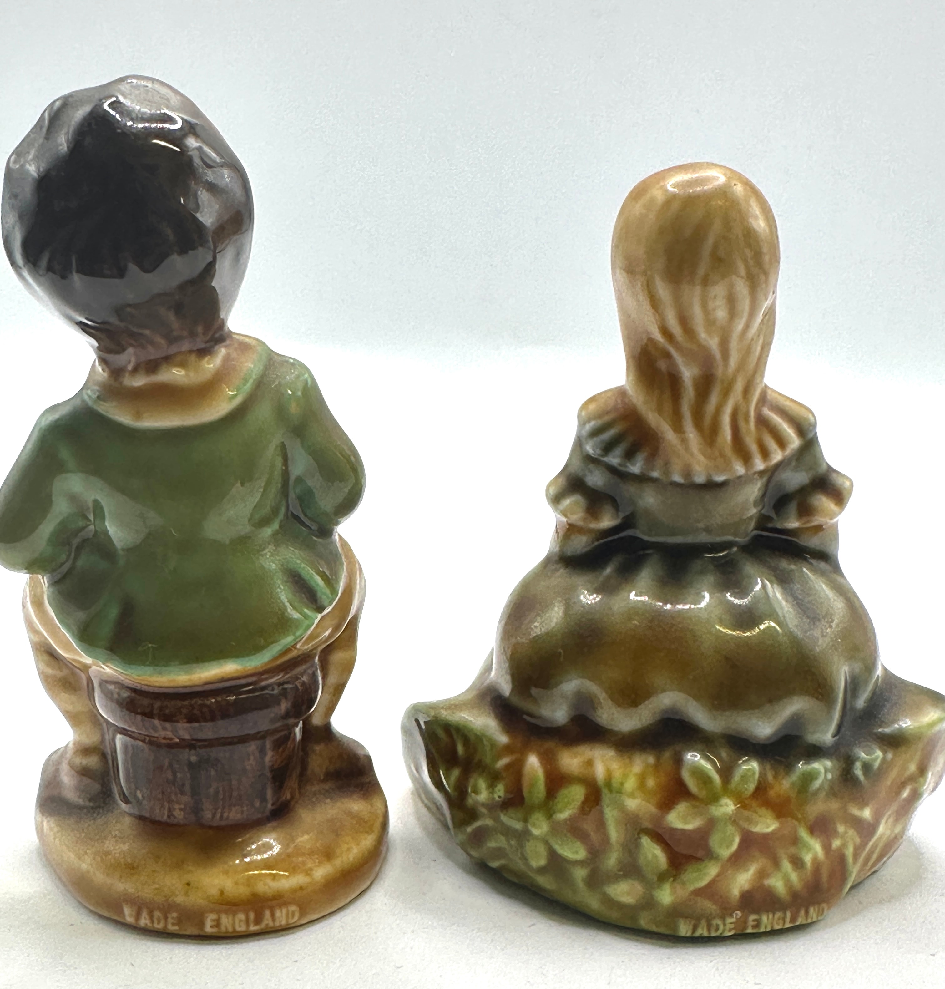 A pair of glazed ceramic figurines by Wade, from their ‘Whimsies’ Nursery Rhyme collection, depicting Little Miss Muffet and a companion character. The figurines are rendered in an illustrative style with an earthy color palette of greens, browns, and skin tones. The boy is shown seated on a barrel or stool, holding a small pot or bowl. The girl, identified as Little Miss Muffet, is seated wearing a dress with a ruffled collar, holding a small bowl, and features a molded spider or insect on her skirt. Each figurine’s base is impressed with ‘WADE ENGLAND’.