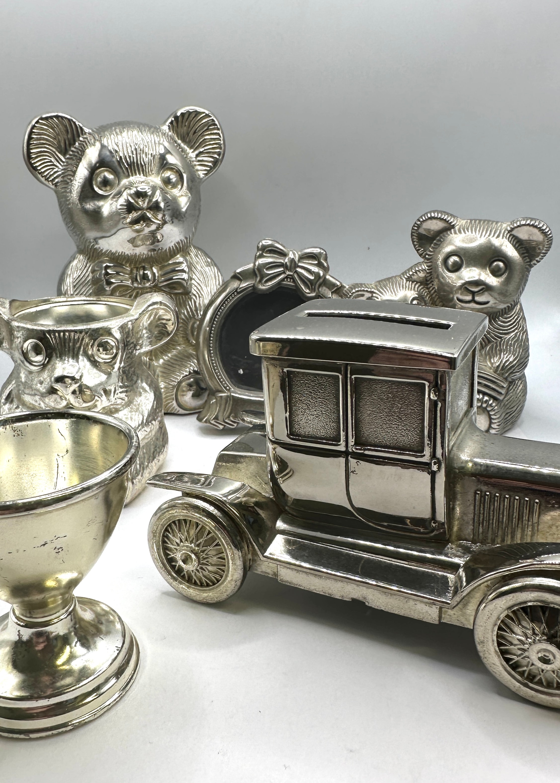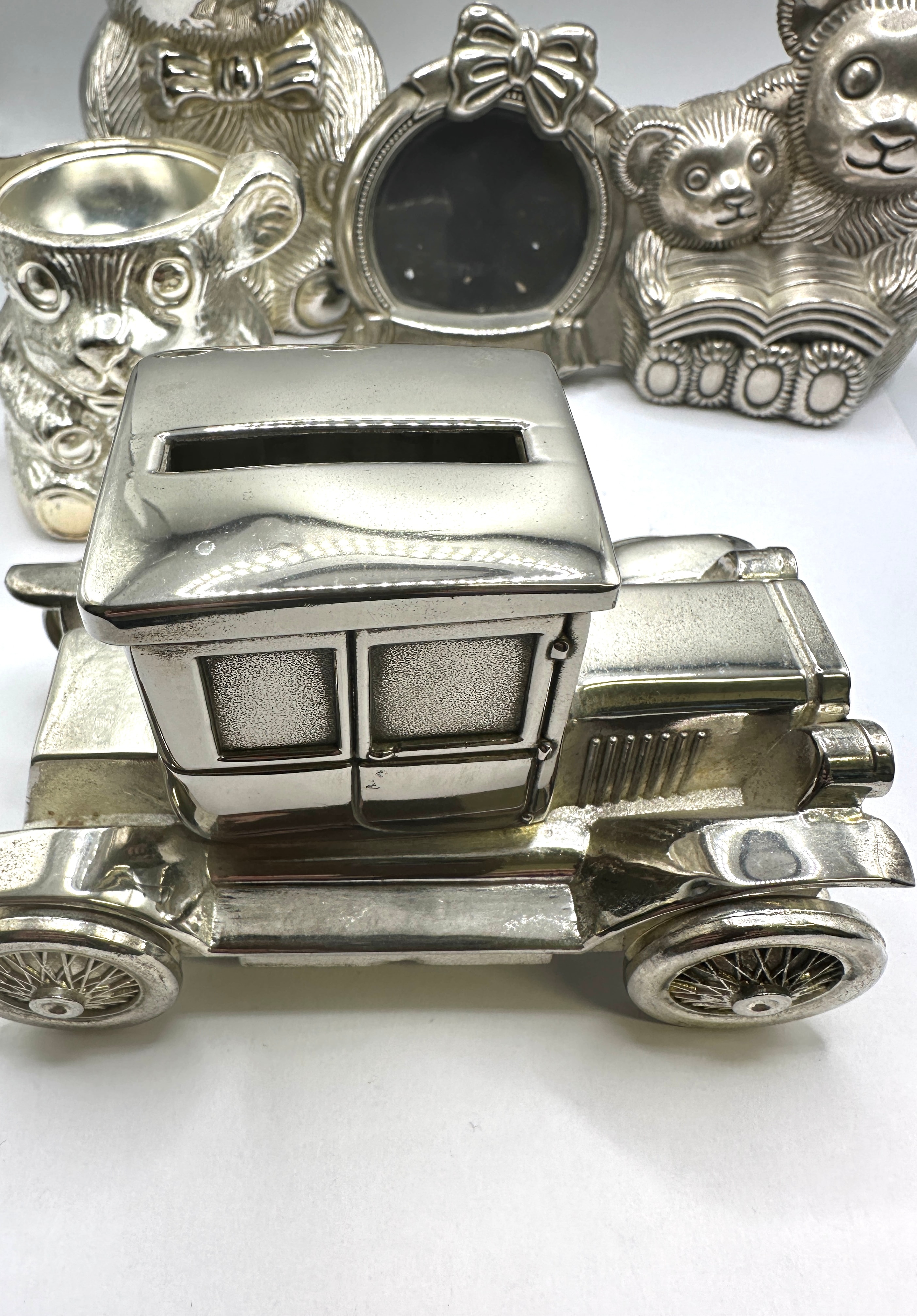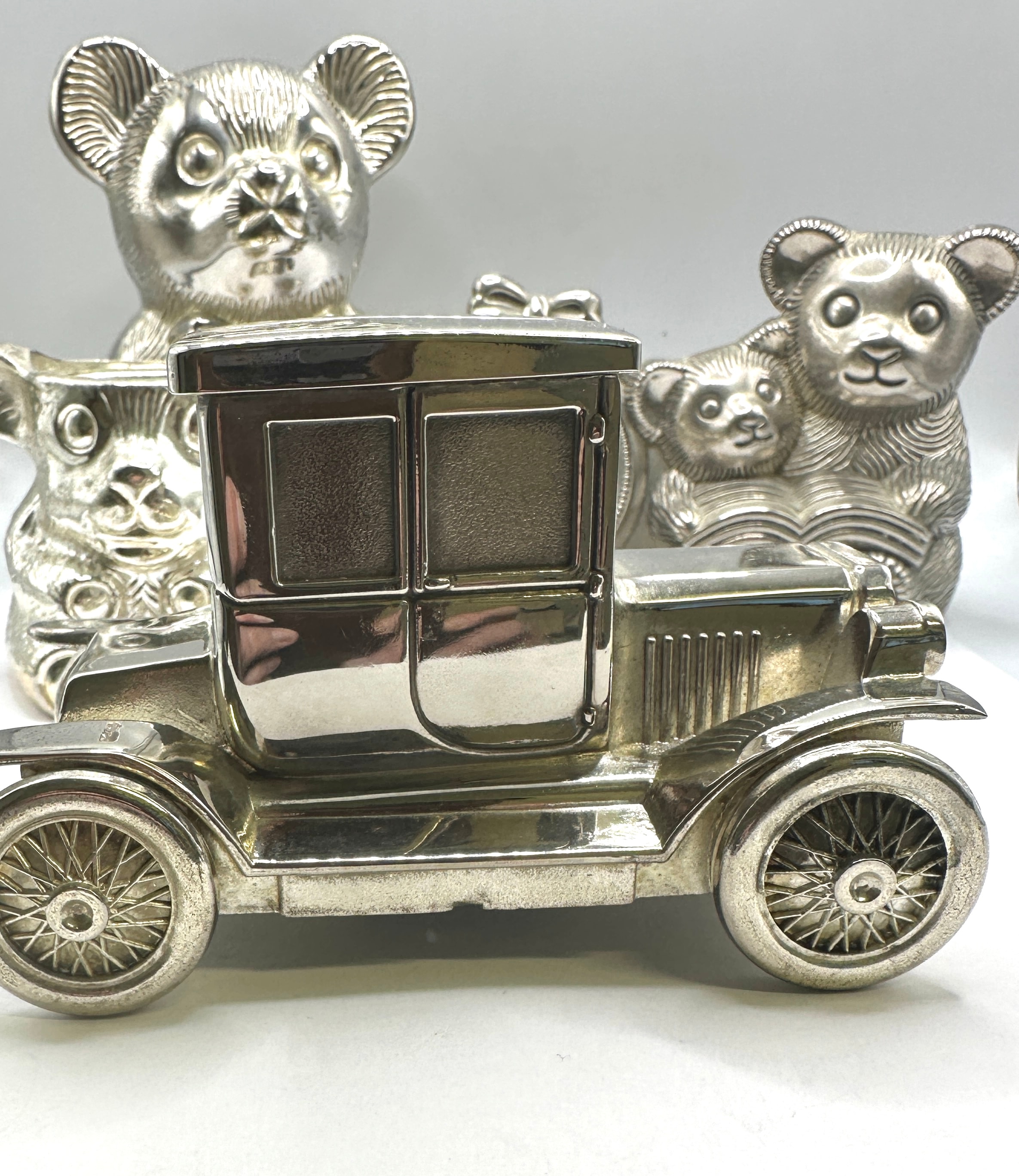 A group of five decorative objects crafted from silver-toned metal, featuring a cohesive novelty aesthetic. The collection comprises a large, seated teddy bear figurine with a bow tie, a vintage silverplated Ford Model T Coupe Car Coin Bank equipped with a coin slot on top, a smaller seated bear open container, an oval picture frame adorned with a bow and flanked by two bears (one holding an open book), and a single pedestal-style egg cup. The car’s design suggests an early to mid-20th-century aesthetic. No discernible manufacturer’s marks or textual inscriptions are visible on any of the items.