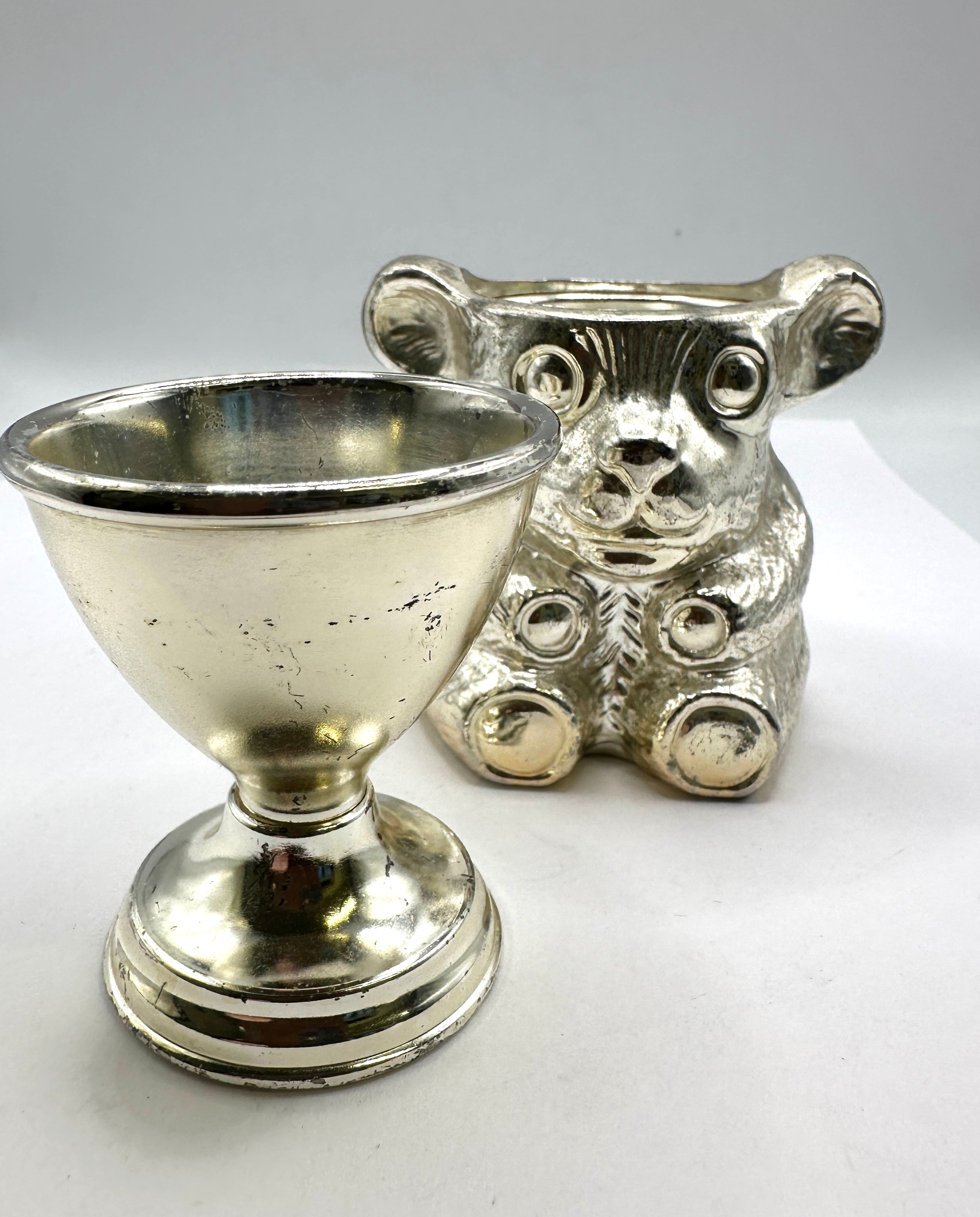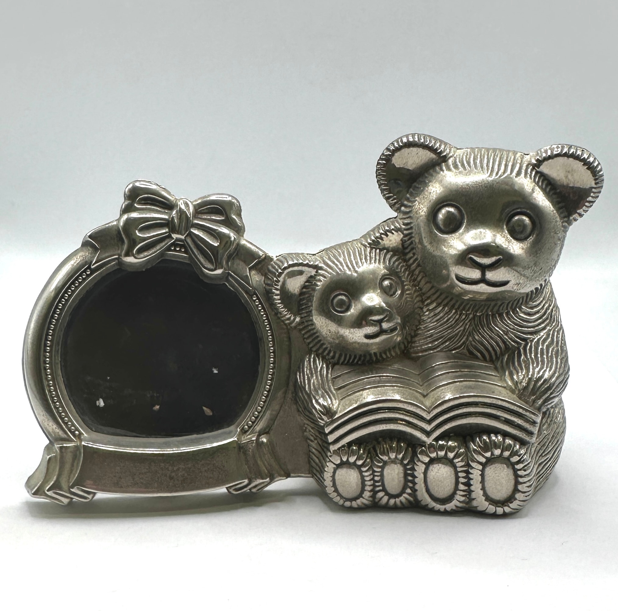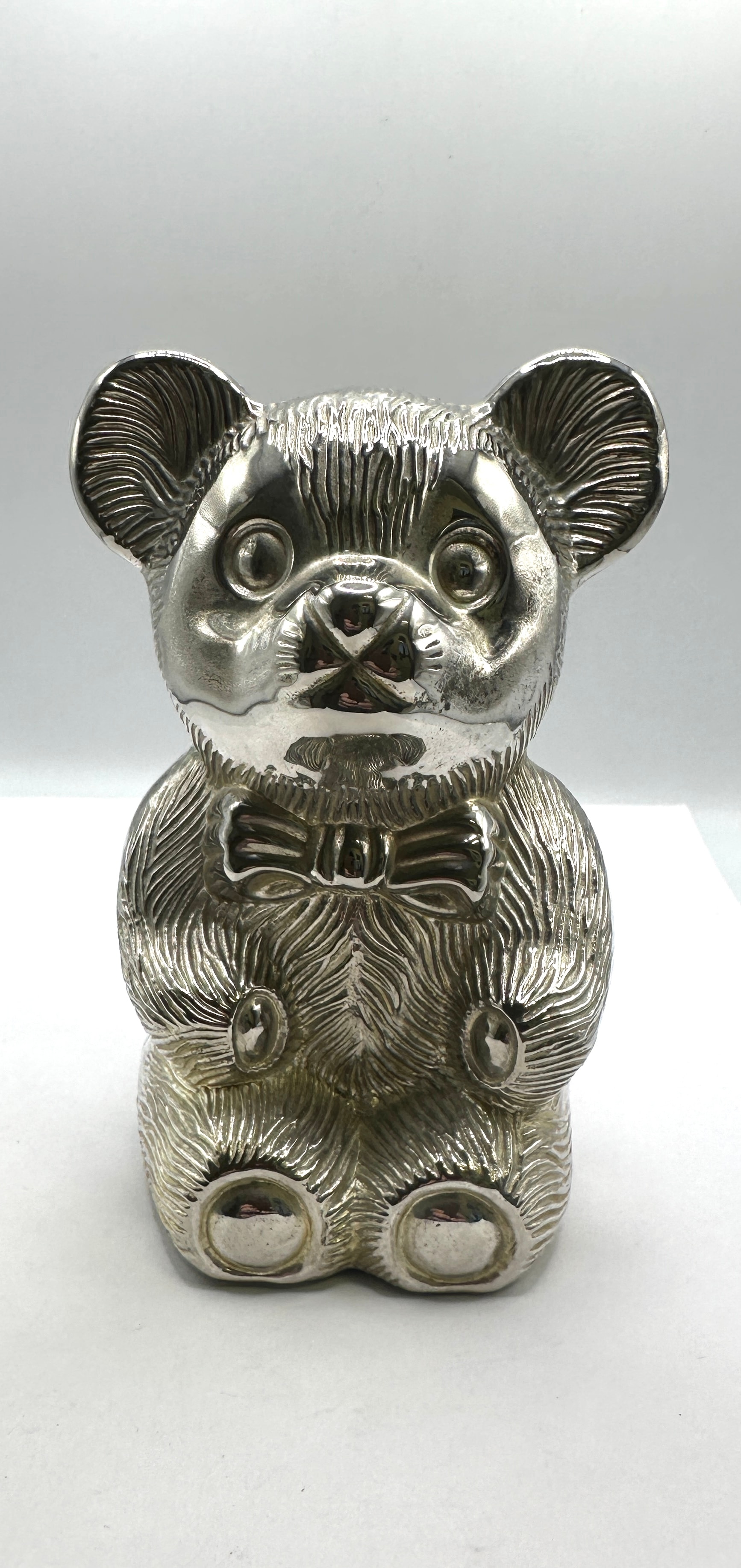 A group of five decorative objects crafted from silver-toned metal, featuring a cohesive novelty aesthetic. The collection comprises a large, seated teddy bear figurine with a bow tie, a vintage silverplated Ford Model T Coupe Car Coin Bank equipped with a coin slot on top, a smaller seated bear open container, an oval picture frame adorned with a bow and flanked by two bears (one holding an open book), and a single pedestal-style egg cup. The car’s design suggests an early to mid-20th-century aesthetic. No discernible manufacturer’s marks or textual inscriptions are visible on any of the items.