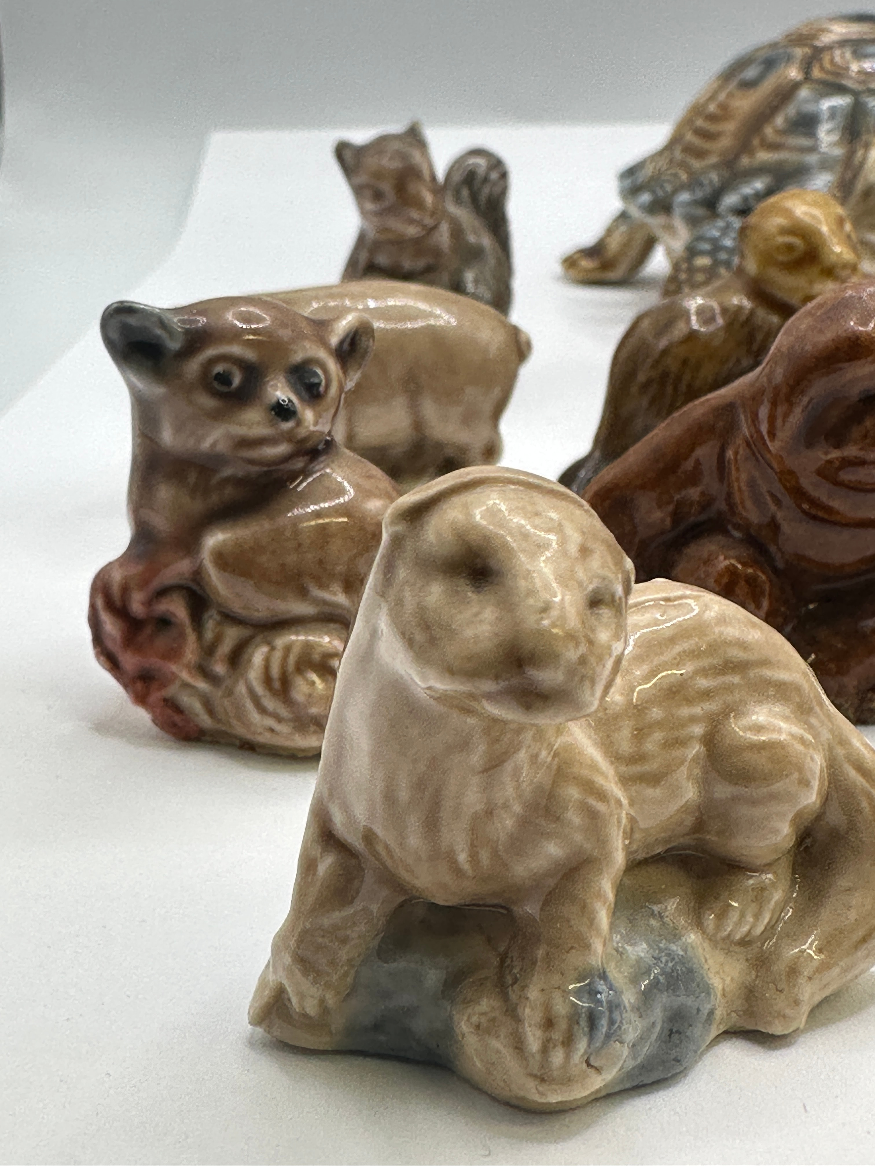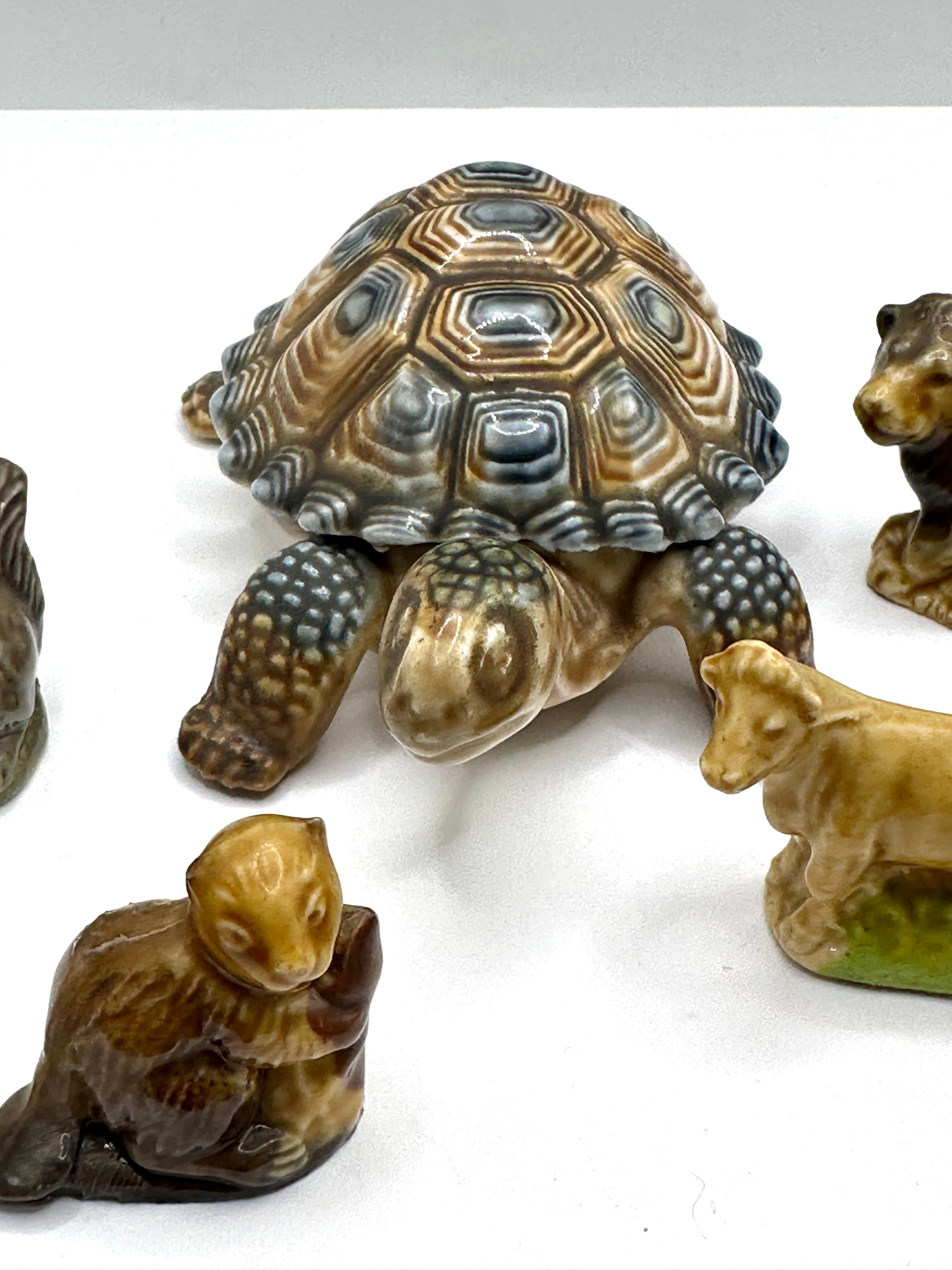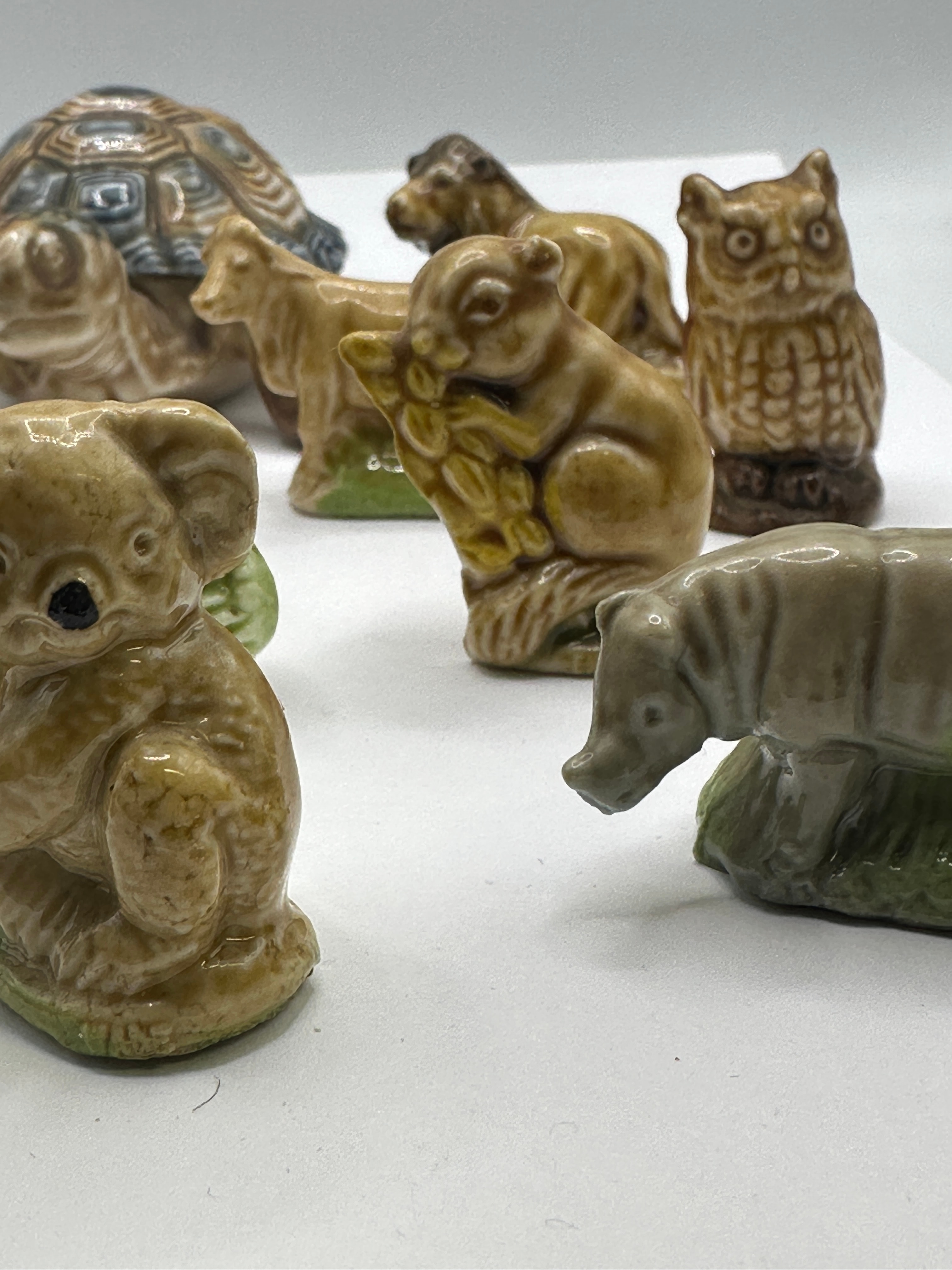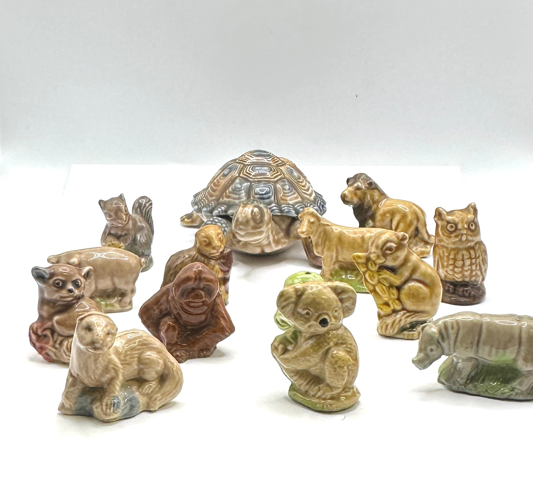 A collection of 14 Wade Red Rose Tea Whimsies animal figurines, made in England. These glazed ceramic figures are predominantly rendered in earthy tones of brown, tan, and muted greens, exhibiting a charming, somewhat simplified style. The collection depicts a variety of creatures including a large tortoise, squirrels, an owl, a koala, a hippopotamus, a cow, felines, and primates. An impressed mark “WADE PORCELAIN MADE IN ENGLAND” above the numeral “5” is visible on the base of one figurine.