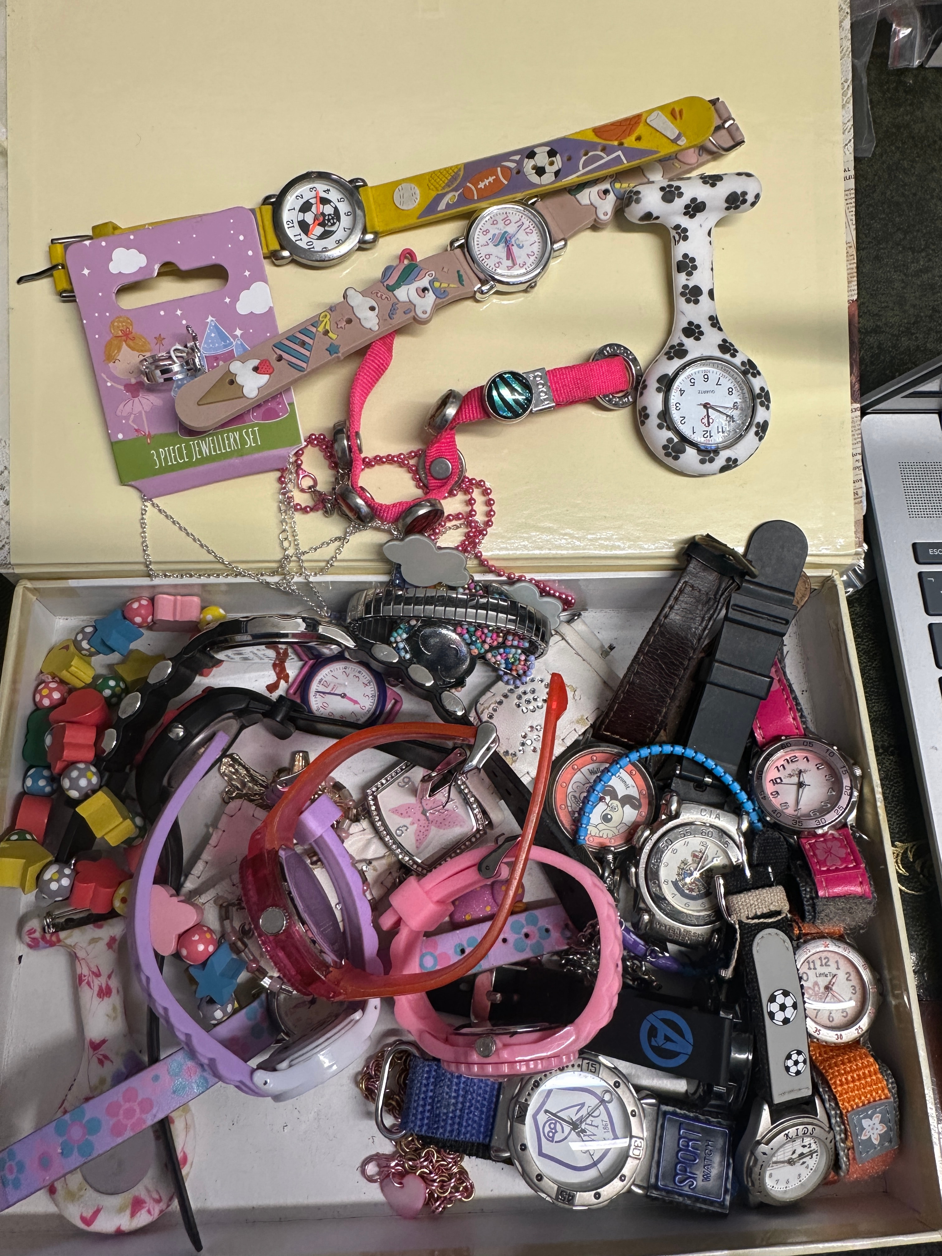 A large collection of modern novelty and children’s watches, accompanied by various pieces of costume jewelry. The wristwatches predominantly feature cases of base metal and plastic, with straps made from plastic, silicone, fabric, and faux leather, presented in a wide array of colors and designs. Motifs include unicorns, sports themes (such as soccer balls, footballs, and tennis rackets), flowers, and cartoon characters. One item is a white and black paw print patterned nurse’s fob watch. Some items remain on their original retail packaging, including a pink card marked “3 PIECE JEWELLERY SET.” Visible text markings on watch dials and straps include “QUARTZ,” “Little T,” “SPORT WATCH,” “KIDS,” “AVENGERS” (logo), “WFC” (logo), and “WATER RESISTANT” (partially visible).