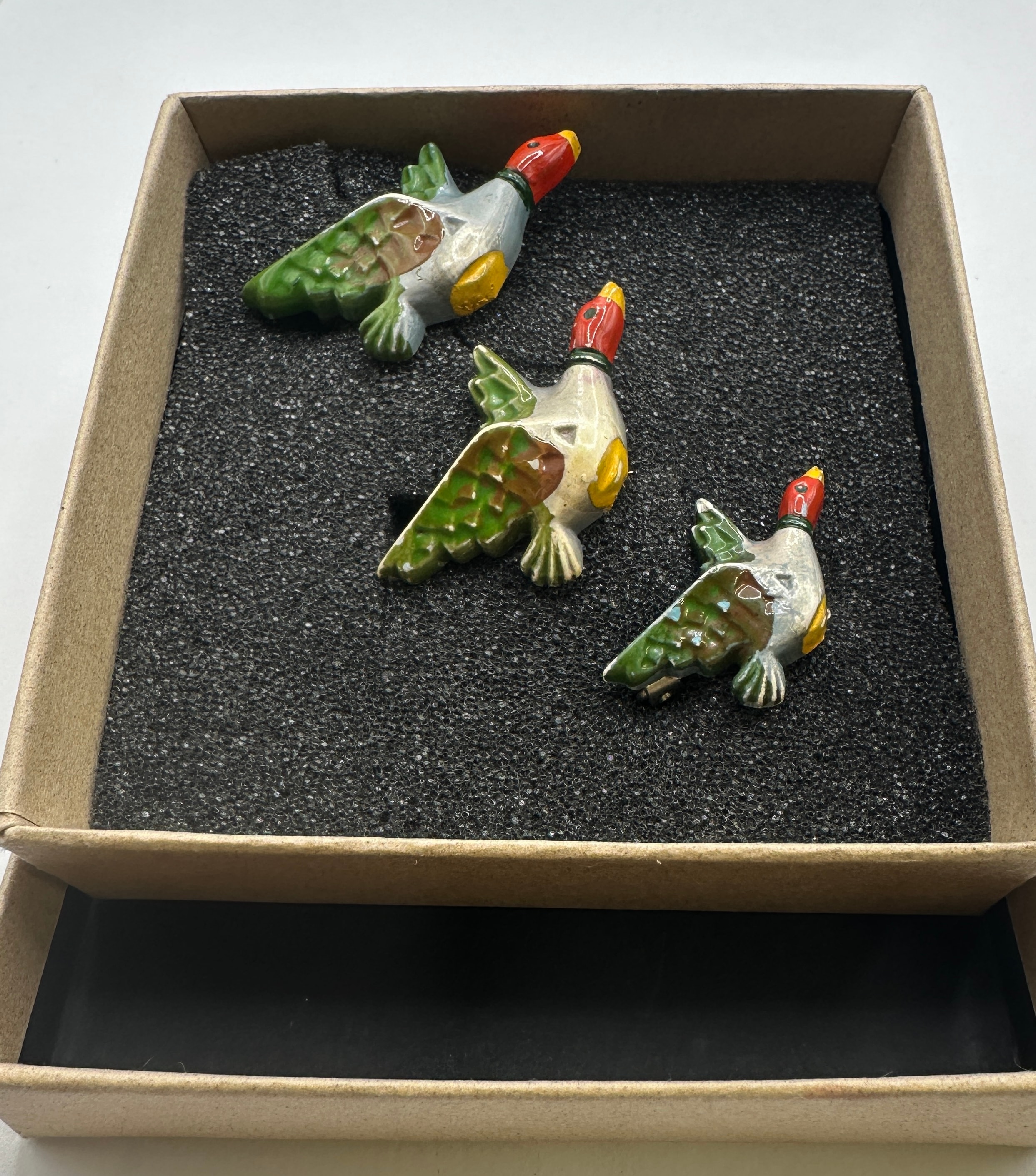 A set of three vintage ceramic flying duck brooches, depicting stylized waterfowl consistent with Red Breasted Mergansers. Each brooch features a bright red head, a pale body, distinct green wings, and yellow detailing. They possess a glossy finish. The brooches are housed within a simple brown cardboard box with a fitted black foam insert.