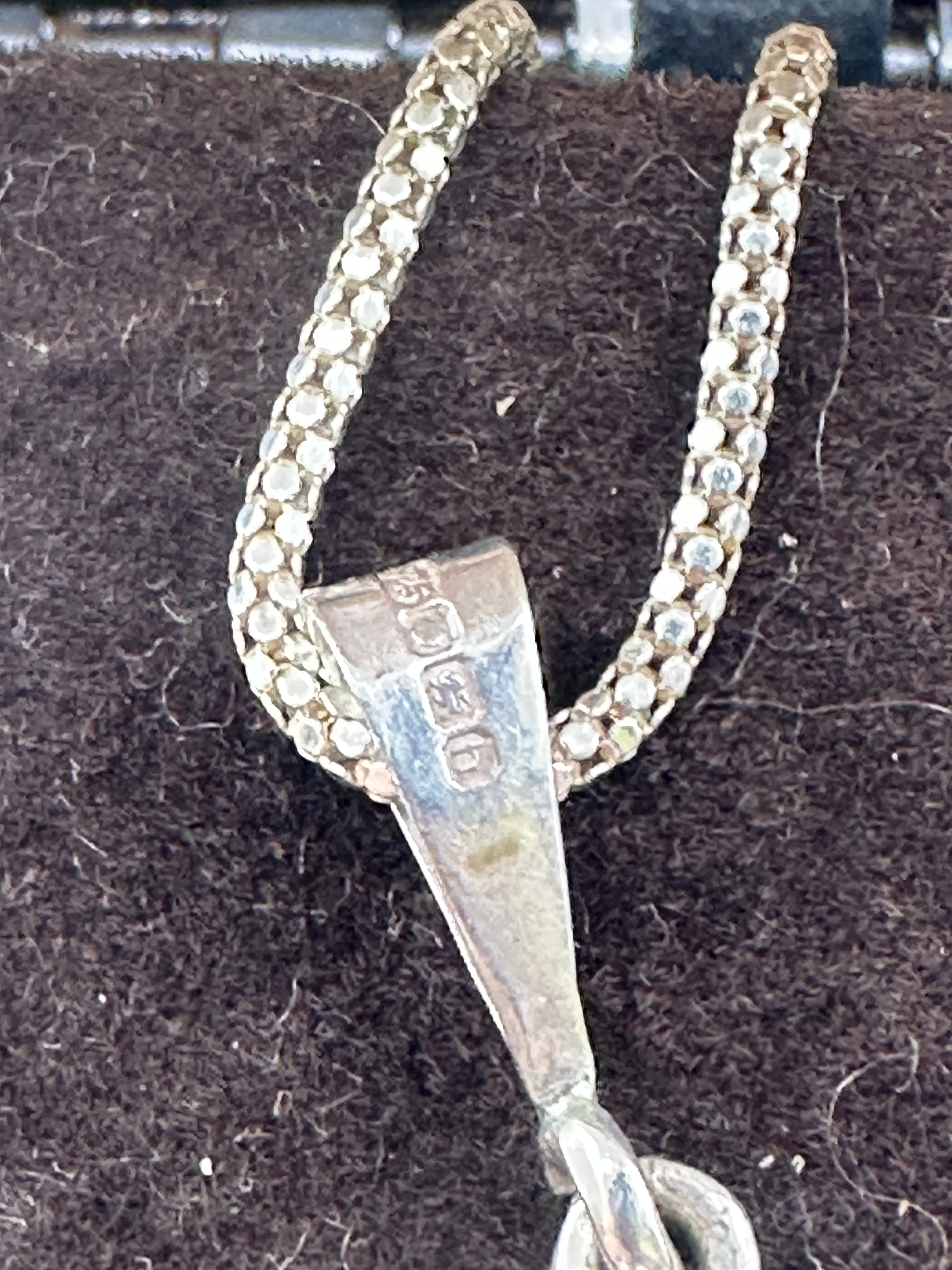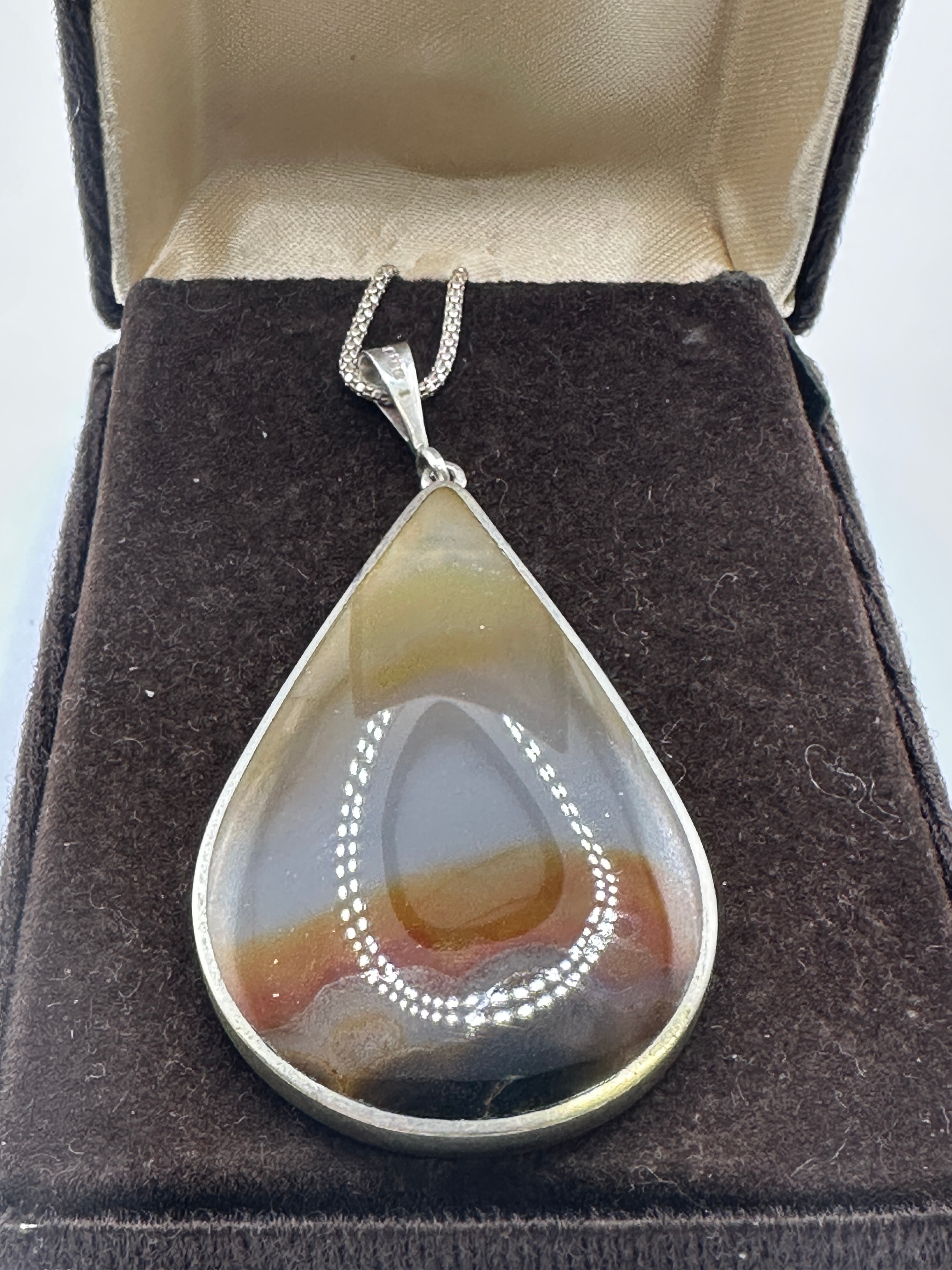 A sterling silver pendant and chain set, featuring a large, polished, tear-drop shaped cabochon stone. The stone displays natural banded patterns in earthy tones of green, brown, and off-white, consistent with agate. It is set within a simple silver-toned bezel. The bail is stamped ‘925’, confirming sterling silver, alongside additional less discernible hallmarks. The accompanying chain is a textured silver-toned link style. The ensemble is presented in a velvet-lined box.