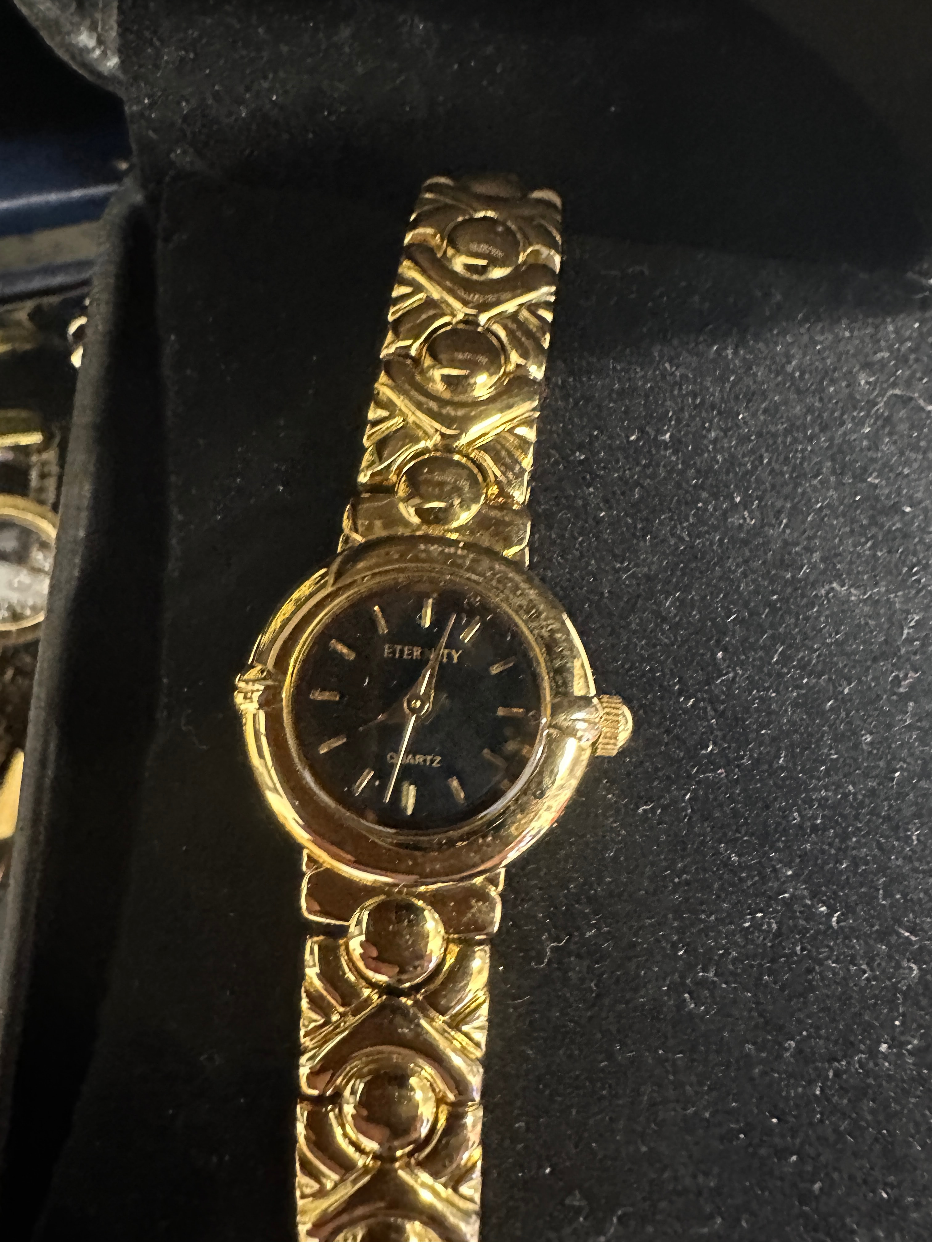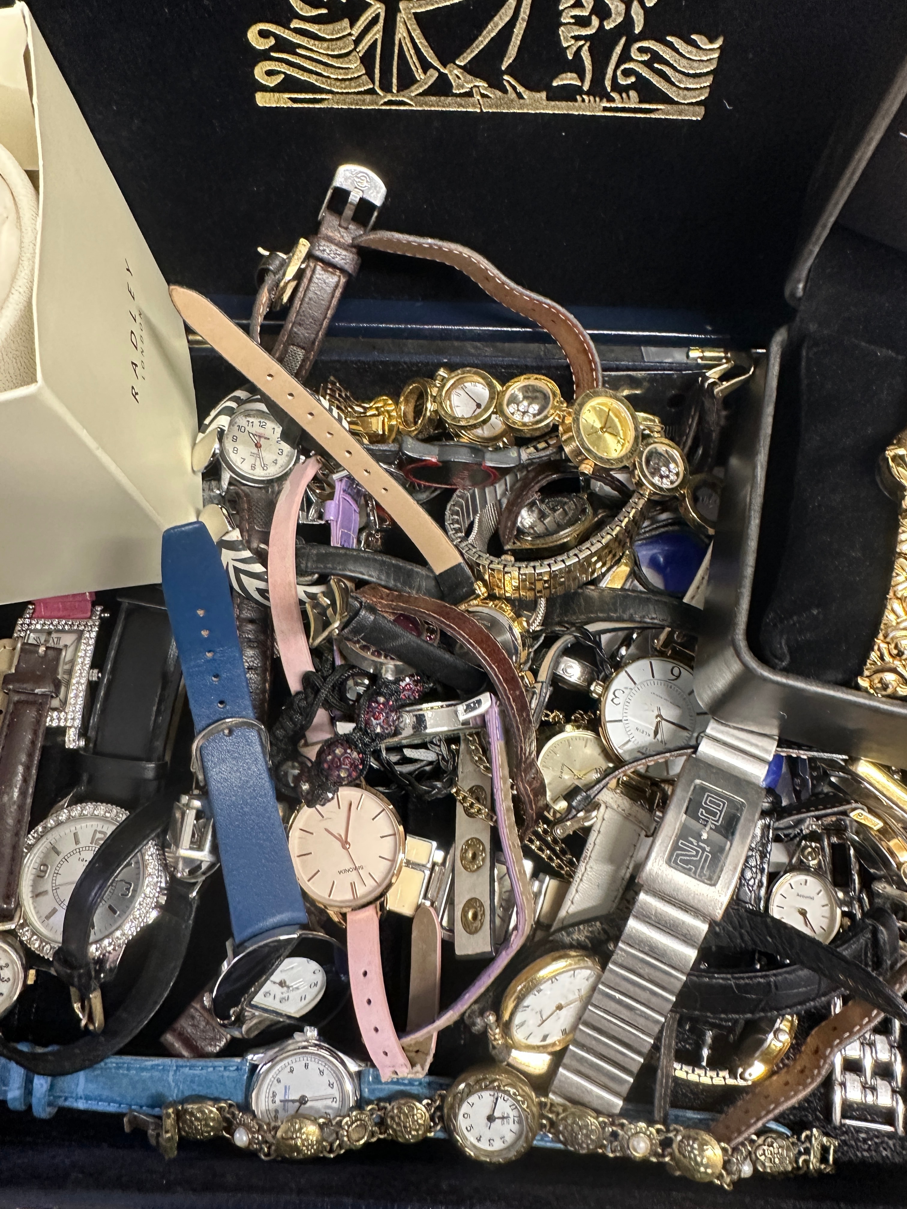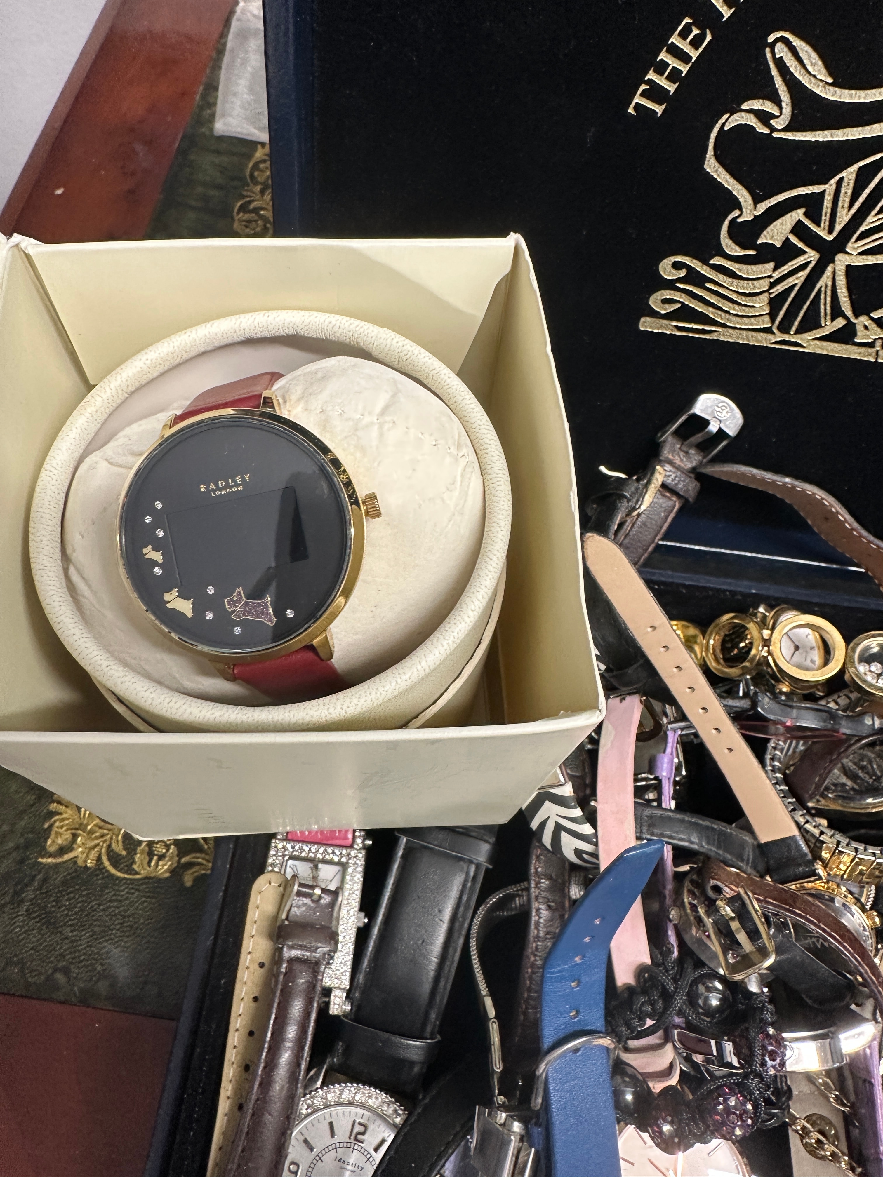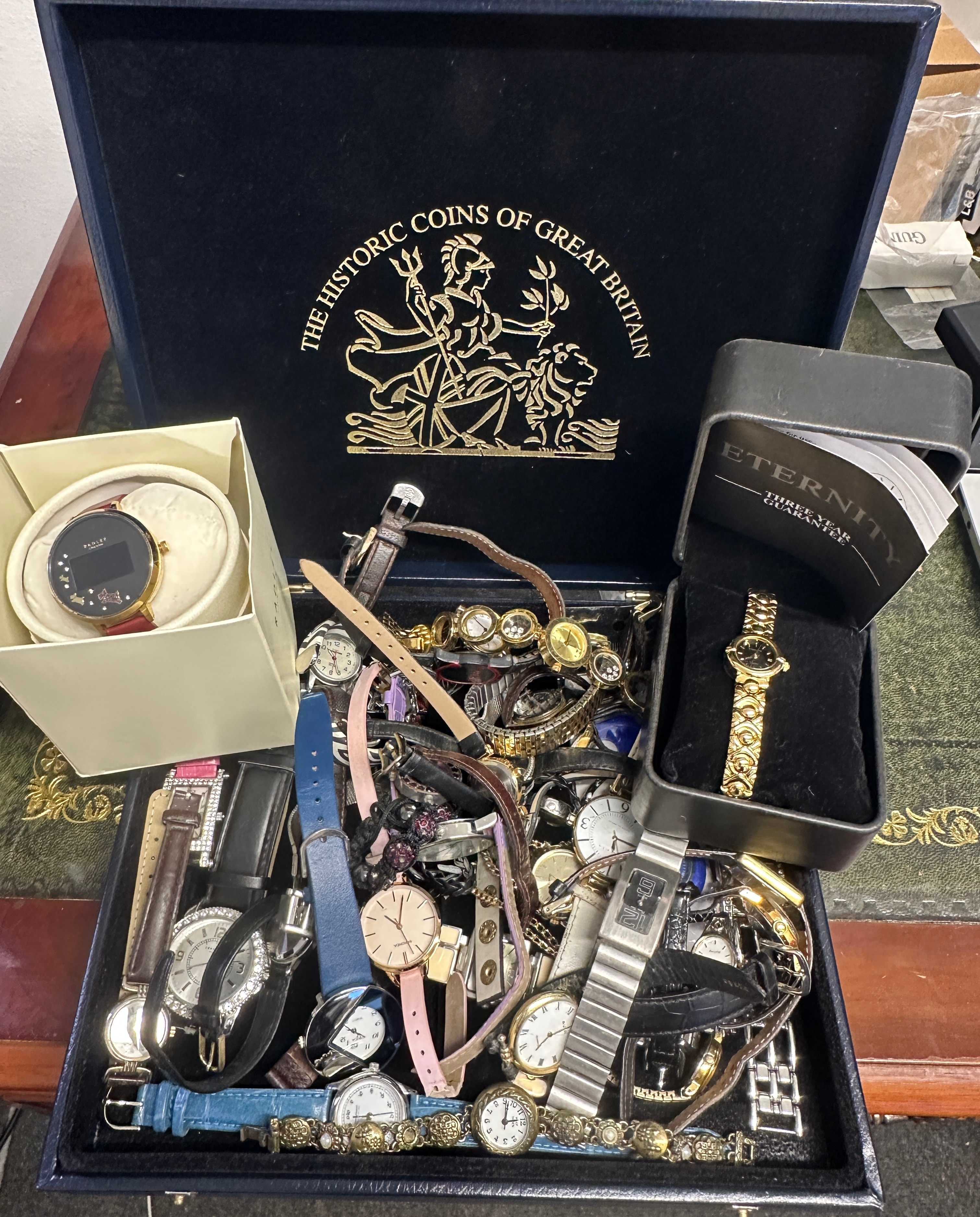 A collection of numerous wristwatches, primarily ladies’ styles, presented within a large dark blue presentation box embossed with “THE HISTORIC COINS OF GREAT BRITAIN” and a classical allegorical scene. The collection comprises a mixed assortment of analog quartz movements, featuring various case designs, dial configurations including Arabic numerals, Roman numerals, and simple indices. Strap materials include leather in multiple colors (red, blue, pink, brown) and metal bracelets with both gold-tone and silver-tone finishes. Notable pieces include a “RADLEY LONDON” watch with a black dial featuring a distinctive dog motif and a red strap, housed in its original white cardboard box, and a gold-tone “ETERNITY QUARTZ” watch with a black dial and decorative link bracelet, presented in a black velour-lined box.