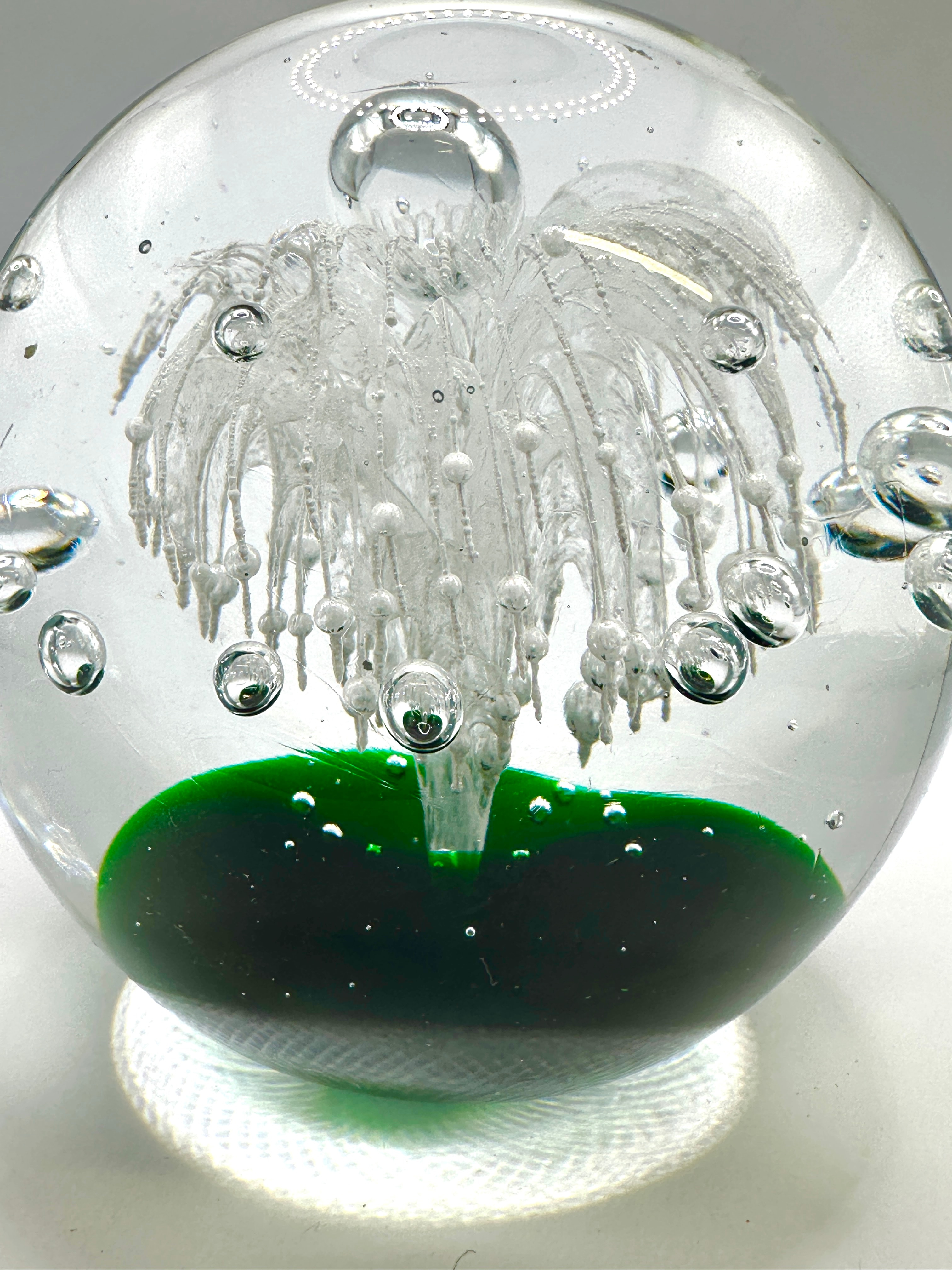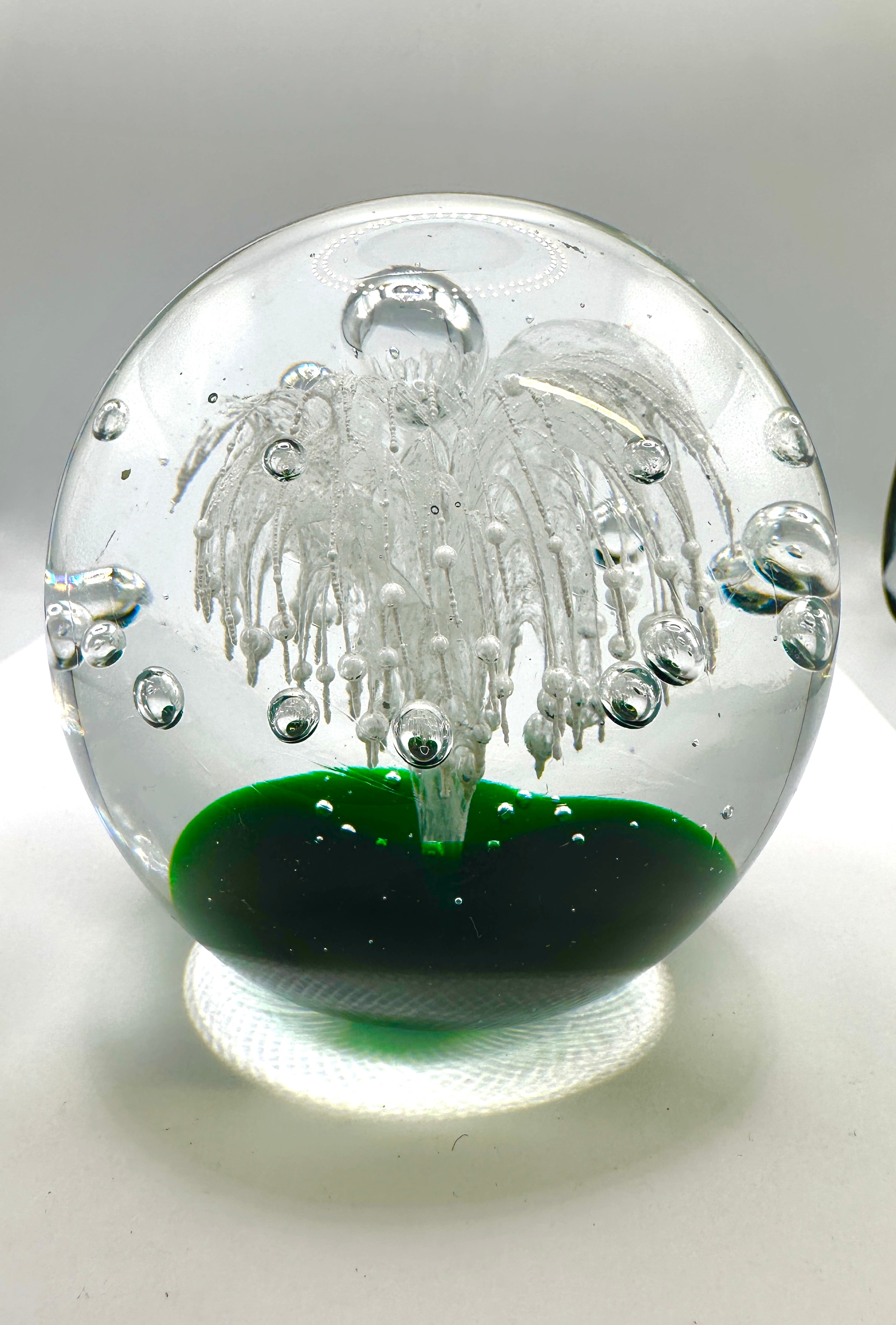 A Caithness Moonflower paperweight, spherical in form, composed of clear glass encasing an intricate internal design. The interior features a solid, dark emerald green disk at the base, from which a stylized fountain-like motif of numerous white, thin glass filaments or tendrils rises upwards. Various sizes of trapped air bubbles are scattered throughout the clear glass and integrated within the white design. No discernible text, signatures, or maker’s marks are visible.
