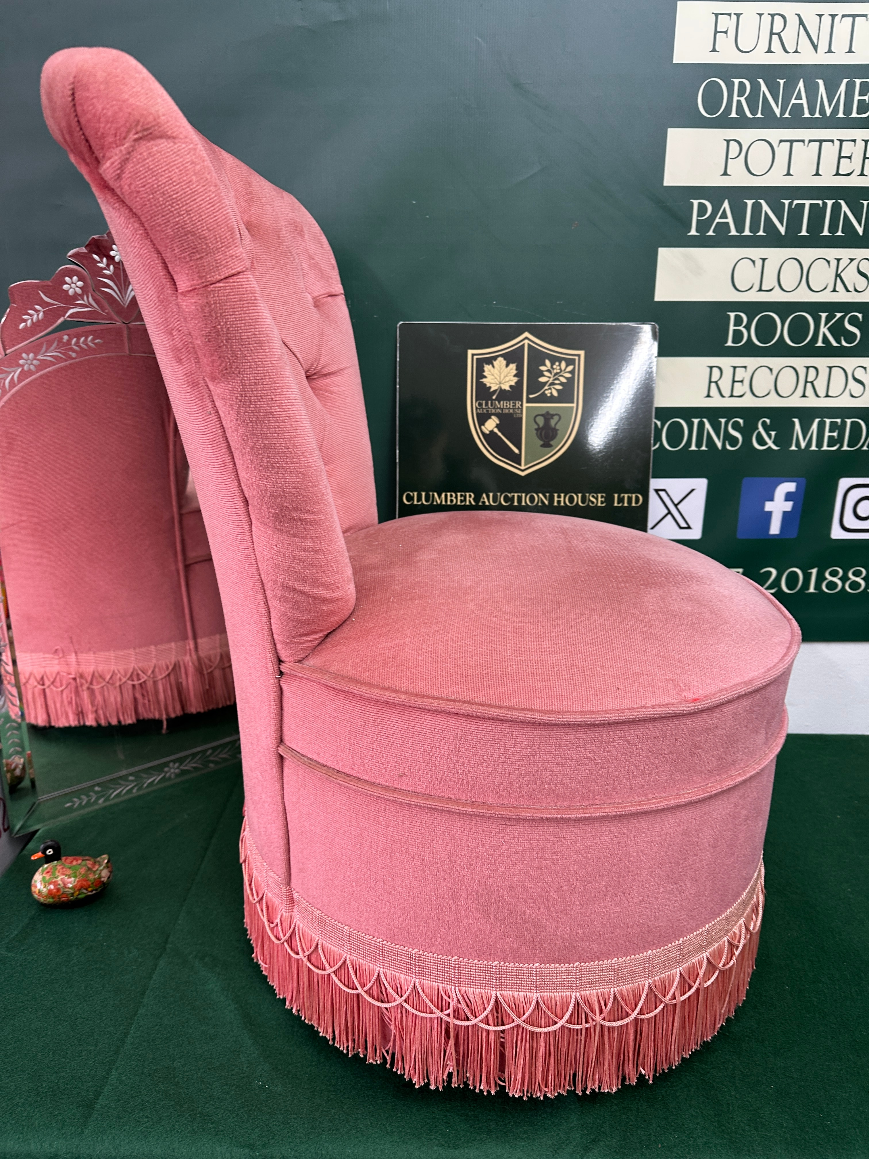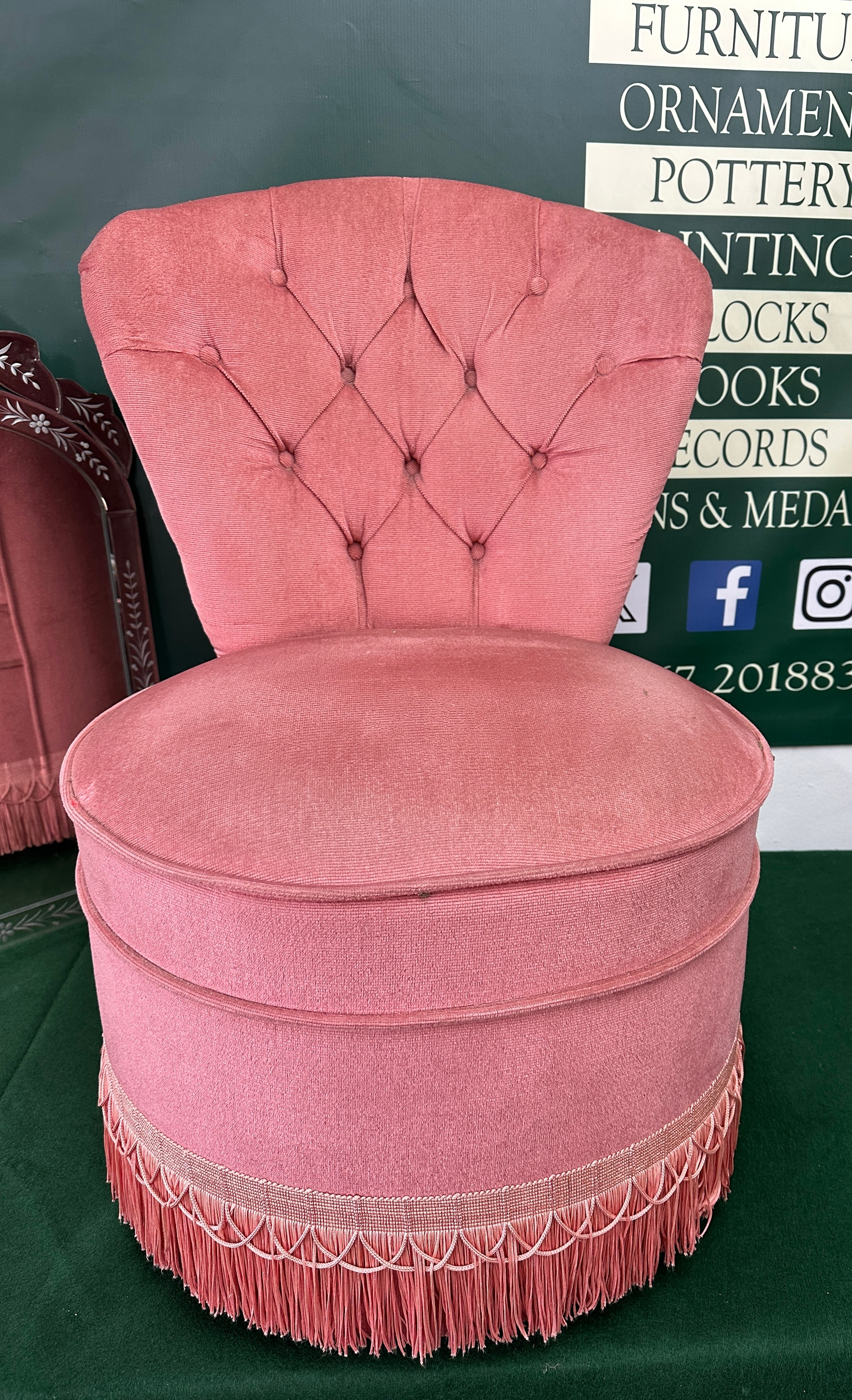 A Napoleon III Style pink velvet upholstered boudoir chair. The low-back chair features a button-tufted backrest and a rounded, cushioned seat. It is covered in a pink textile, likely velvet or velveteen, and finished with a decorative fringed trim around its base.