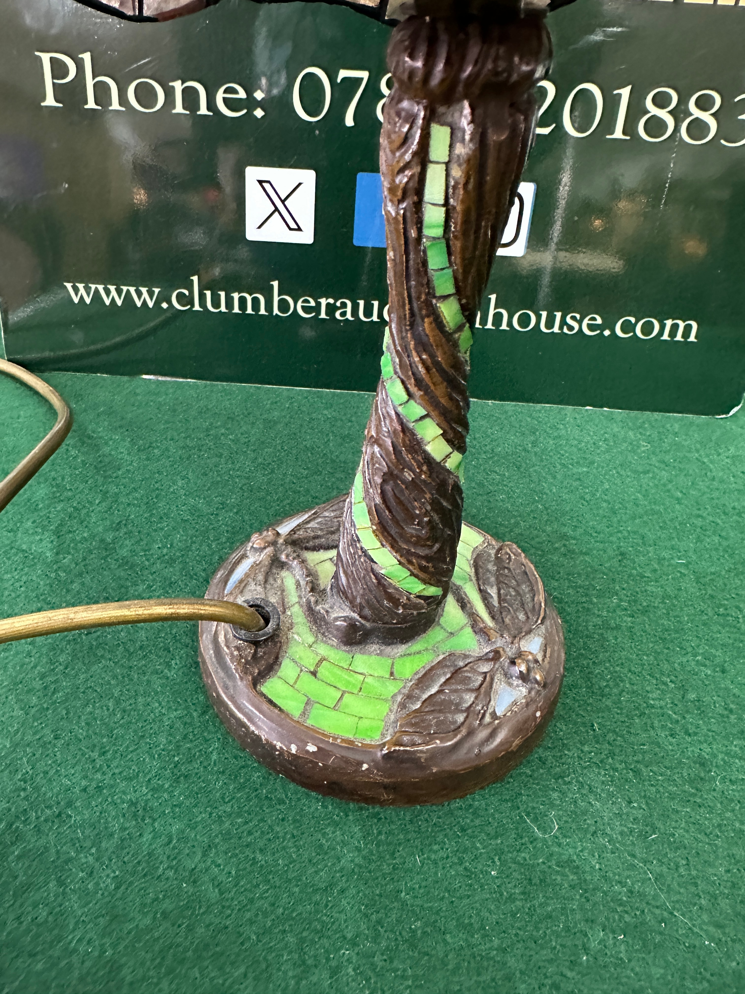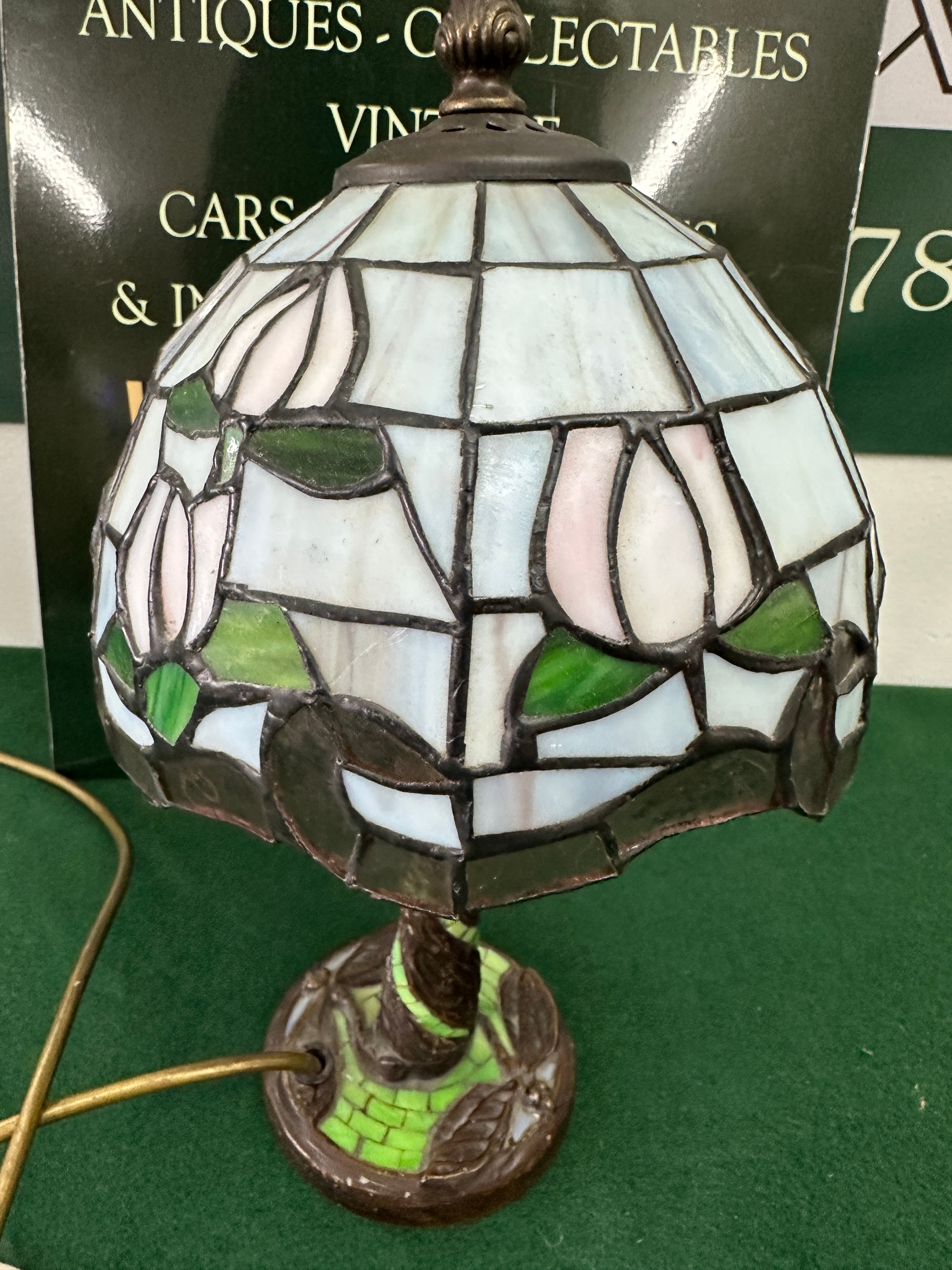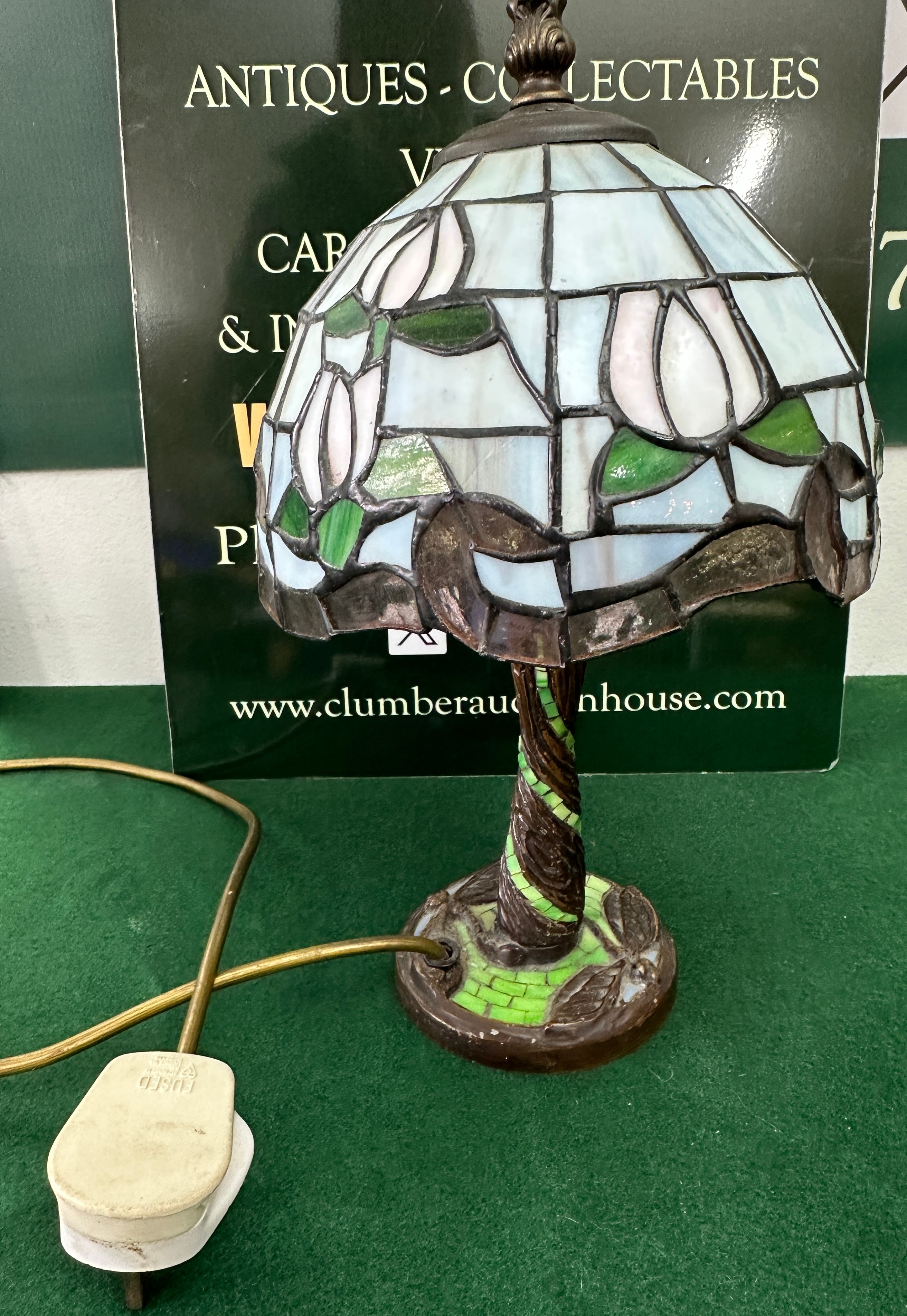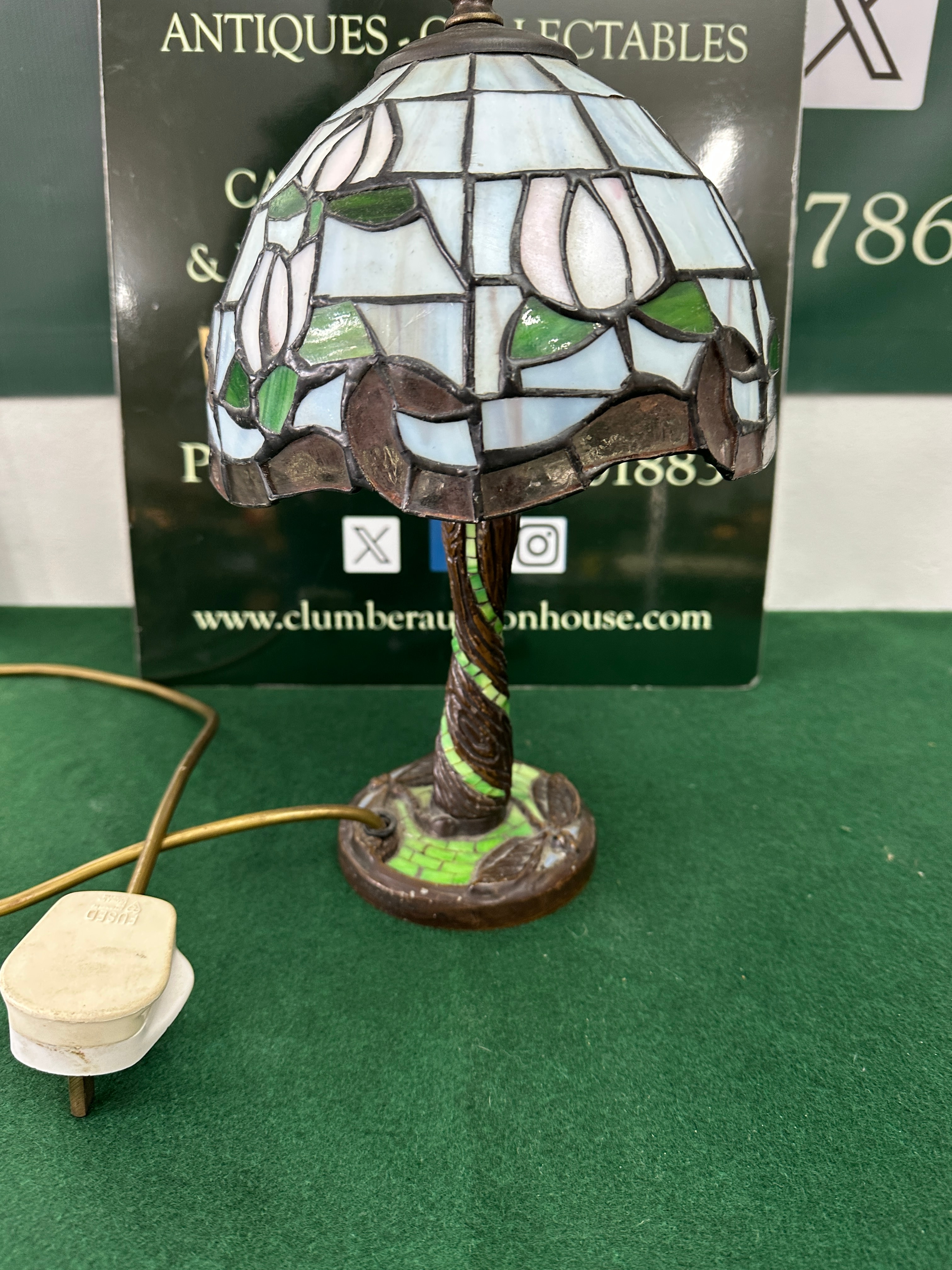A Meyda Roseborder Tiffany-style table lamp featuring a domed, leaded stained glass shade. The shade depicts a floral motif of white and pale pink tulip-like forms, green leaves, and a light blue/white geometric background, all outlined in dark leading. The lamp is supported by a dark, patinated metal base with a twisted, organic-shaped stem resembling a tree trunk or vine, incorporating a spiral green inlay. The circular foot is also decorated with complementary green elements and relief patterns. An attached brass-toned electrical cord connects to a cream-colored plug visibly marked “FUSED.”
