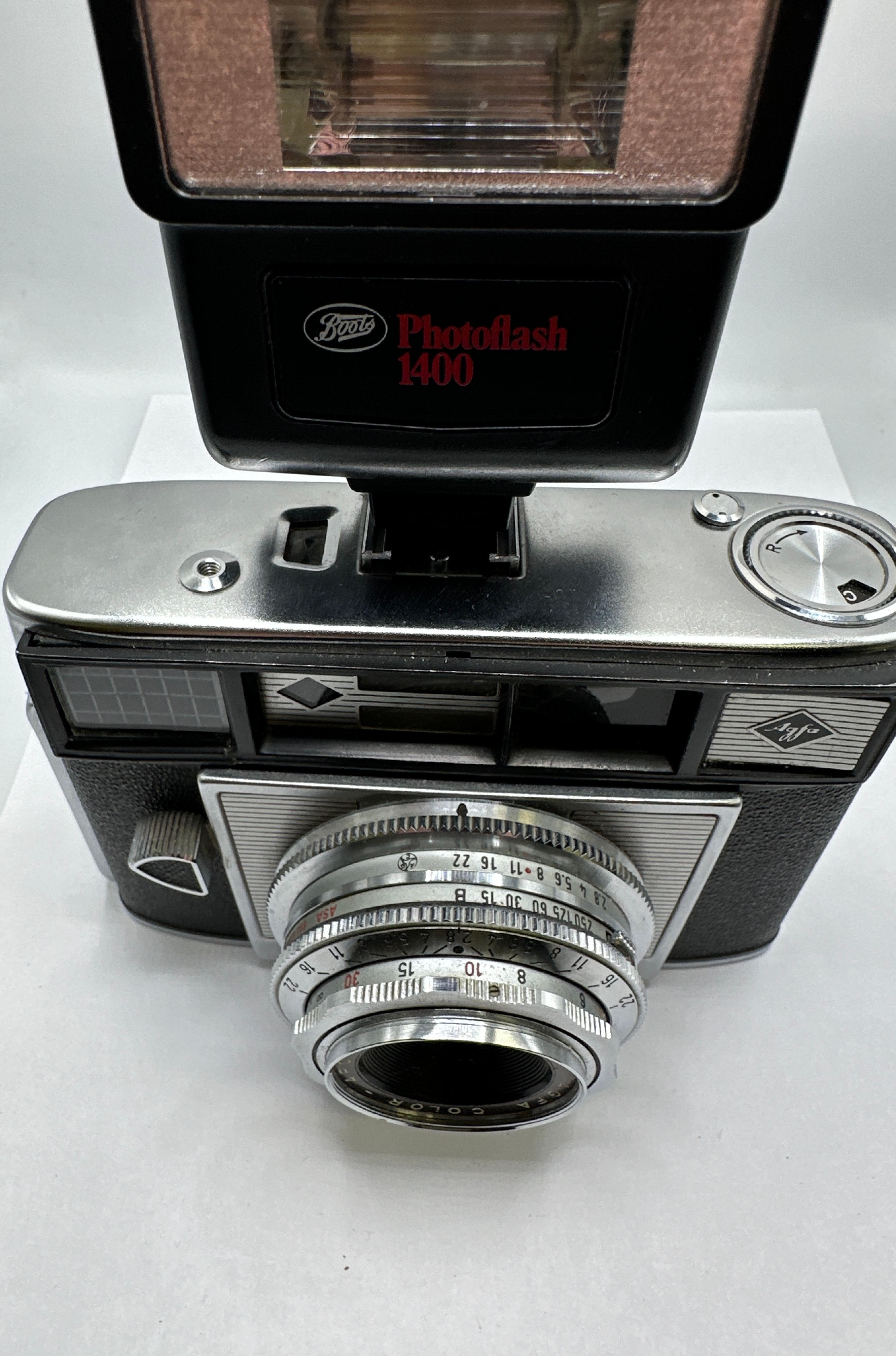 An Agfa Super Silette LK 35mm film camera, predominantly silver-tone metal with black textured body covering, featuring an “AGFA” logo on the front and “MADE IN GERMANY” stamped on the back. It is equipped with an “APOTAR COLOR” lens assembly displaying aperture and shutter speed markings. An attached black plastic electronic flash unit, branded “Boots PhotoFlash 1400” and marked “Made in Hong Kong,” sits in the camera’s hot shoe, featuring an exposure guide table and “off/on” and “ready” indicators.