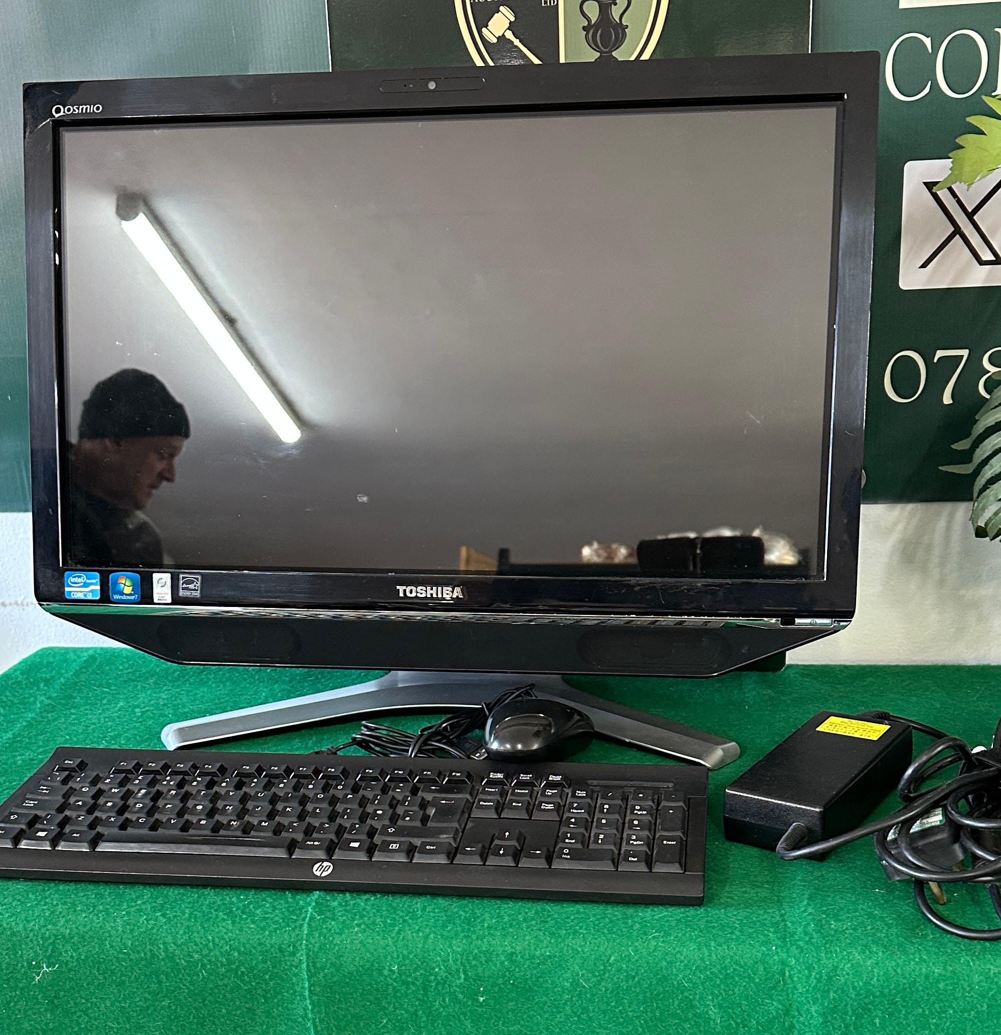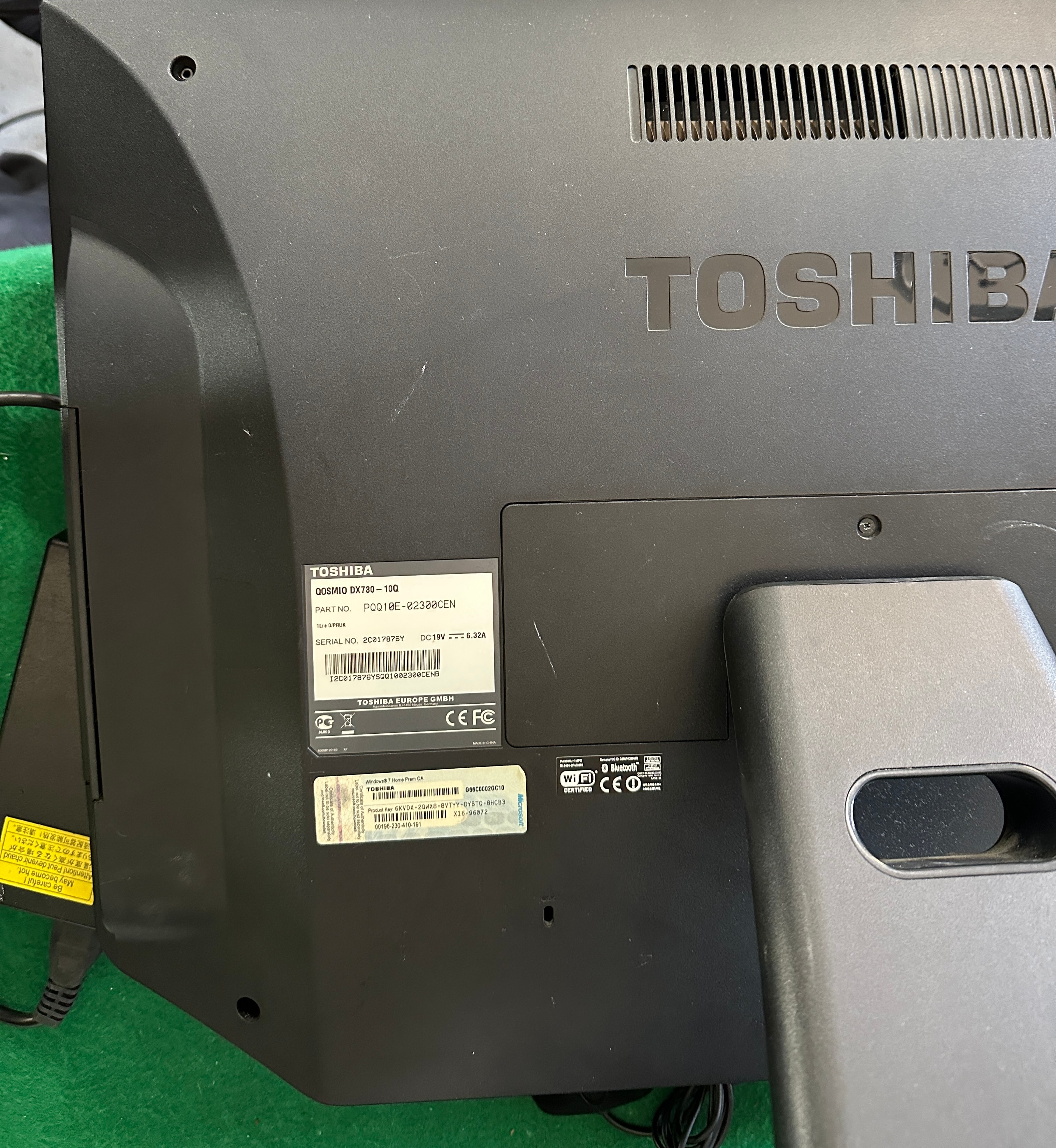 A Toshiba Qosmio DX730-10G all-in-one desktop computer, model PQQ1BE-02J002EN, serial number 8C017967W. The unit is primarily constructed from black plastic with a silver-colored metallic stand. The integrated screen’s front bezel is marked “Qosmio” and “TOSHIBA” and features stickers indicating “intel inside CORE i3”, “Windows 7”, “TOSHIBA FAST MEDIA”, and “ENERGY STAR” compliance. The reverse of the computer explicitly identifies the model and bears a Microsoft Windows product key sticker along with various regulatory markings (CE, FC). Accompanying the main unit are an HP-branded black plastic keyboard, a black wired optical mouse, and a black power adapter with a partial yellow caution label.