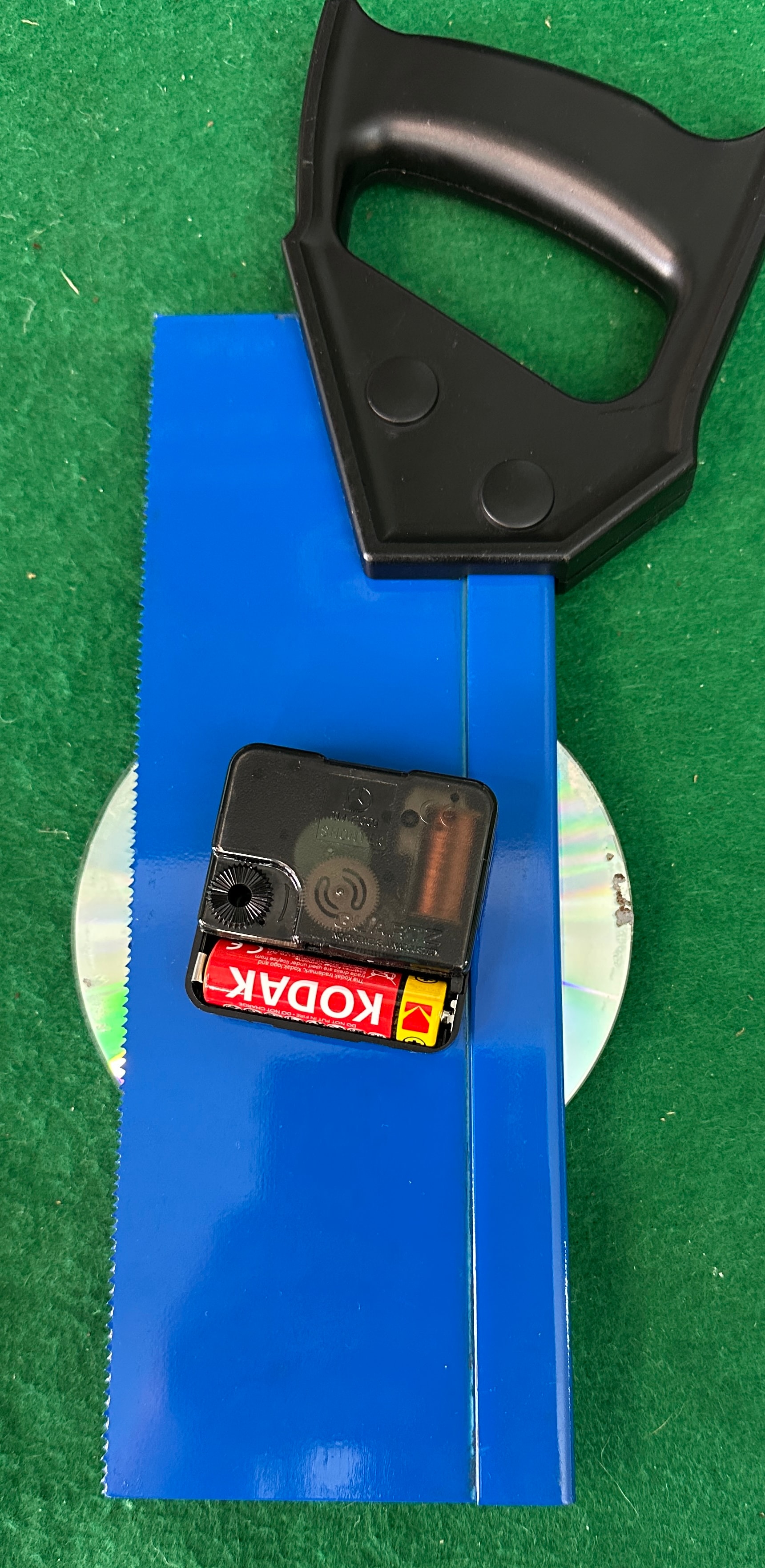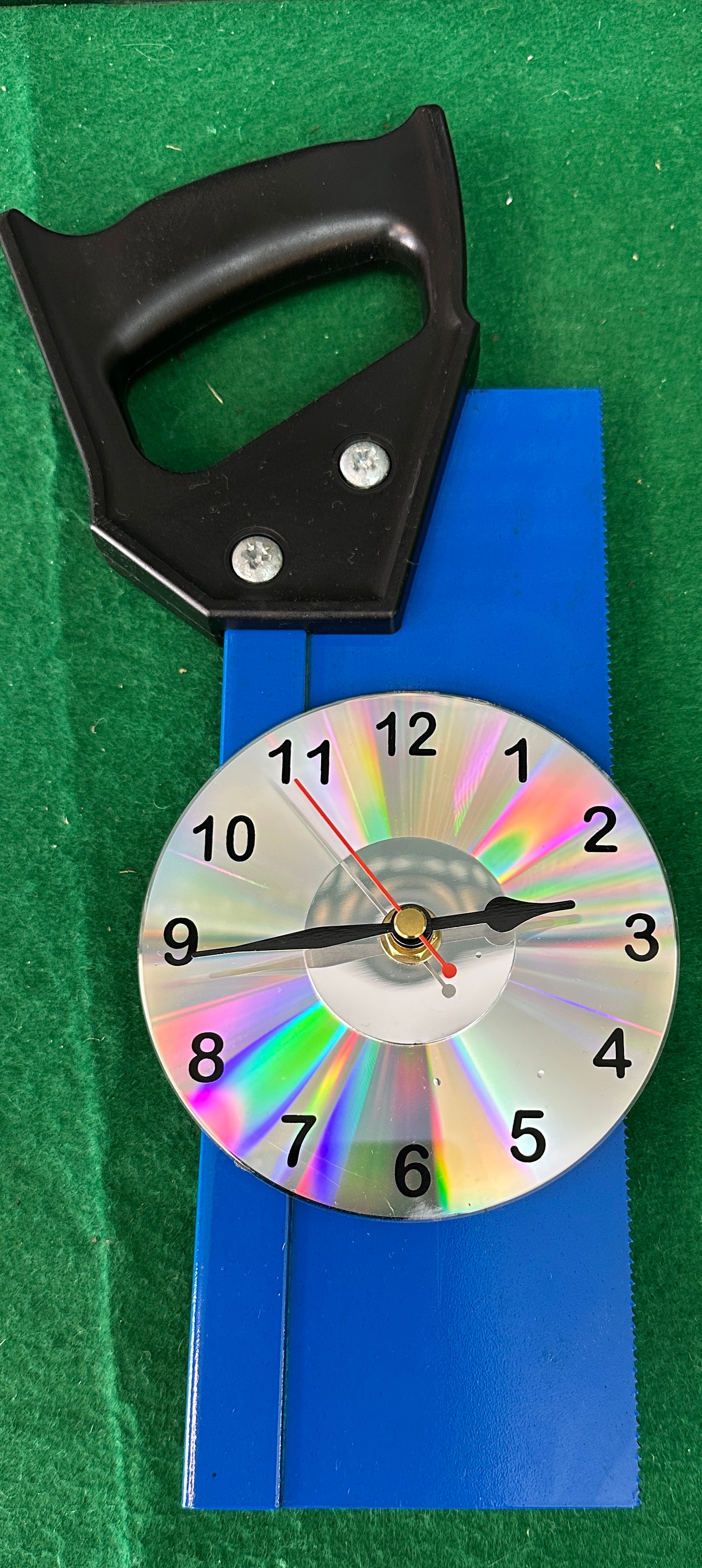 A contemporary novelty clock, featuring a compact disc (CD) as its face, displaying black Arabic numerals 1-12 with standard black hour/minute hands and a red second hand. The clock mechanism, a black plastic quartz movement, is powered by a visible ‘KODAK’ brand battery and is mounted onto what appears to be a blue-painted saw or large file blade, which incorporates a black plastic handle secured by two metal screws. This item represents a custom-made, upcycled craft.