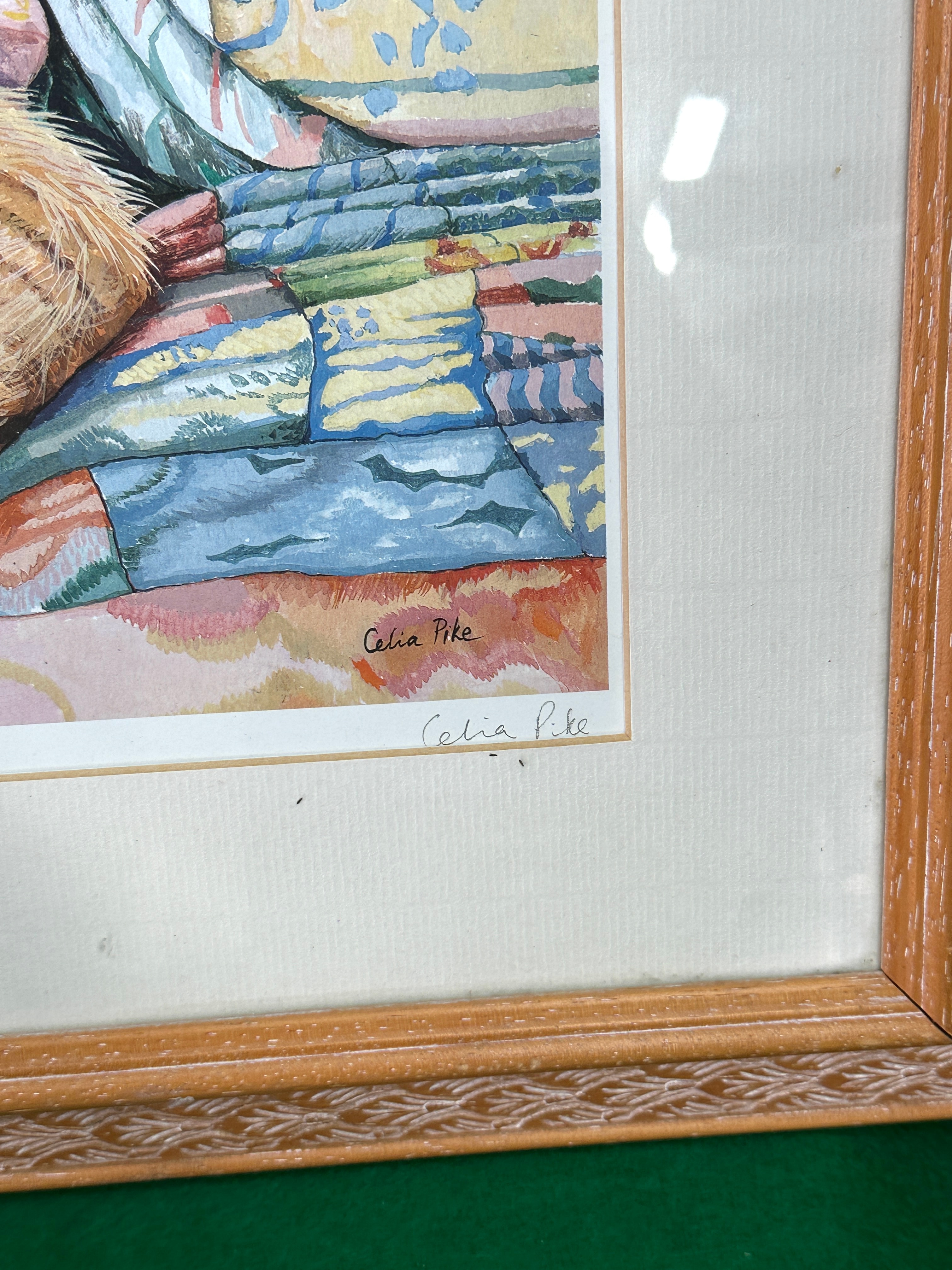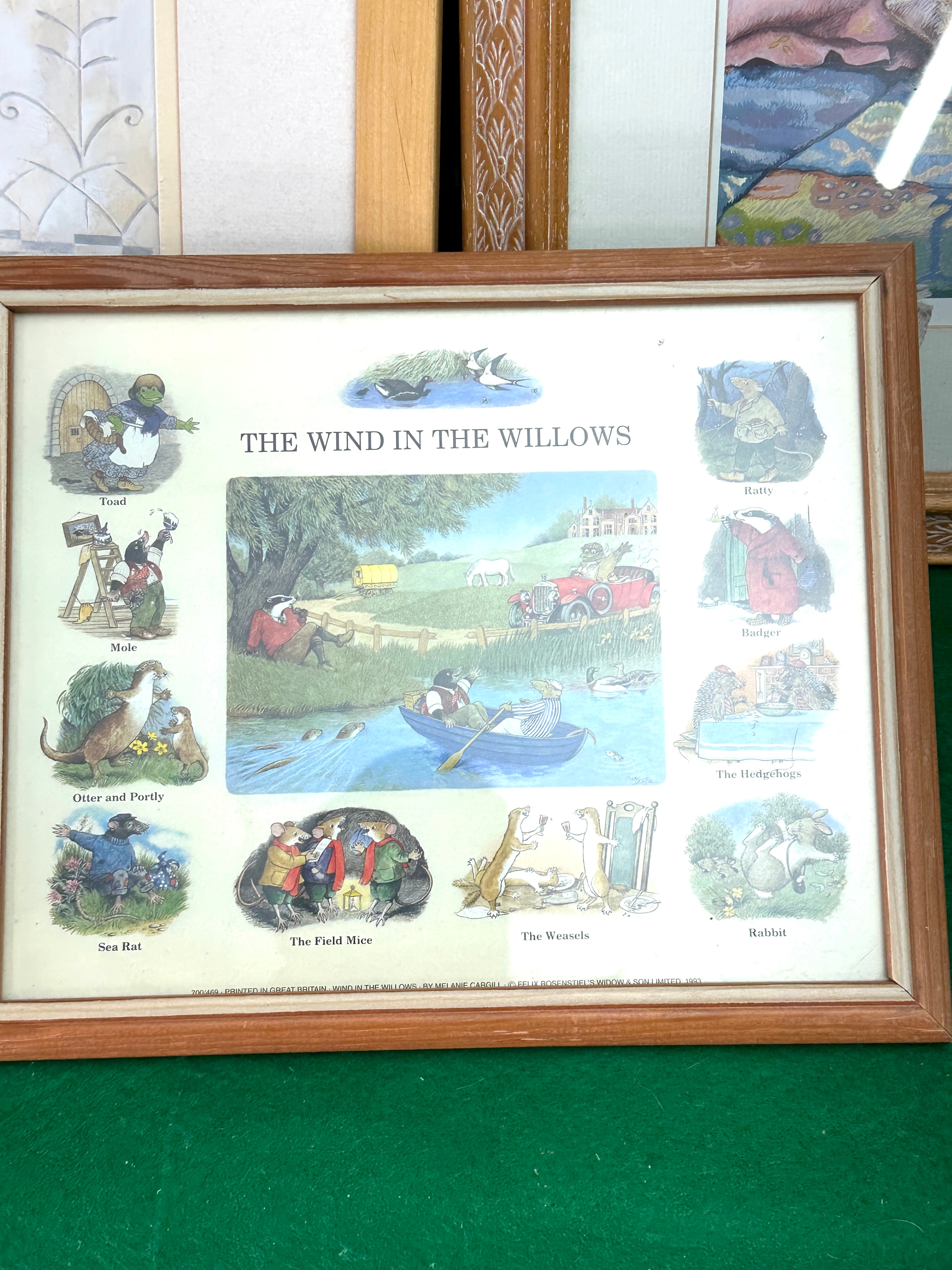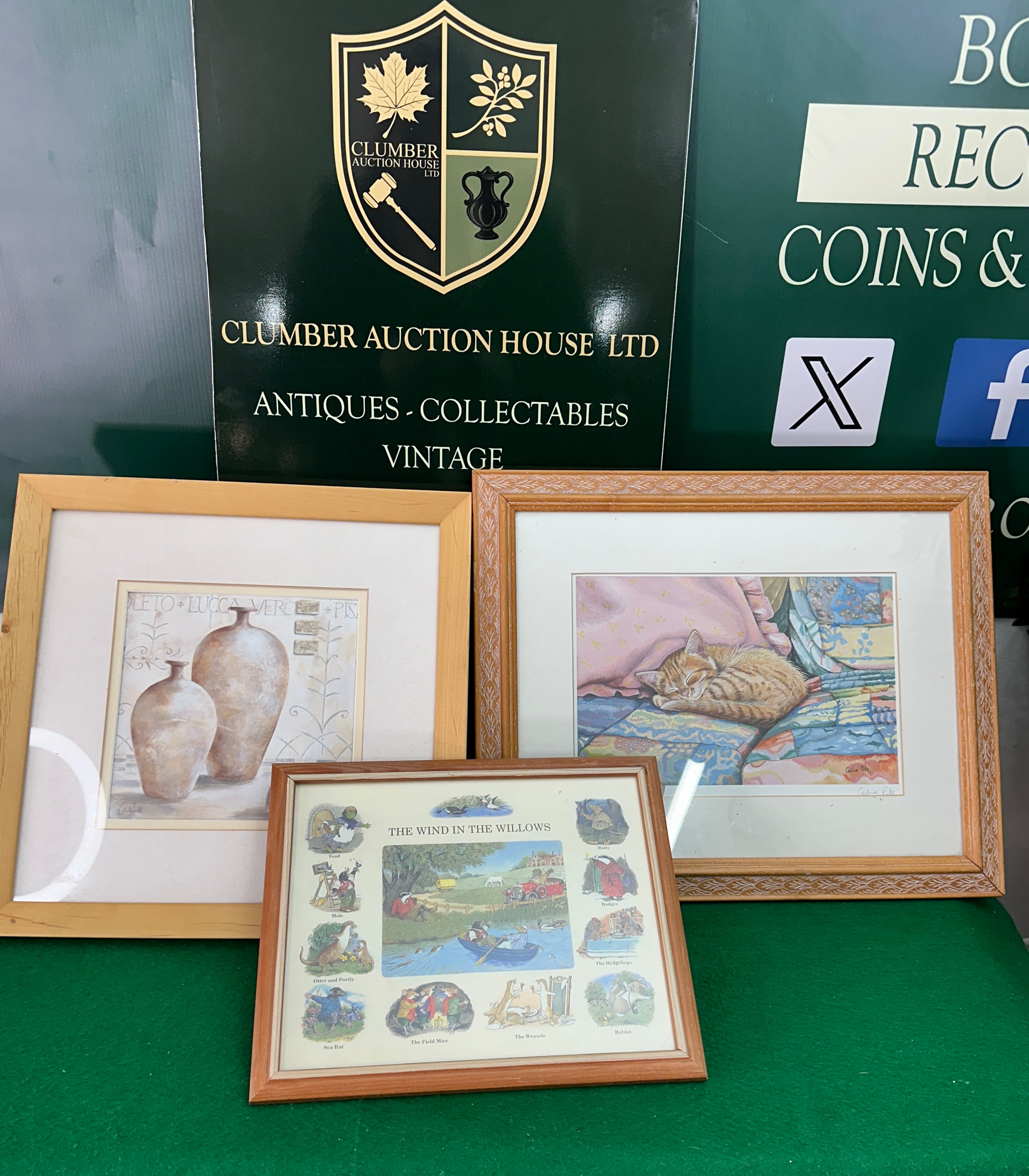 A group of three framed prints. The leftmost print, presented in a light wood-effect frame, features two amphora-like vessels in a decorative style with partially visible text “FLETO LUG VER PIS” above. Adjacent to it, a print depicting a sleeping ginger cat on a colorful patterned quilt is signed “Celia Pike” and housed in a darker, possibly carved wood frame. The third print, positioned in the foreground, illustrates characters and scenes from “THE WIND IN THE WILLOWS,” identifying figures such as “Toad,” “Mole,” and “Ratty.” This print’s lower margin contains a copyright notice, “SOUVENIR PRINTED IN GREAT BRITAIN – WIND IN THE WILLOWS – BY HELENE CARPENTER… PETER RABBIT AND FRIENDS LICENSING LTD. 1993,” and is presented in a smaller brown wood-effect frame. All prints are presented under glass.