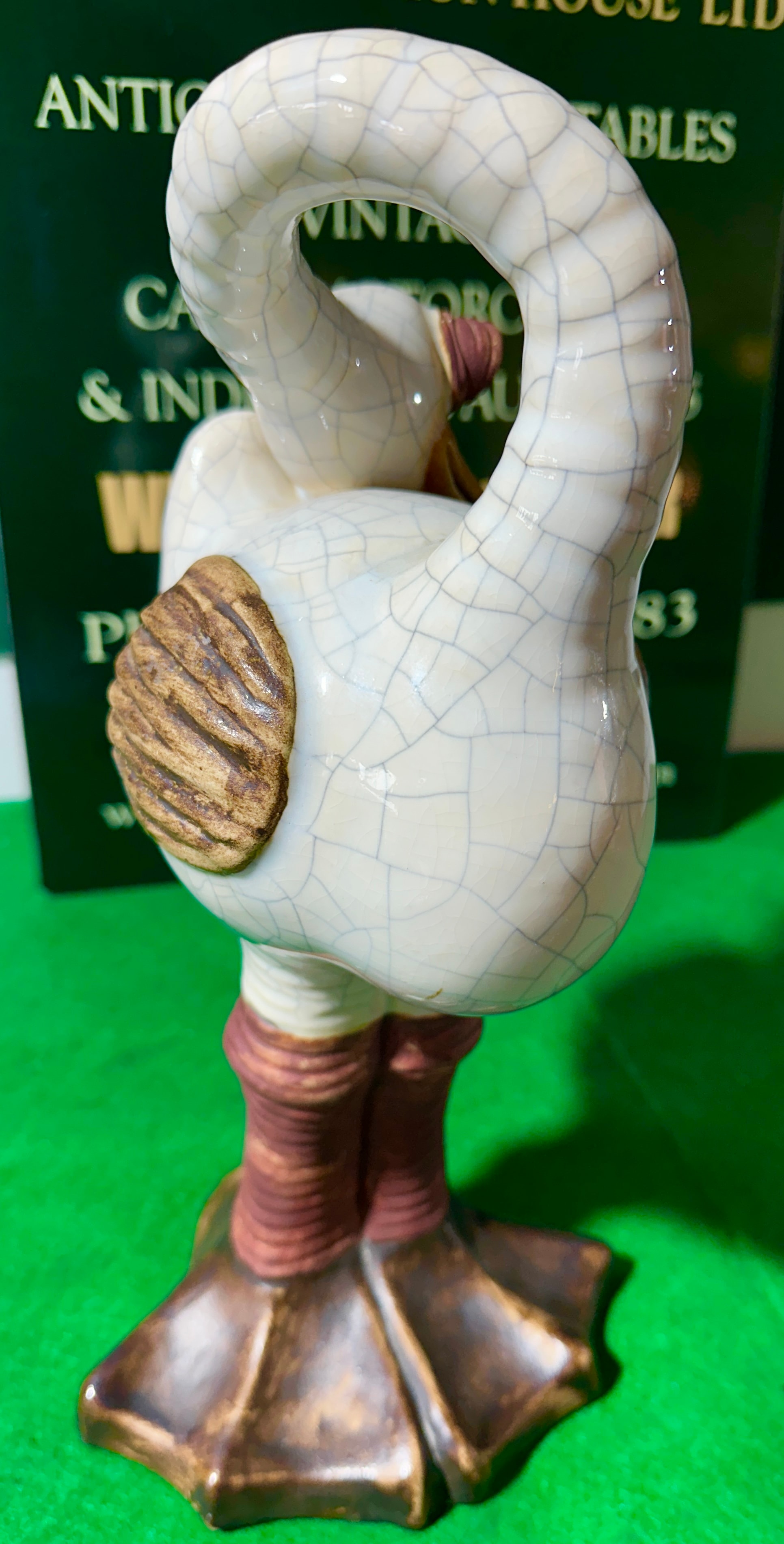 A Mid Size Ceramic Artistic ‘Super Fast Running Bird’ sculpture, depicting a stylized bird, likely a goose or duck. The object’s body is characterized by a prominent white crackle glaze. The beak, exaggerated brow-like elements, textured wing-like details, and webbed feet are rendered in contrasting brown tones, some exhibiting a subtle iridescent or metallic sheen. The bird features large, dark, globular eyes and an overall whimsical or decorative style. No manufacturer’s marks or artist signatures are visible on the object itself.