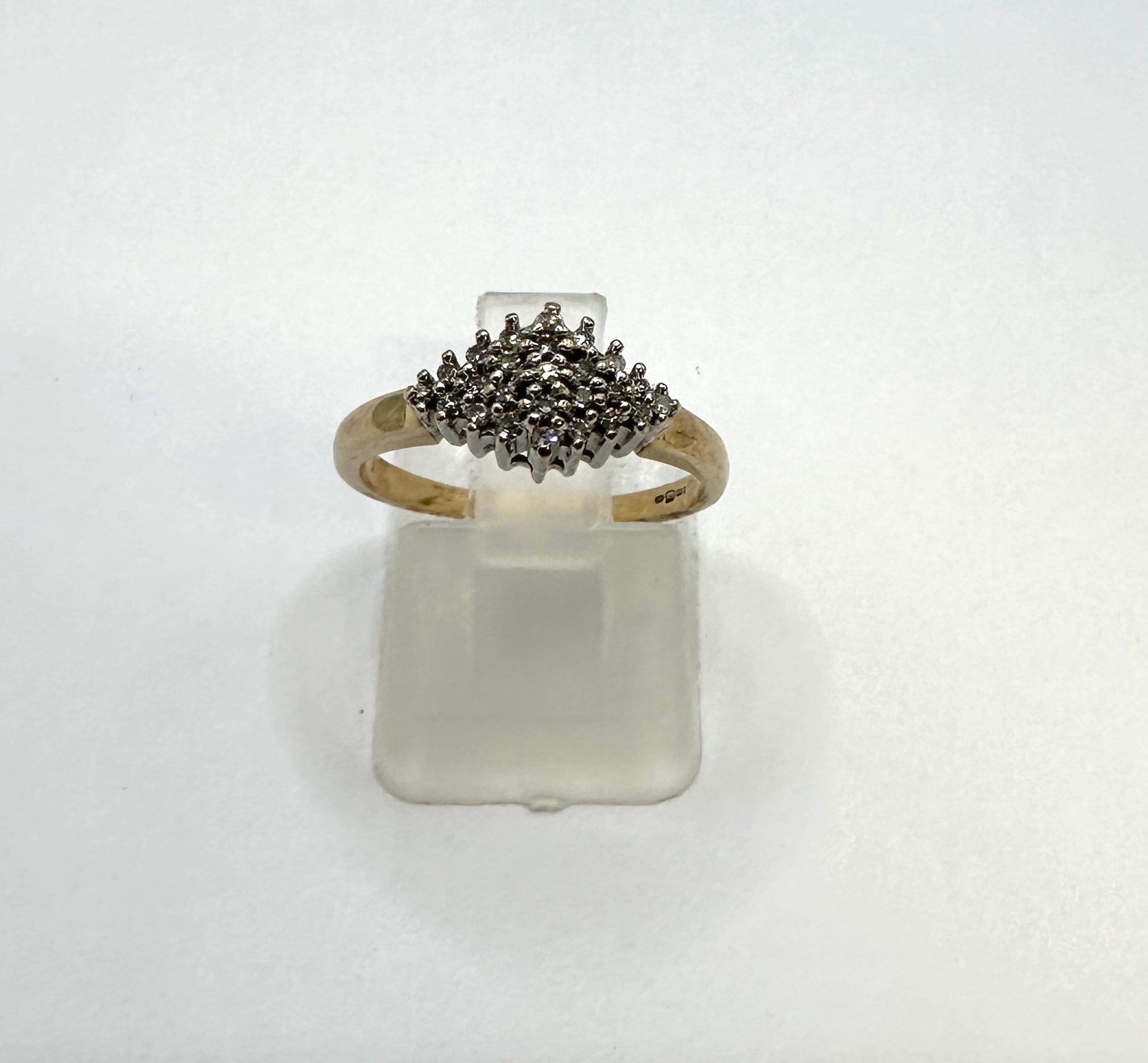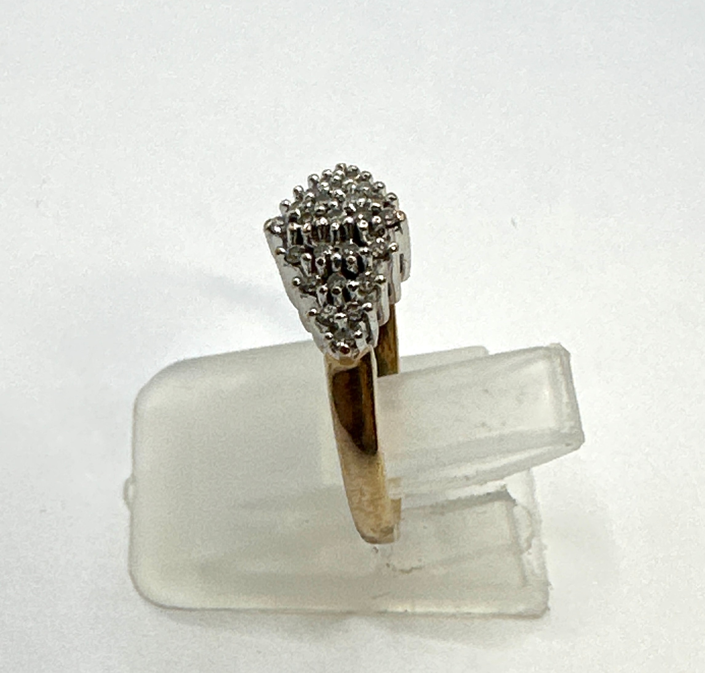A ladies’ 9k gold diamond cluster ring, featuring a gold-toned band with a prominent domed white metal setting, encrusted with numerous small, round diamonds. A faint, unidentifiable numeric mark is visible on the interior of the ring’s band.