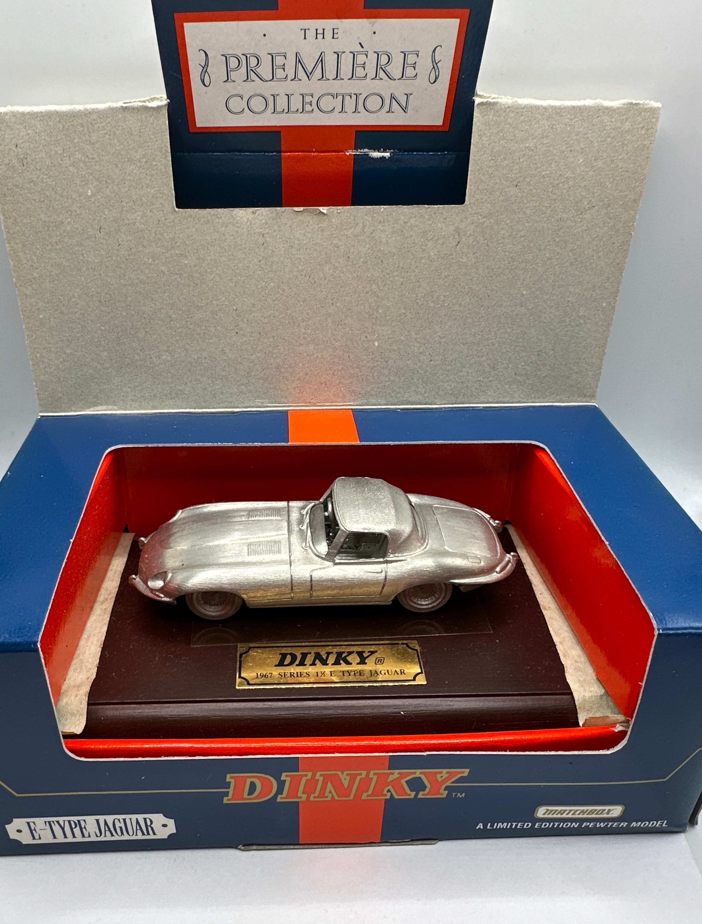 A Matchbox Dinky DY921 1967 Series 1½ E-Type Jaguar limited edition pewter model, presented in 1:43 scale. This silver-toned pewter model car is displayed on a dark wooden base featuring a gold-colored metal plaque inscribed with “DINKY ®” and “1967 SERIES 1½ E TYPE JAGUAR”. The item is housed within its original blue and red cardboard box, which carries text including “THE PREMIÈRE COLLECTION”, “DINKY TM”, “MATCHBOX”, “E-TYPE JAGUAR”, and “A LIMITED EDITION PEWTER MODEL”.