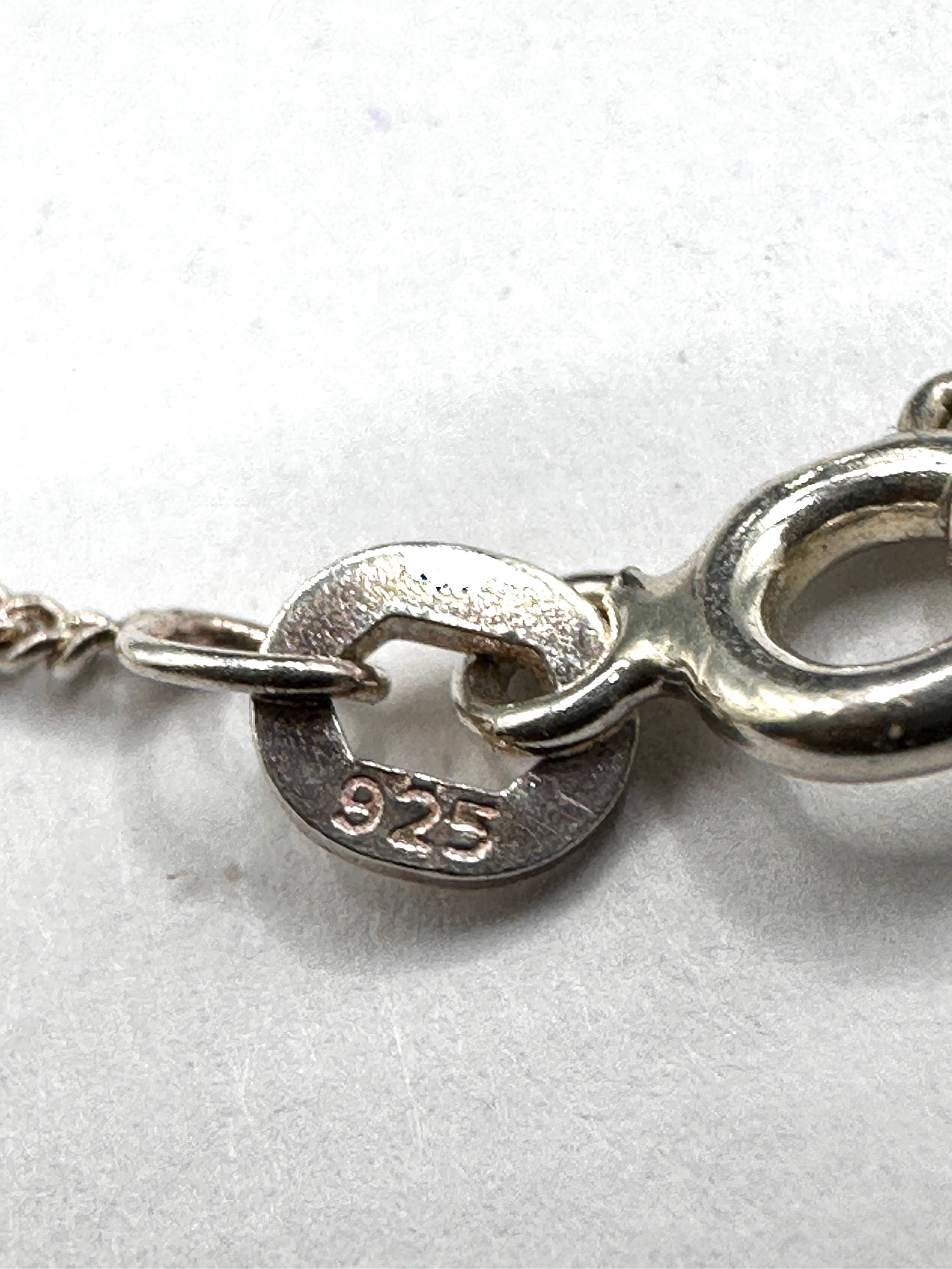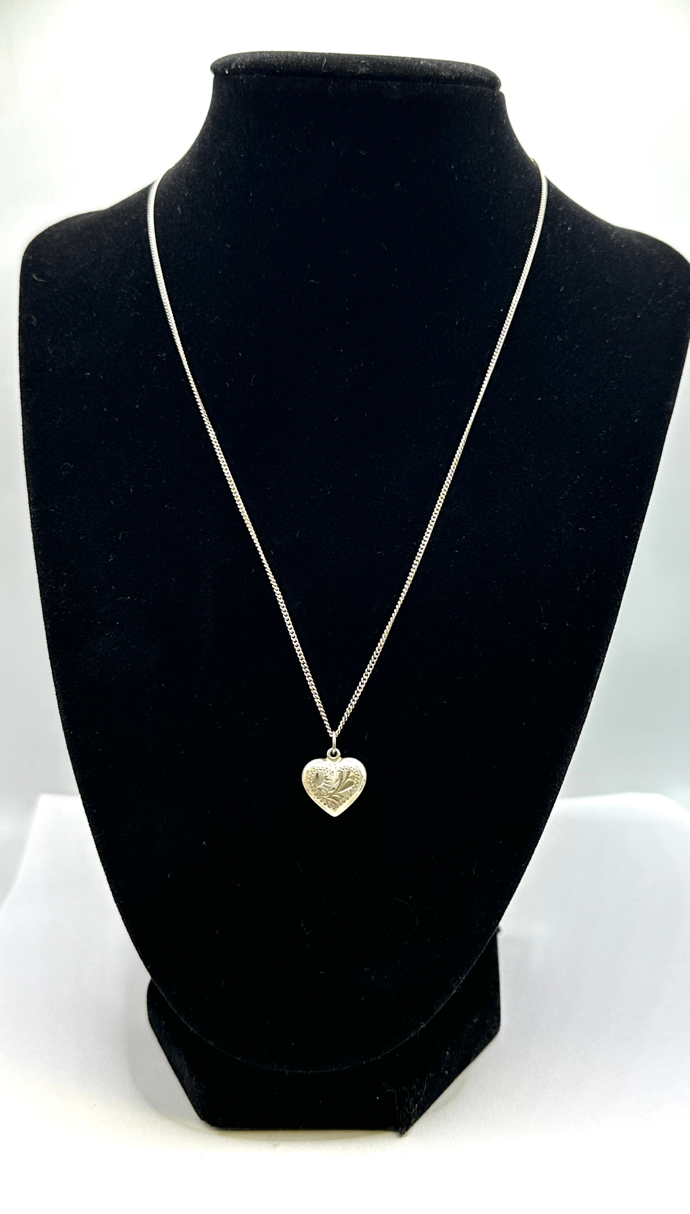 A vintage sterling silver heart locket necklace. The item’s materials are confirmed to be 925 silver. It features a delicate link chain and a heart-shaped locket pendant, with intricate floral or foliate engraving adorning the locket’s front surface. The necklace secures with a lobster claw clasp, which is connected to a jump ring clearly marked ‘925’.