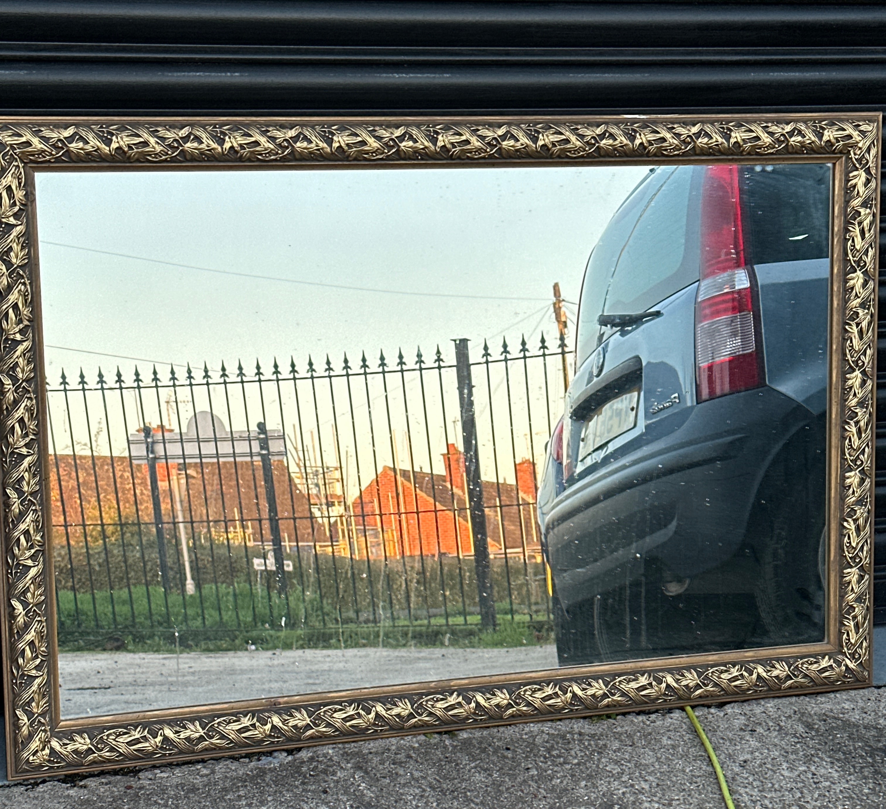 A large rectangular wall mirror, featuring an ornate, traditional-style frame. The inner decorative band of the frame exhibits a repeating foliate or vine motif with a gold or gilt-colored finish. The outer edge is a contrasting flat black. The frame material appears to be wood or a composite. The reflective surface is glass.