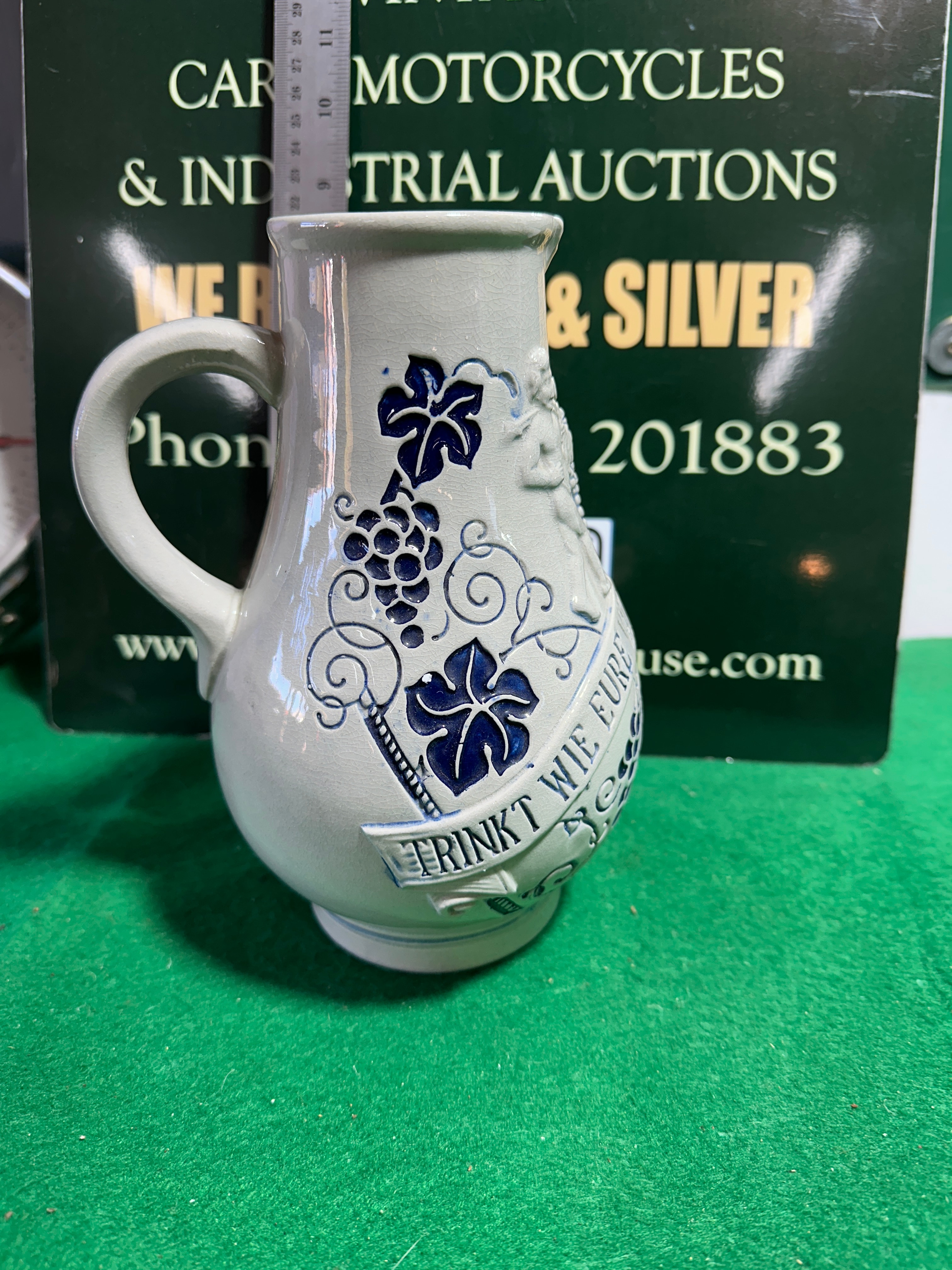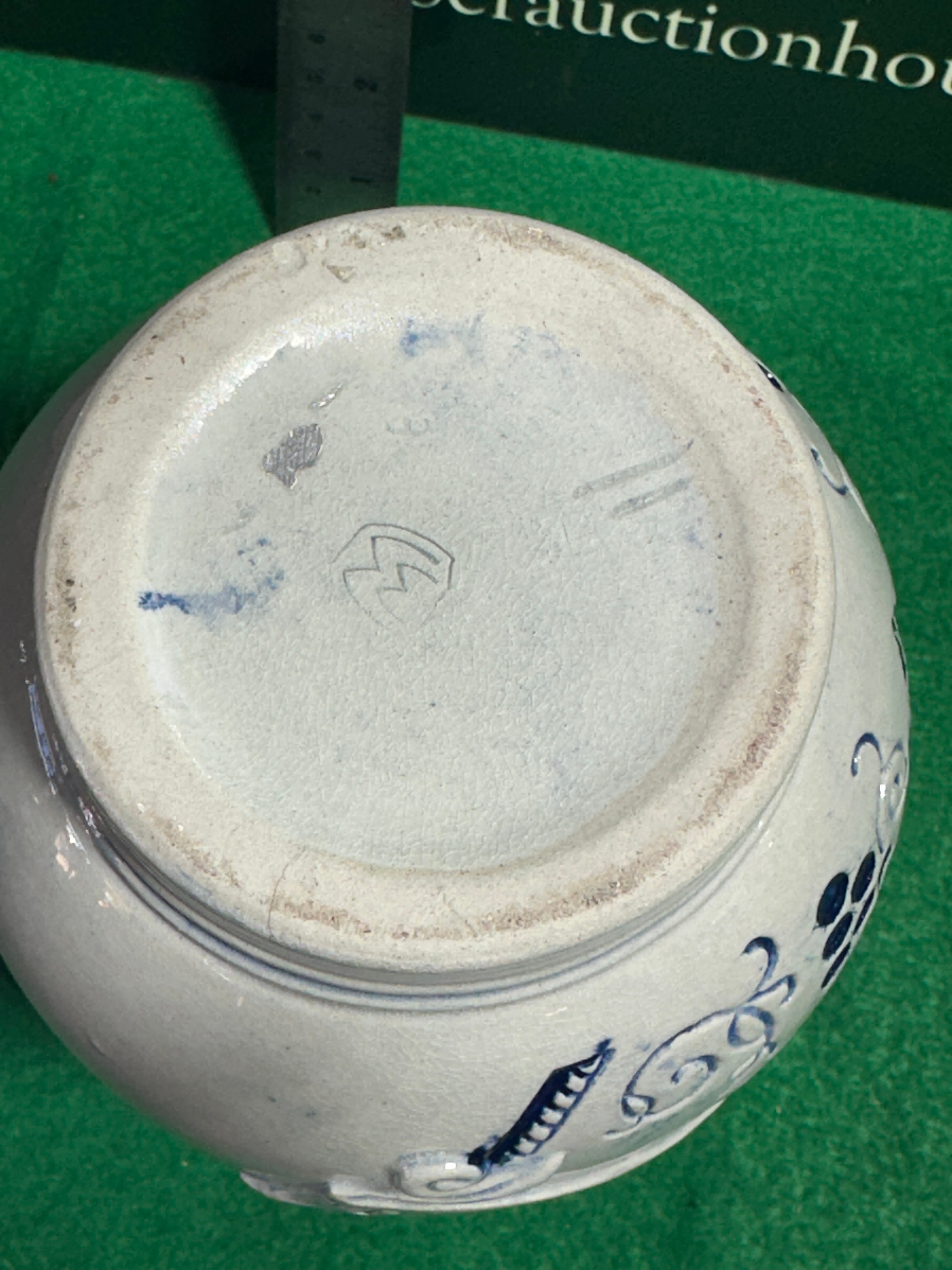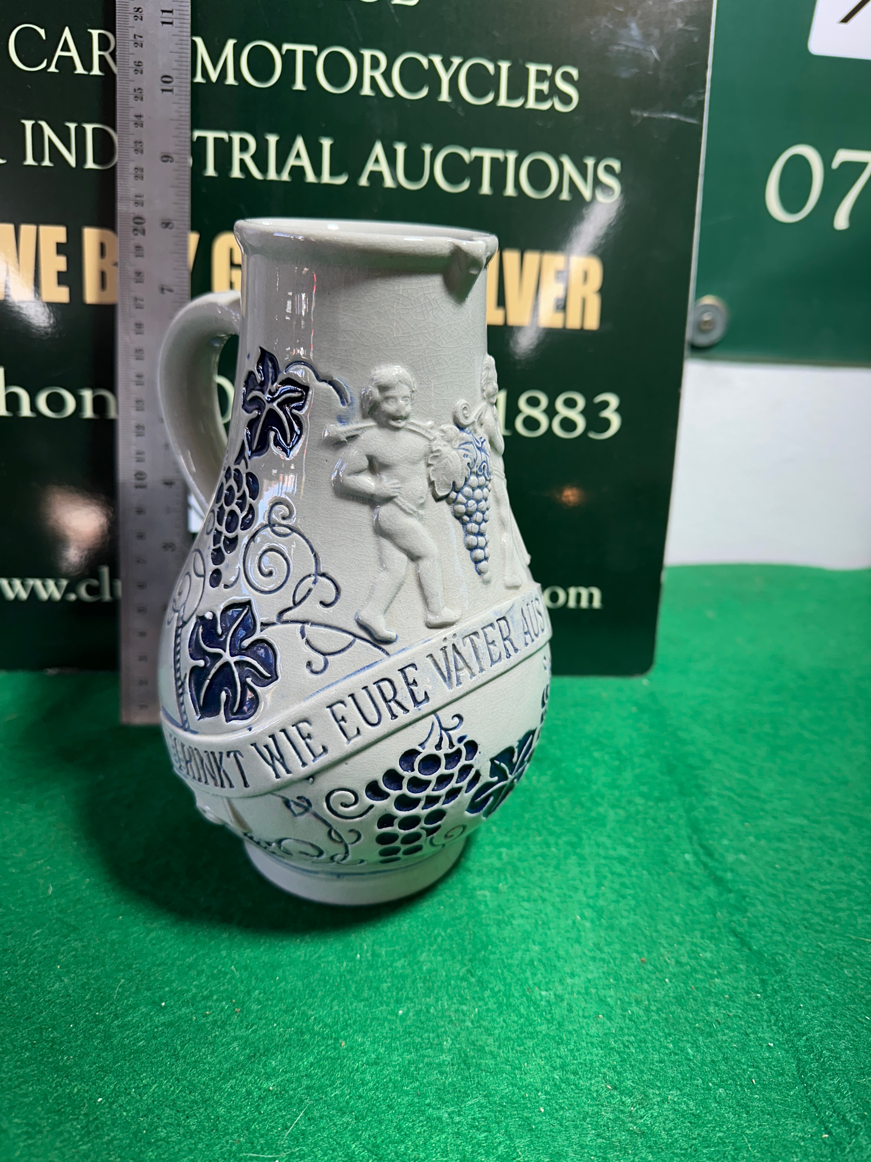 A Wick-Werke German salt-glazed stoneware wine pitcher. It features a traditional German style with a grey body and cobalt blue relief decoration. The ornamentation depicts grapevines and two putti-like figures, one holding a bunch of grapes. A raised band encircling the lower body prominently displays the German inscription ‘TRINKT WIE EURE VÄTER AUS,’ which translates to ‘DRINK AS YOUR FATHERS DID.’ The base exhibits a faint, stylized maker’s mark, possibly an ‘M’ or ‘W’.
