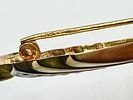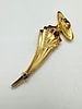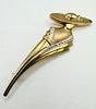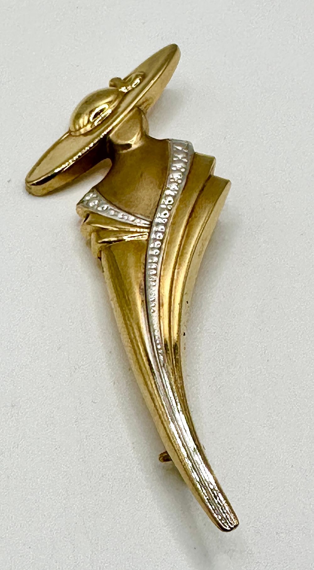 This stylized figurative brooch depicts an elegant woman in a wide-brimmed hat, crafted predominantly from yellow-toned 9k gold. The figure features contrasting white-toned 9k gold accents along the neckline and flowing down the side, which are set with small, round colorless stones. The aesthetic reflects a mid-to-late 20th-century style with flowing lines. On the reverse, the pin stem is visibly marked “14K,” however, the item’s materials are confirmed to be 9k gold. An indistinct maker’s mark is also present.