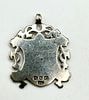 An antique 925 silver and gold shield fob pendant. This ornate bimetallic pendant or fob is designed in the style of an escutcheon or shield, with a bail for suspension. The outer frame is crafted from 925 silver, exhibiting elaborate scrolling foliate or strapwork decoration. It frames a central shield, which is gold, engraved with the initials “N.S.F.A.” and diagonal line patterns. The overall aesthetic suggests a late Victorian, Edwardian, or early 20th-century period. On the reverse, multiple hallmarks are visible, indicating the material is 925 silver and providing further contextual information.