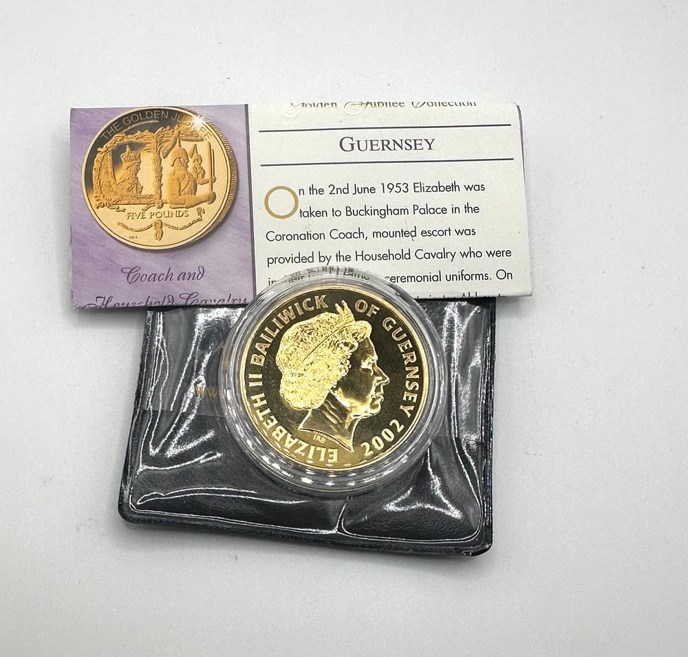 A 2002 Guernsey Queen Elizabeth II Golden Jubilee Five Pounds Proof Coin. The coin’s obverse displays a profile portrait of Queen Elizabeth II, encircled by the inscription “ELIZABETH II BAILIWICK OF GUERNSEY 2002” and the engraver’s initials “IRB.” The reverse, as depicted on the accompanying card, features the Coronation Coach and Household Cavalry, with the denomination “FIVE POUNDS.” The coin is presented in a clear protective capsule within a black, soft-sided plastic or leatherette case. It is accompanied by a descriptive card, part of “THE GOLDEN JUBILEE COLLECTION,” detailing the Coronation Coach and Household Cavalry on June 2nd, 1953. The coin visually appears gold-toned.