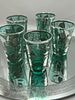 A set of six small, footless drinking glasses. Each is crafted from translucent teal-to-emerald green glass, featuring an ornate, silver-toned metallic decoration of intertwining floral and foliage motifs. The glasses are finished with a matching silver-toned rim.