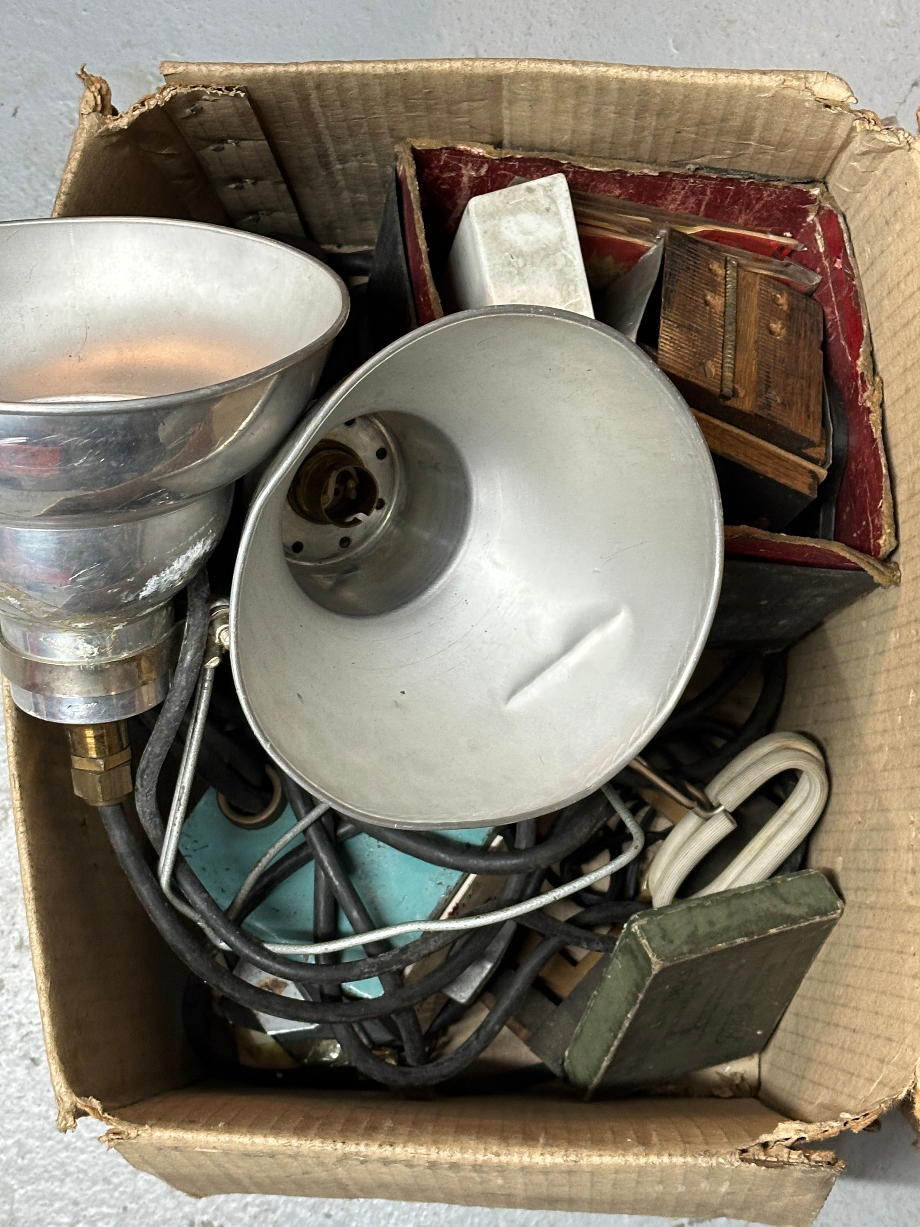 A Vintage Acme-Lite Senior Litepak Lighting Kit, presented in a cardboard box containing an assortment of vintage photographic or lighting equipment and related ephemera. The lot includes two aluminum or light-metal parabolic reflectors, one featuring a brass threaded base, and both equipped with Edison screw-type bulb sockets. A tangled mass of electrical wiring, including older black rubber-insulated and white fabric-wrapped cords, is also present. Among other items visible are several distressed books or boxes with red and dark wood coverings, a plain white rectangular block, and a dark green object.