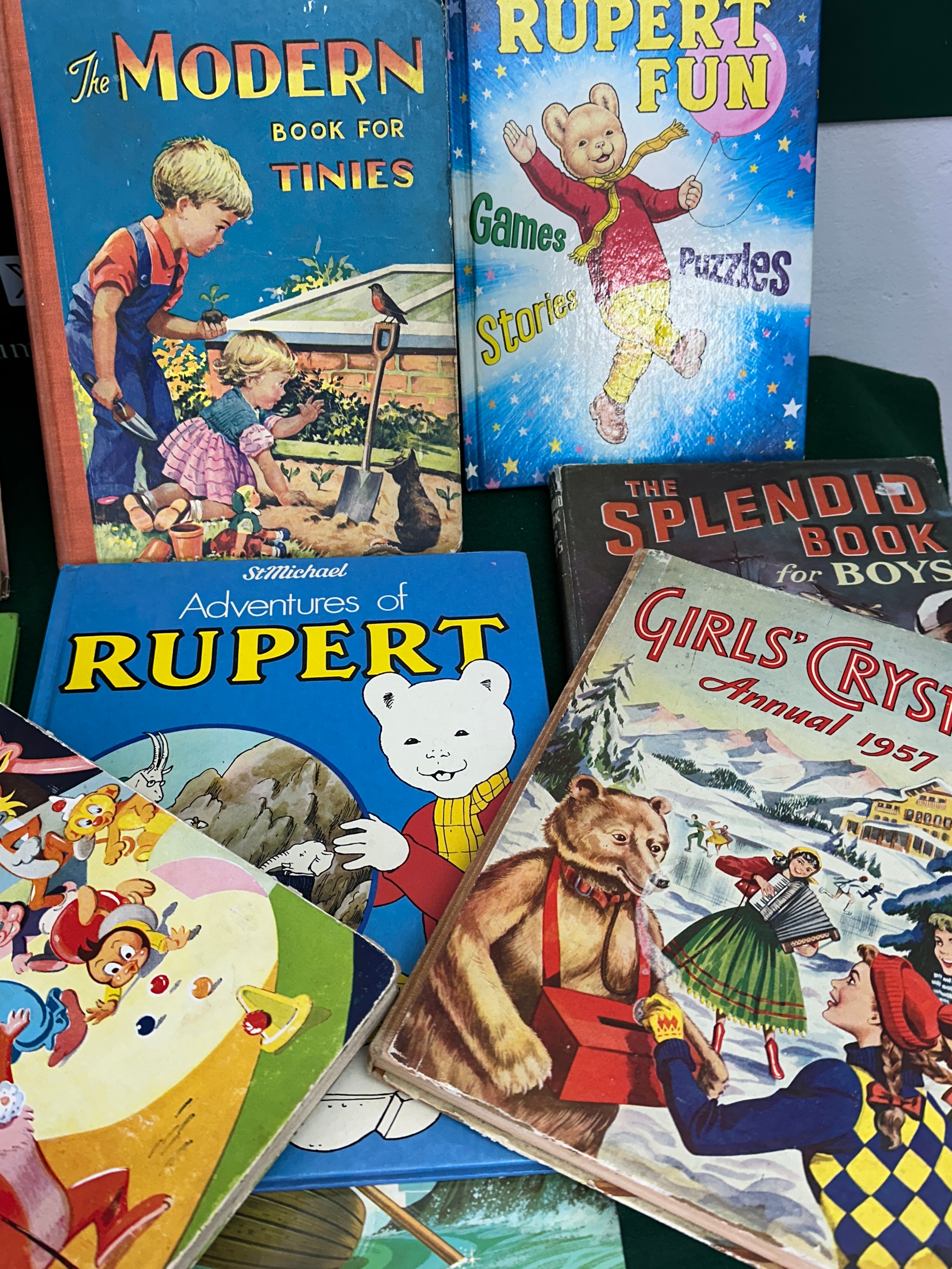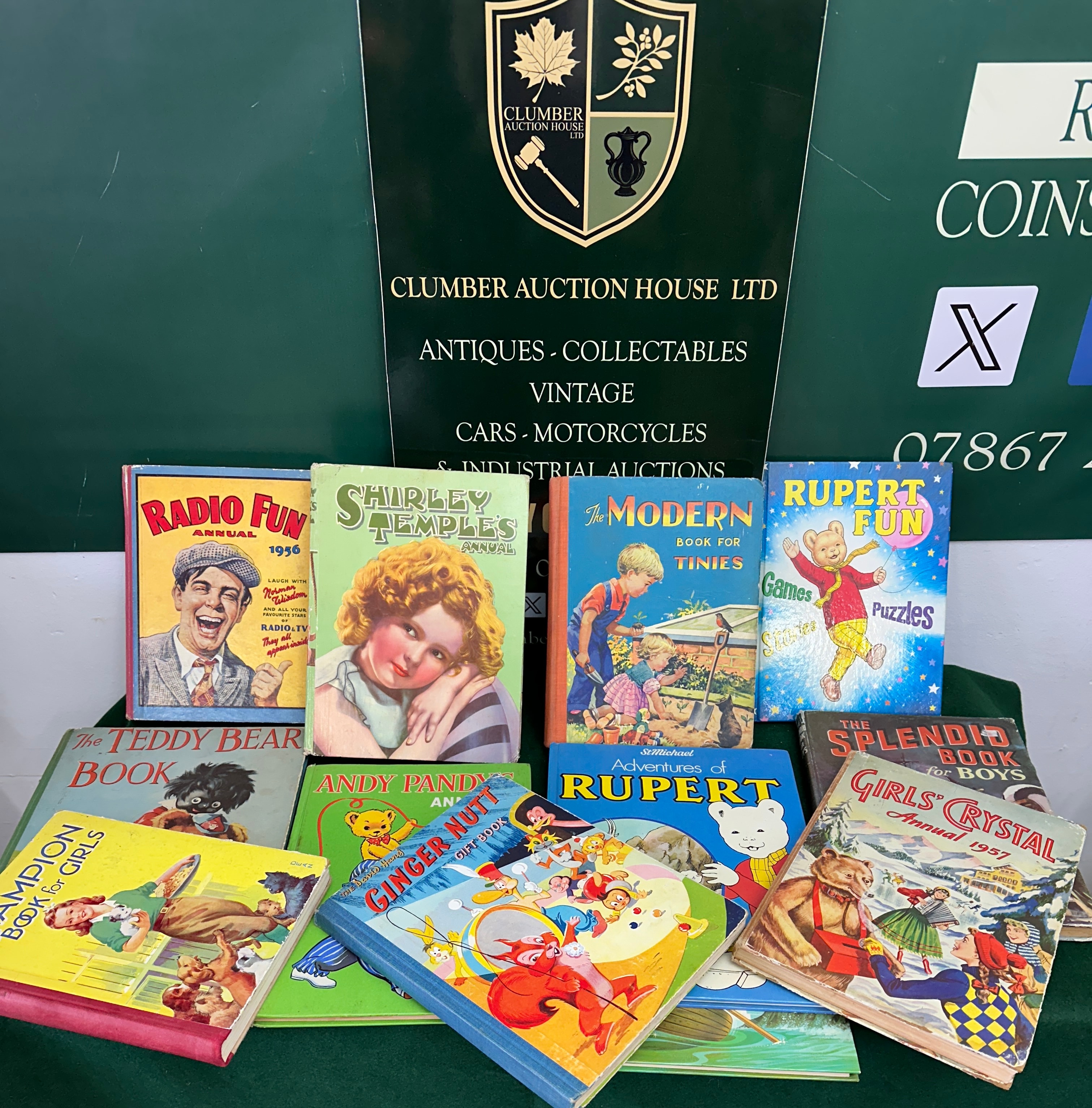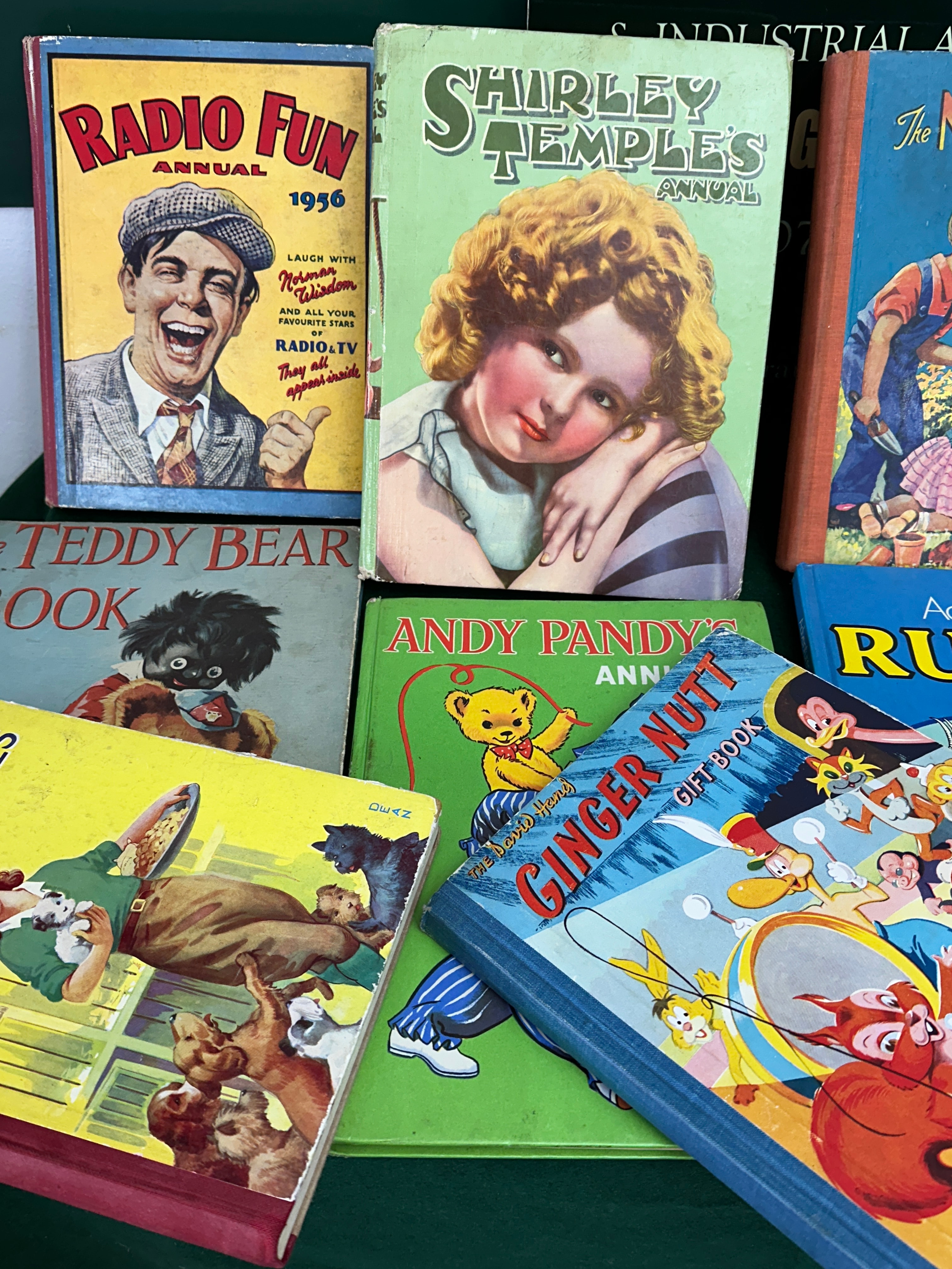 A collection of twelve vintage hardcover children’s annuals and storybooks, primarily dating to the mid-20th century, with visible publication dates of 1956 and 1957. Titles include ‘RADIO FUN ANNUAL 1956’, ‘SHIRLEY TEMPLES ANNUAL’, ‘THE MODERN BOOK for TINIES’, ‘RUPERT FUN’, ‘THE TEDDY BEAR BOOK’, ‘ANDY PANDY ANNUAL’, ‘WE AND HANDY PADDY AND GINGER NUTT GIFT BOOK’, ‘Adventures of RUPERT’, ‘THE SPLENDID BOOK for BOYS’, and ‘GIRLS CRYSTAL Annual 1957’. These books feature colorful, pictorial covers depicting various illustrated characters and real-life figures, such as Norman Wisdom and Shirley Temple, indicative of popular culture from the period.