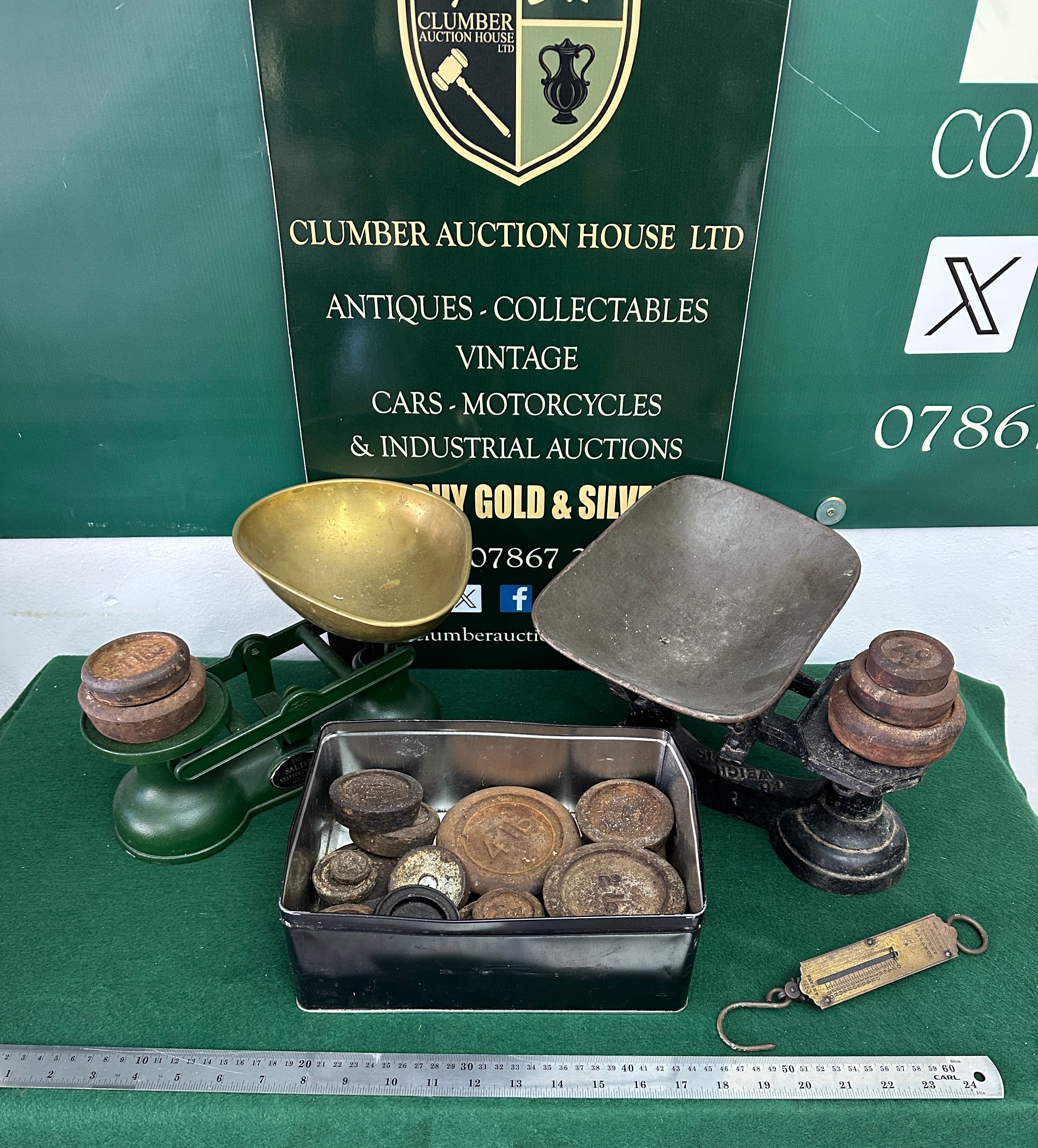 A collection of vintage domestic and commercial weighing equipment, featuring a Salter Staffordshire cast iron counter-top scale. This scale has a dark green painted cast iron body with a tarnished brass pan, bearing partial manufacturer markings such as ‘THE SALTER STAFFORD,’ and is accompanied by several rusted iron weights, including those marked ‘2 LB’ and ‘1 LB.’ Also included is a second counter-top scale, black painted cast iron with a dark, patinated metal pan, accompanied by its own stack of rusted iron weights, with visible markings like ‘5 LB’ and ‘2 LB.’ A black rectangular tin contains a varied assortment of additional round, heavily rusted iron weights, some distinctly marked ‘4 LB,’ ‘2 LB,’ and ‘1 LB.’ The collection is completed by a brass-bodied hand-held spring balance, marked ‘IMPROVED BALANCE’ and ‘PATENT,’ complete with a graduated scale and a metal hook.